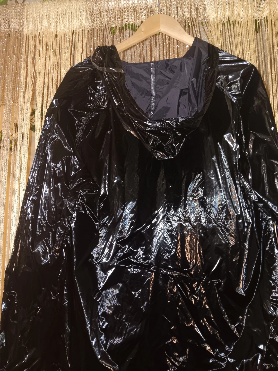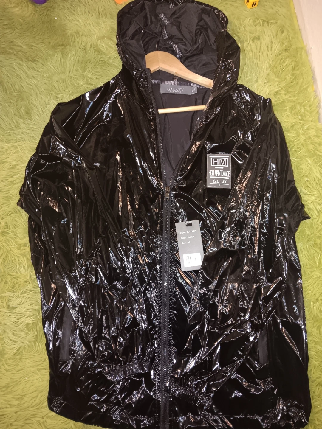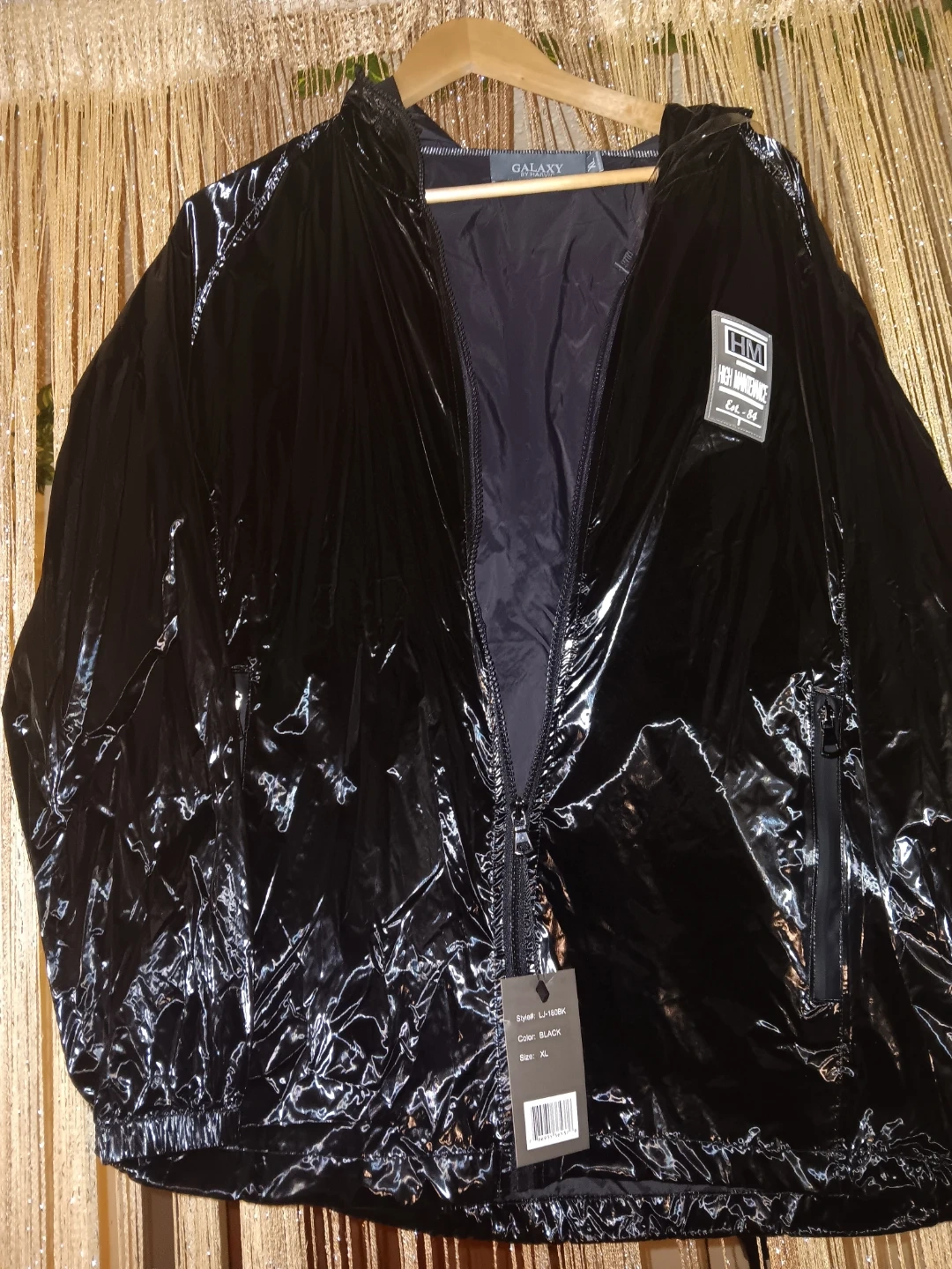 Shiny black jacket by Galaxy by Harvic. Features a hooded design and a full zip closure. Size XL. Material is a vinyl-like finish.