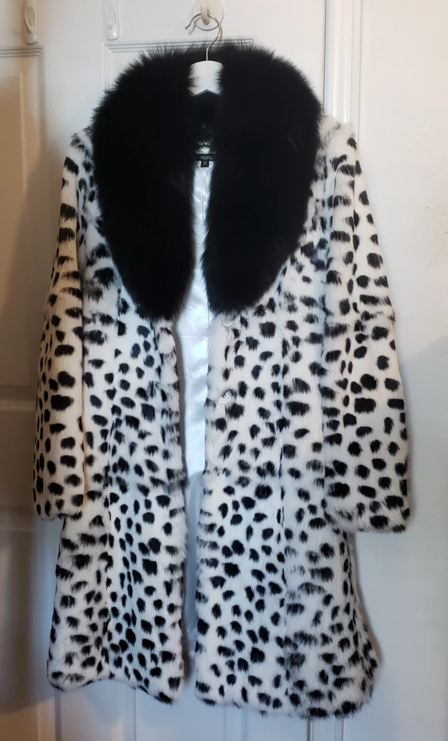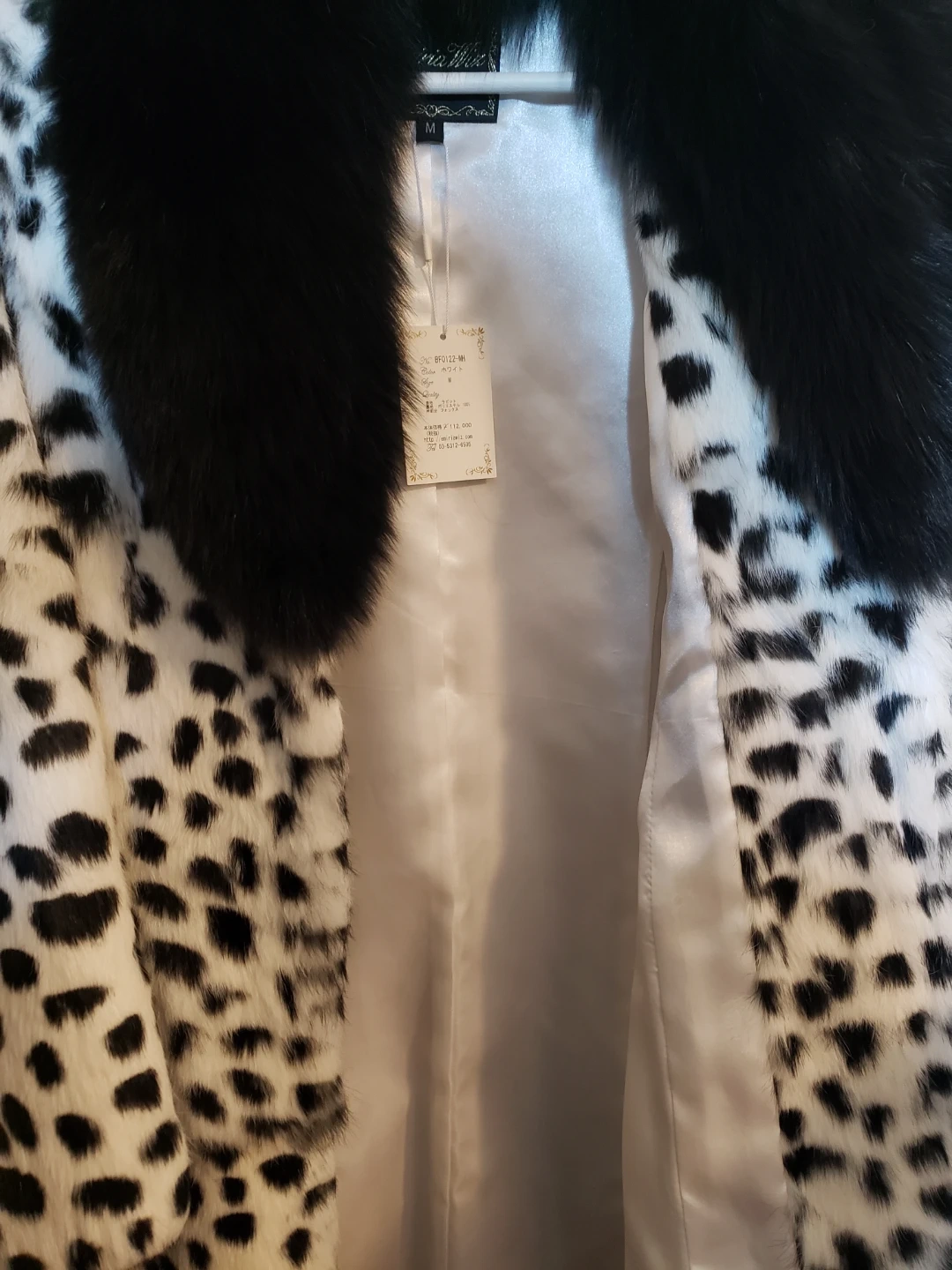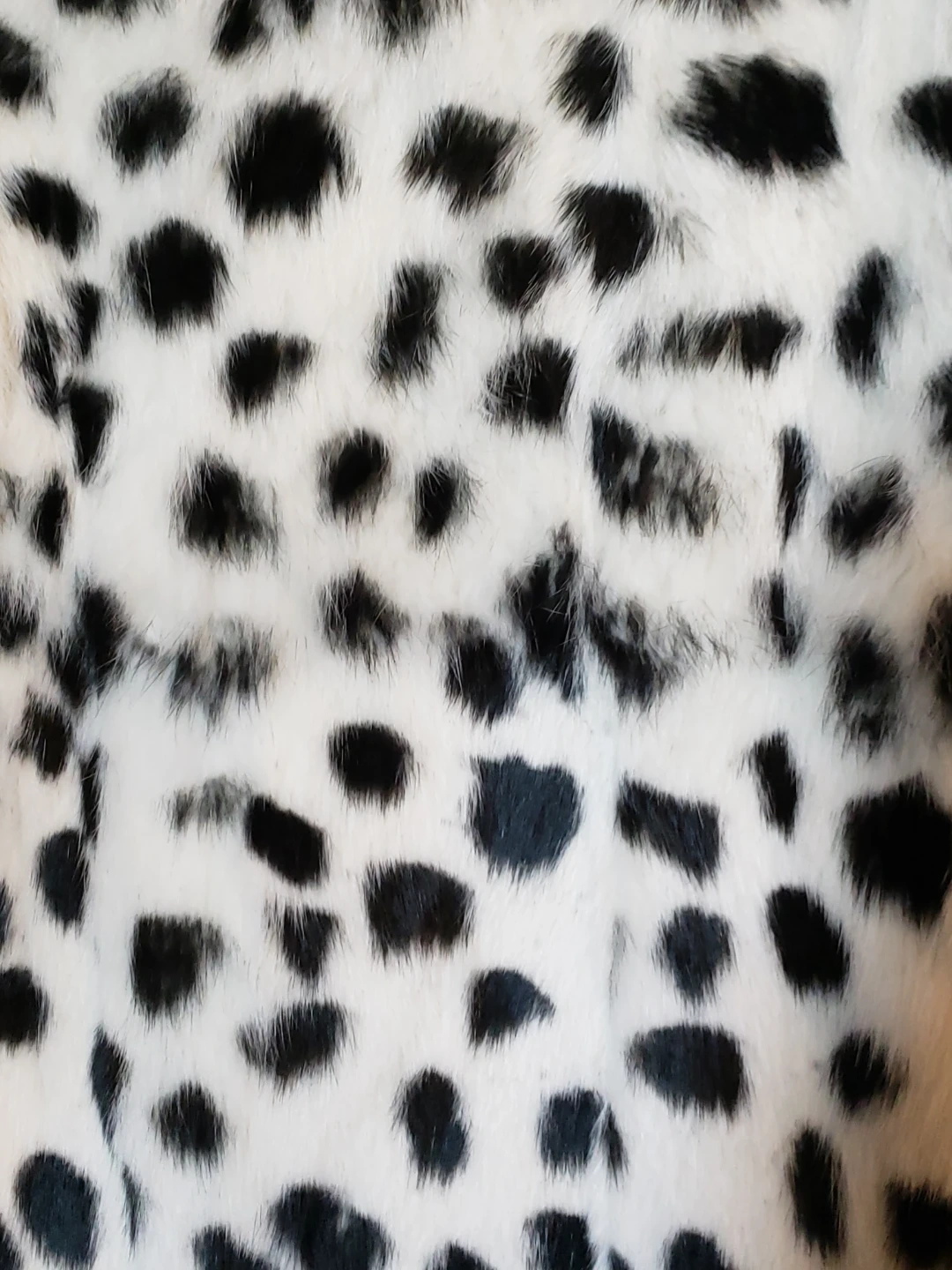 the inside lining is 100% polyester, the dalmation print coat is rabbit fur and the collar is fox fur, extremely soft. the silhouette once buttoned is gorgeous, it has magnetic closure.