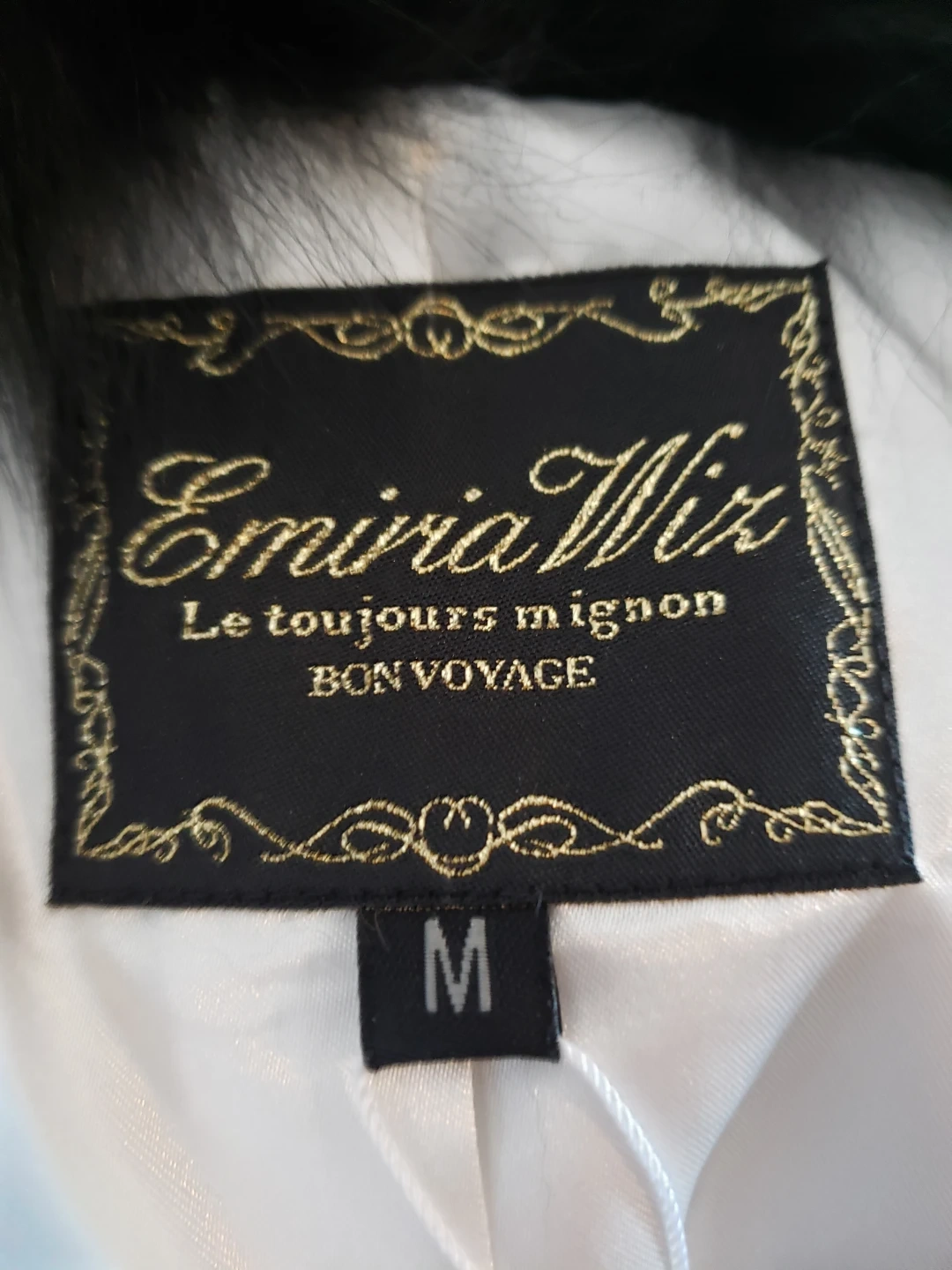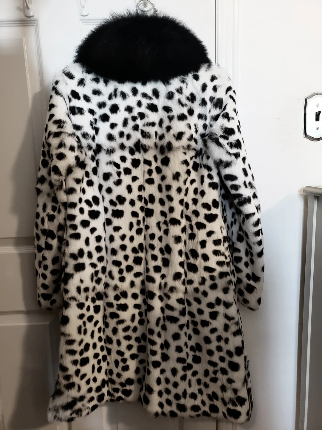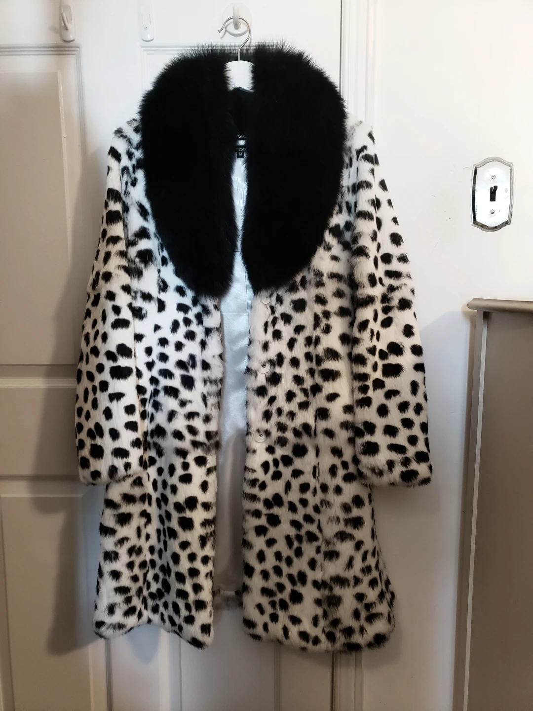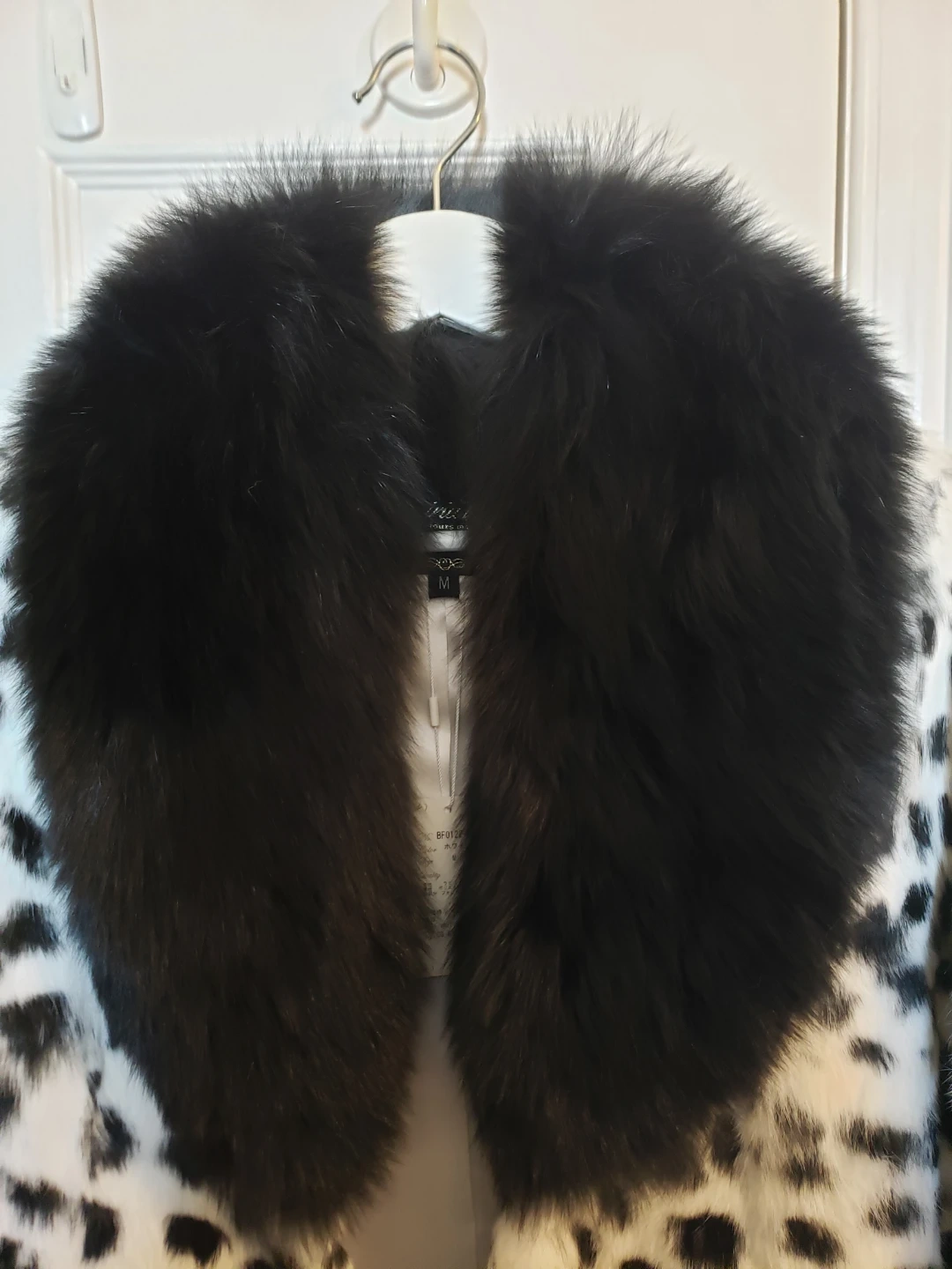 the inside lining is 100% polyester, the dalmation print coat is rabbit fur and the collar is fox fur, extremely soft. the silhouette once buttoned is gorgeous, it has magnetic closure.