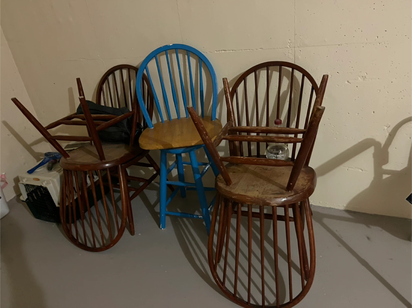 Three light wood grain table tops are available. Also includes four wooden chairs, one of which is painted bright blue. All chairs have a spindle back design. Chairs are sturdy and ready for use.