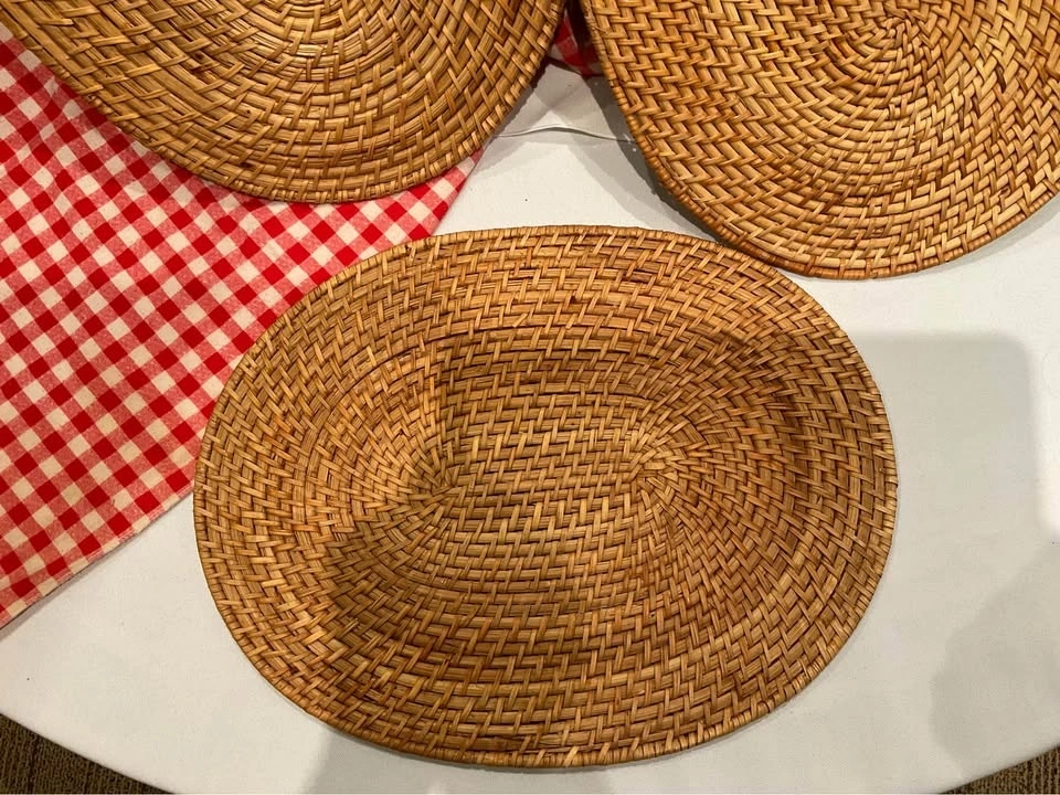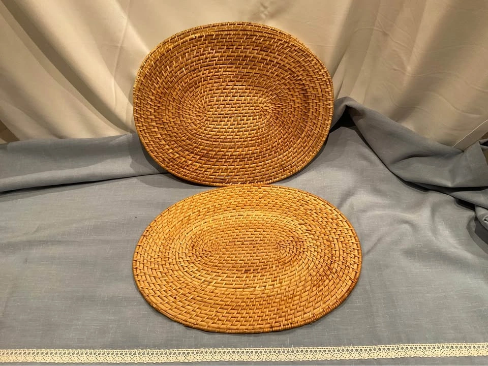 Natural woven rattan placemats. Oval shape, 15” x 11 1/2”. Very sturdy and on trend! From a smoke & pet free home. Great condition. Located in Richmond Hill at Bathurst & King Rd.