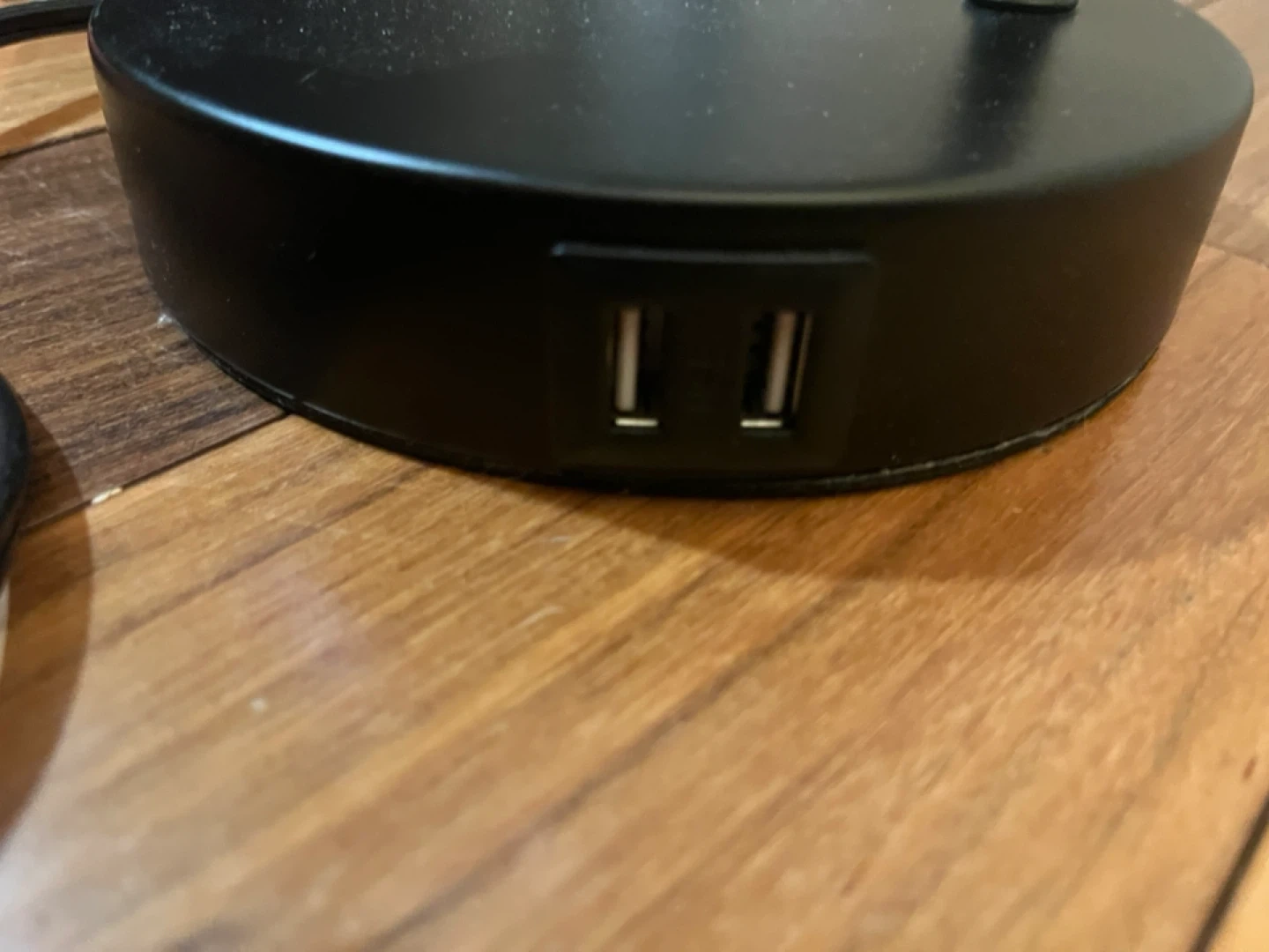 A sleek black metal table lamp featuring a clear glass shade. It comes with two convenient USB ports on its base for charging devices, as well as an outlet to charge other devices.