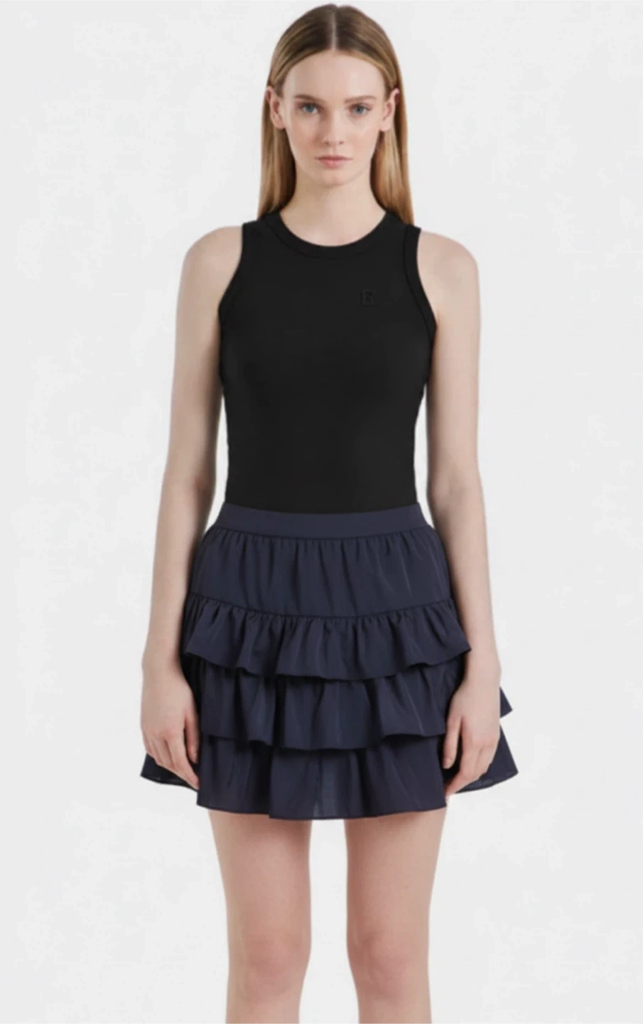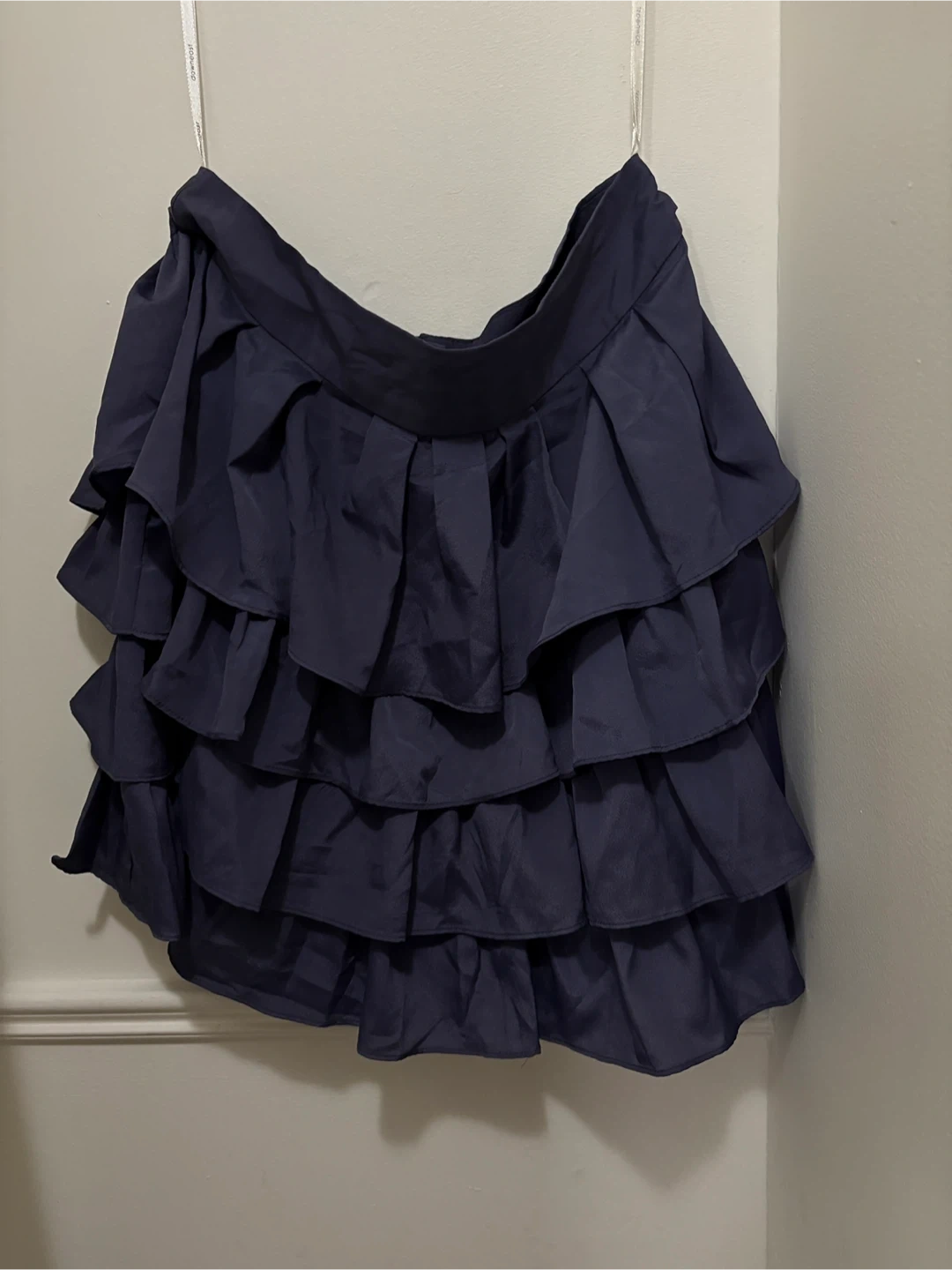 This is a Downeast Basics skirt in a beautiful navy blue colour. It features a fun ruffled design and is a size medium. It's perfect for adding a bit of flair to your wardrobe!