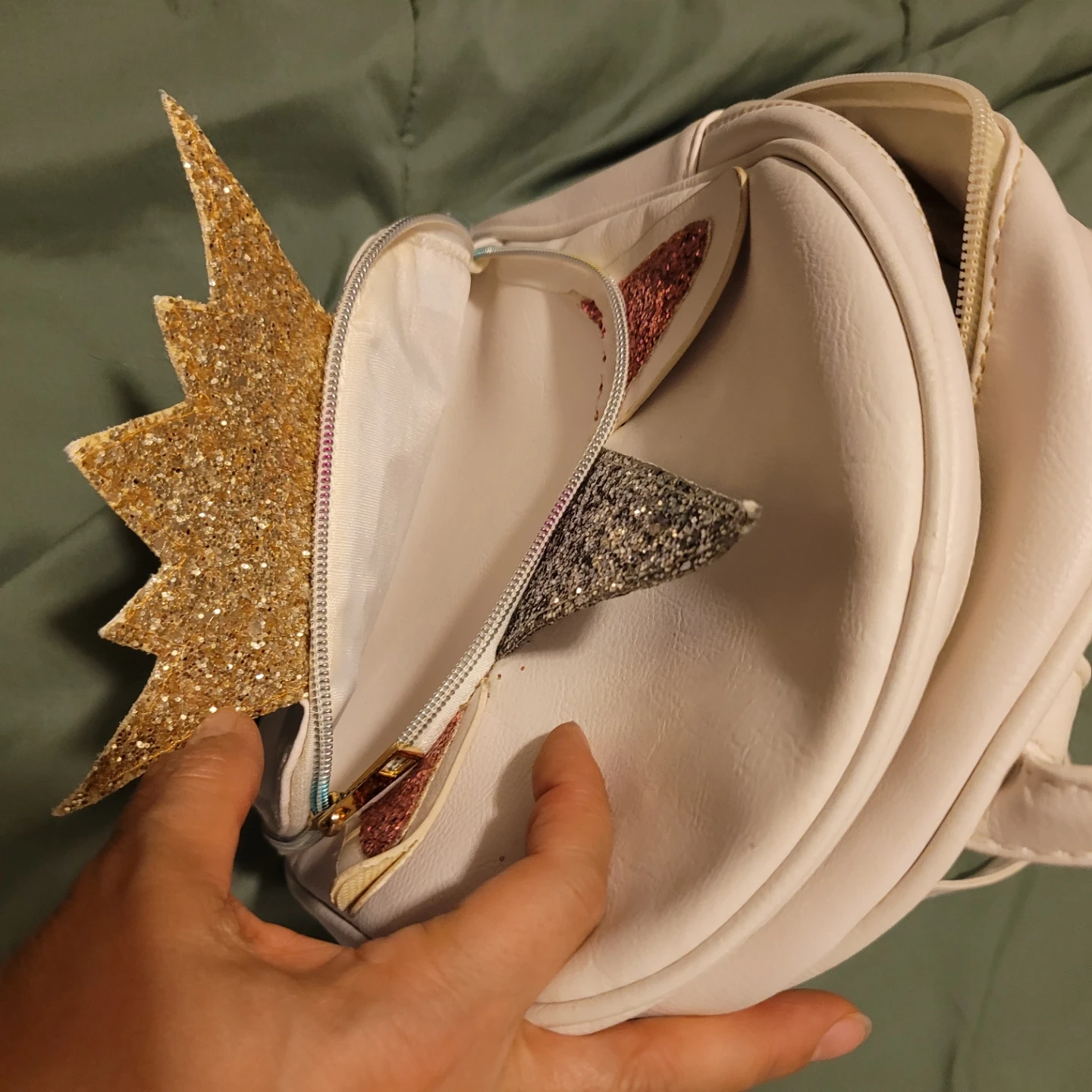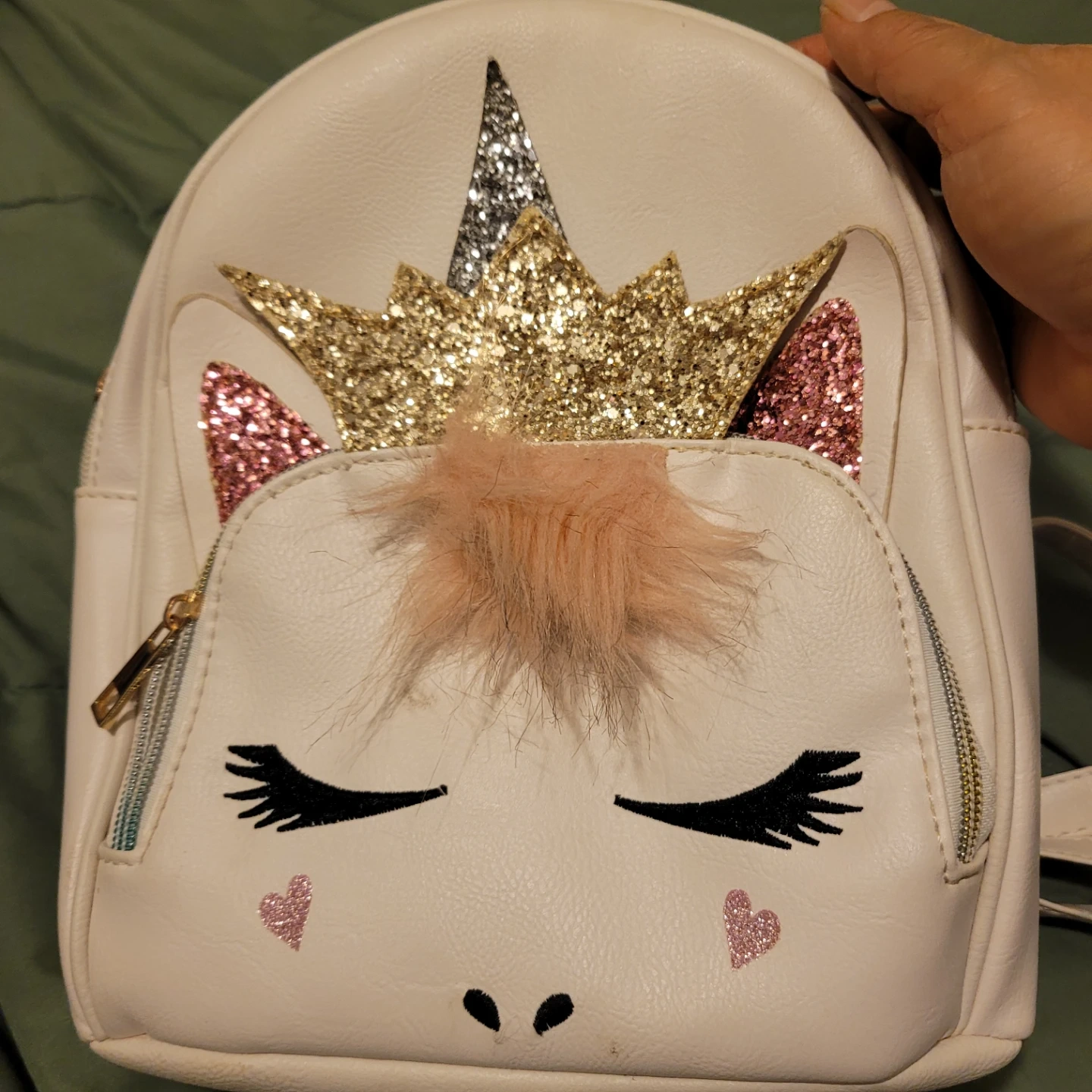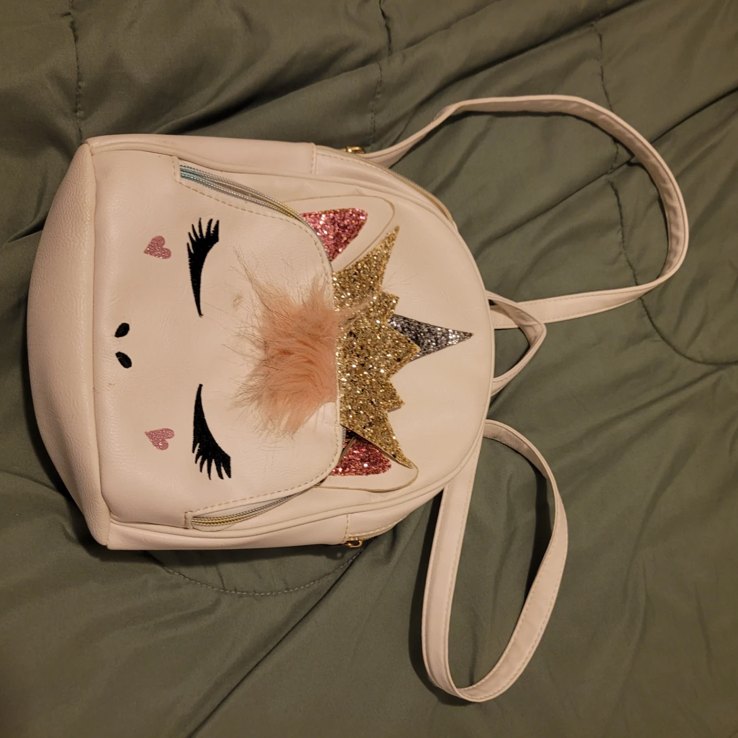 Cute white mini backpack with a unicorn design. Features sparkly accents and a fluffy mane detail. Interior has a zippered pocket.