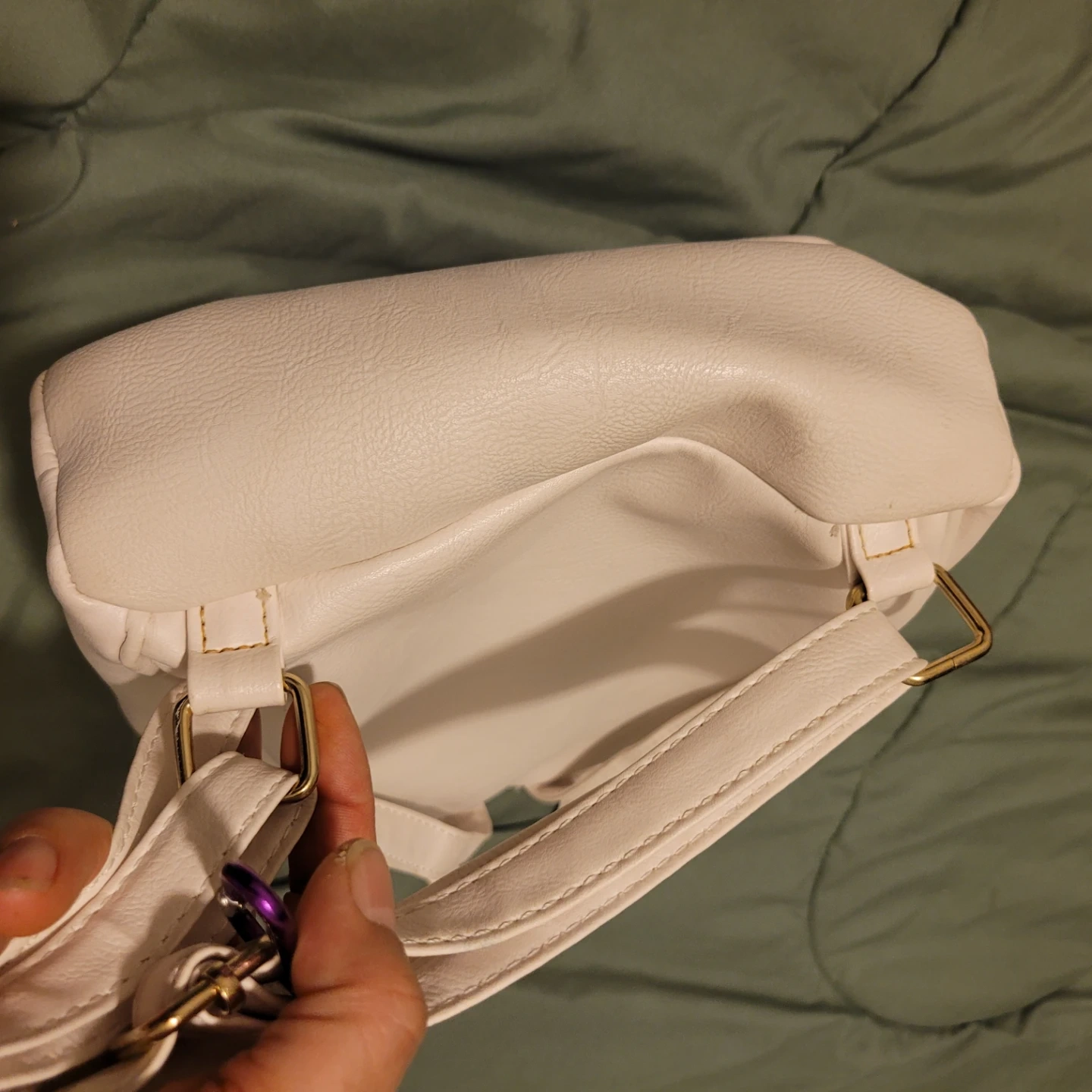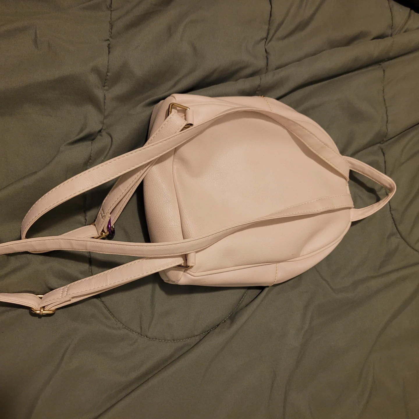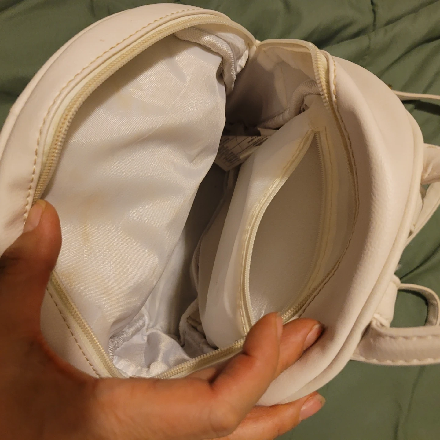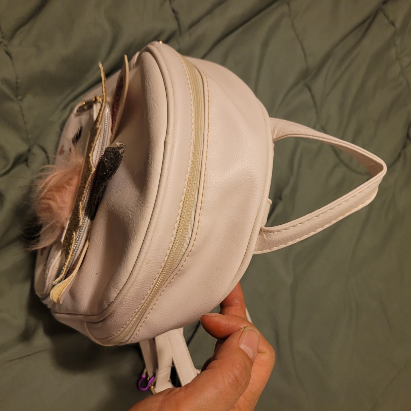 Cute white mini backpack with a unicorn design. Features sparkly accents and a fluffy mane detail. Interior has a zippered pocket.