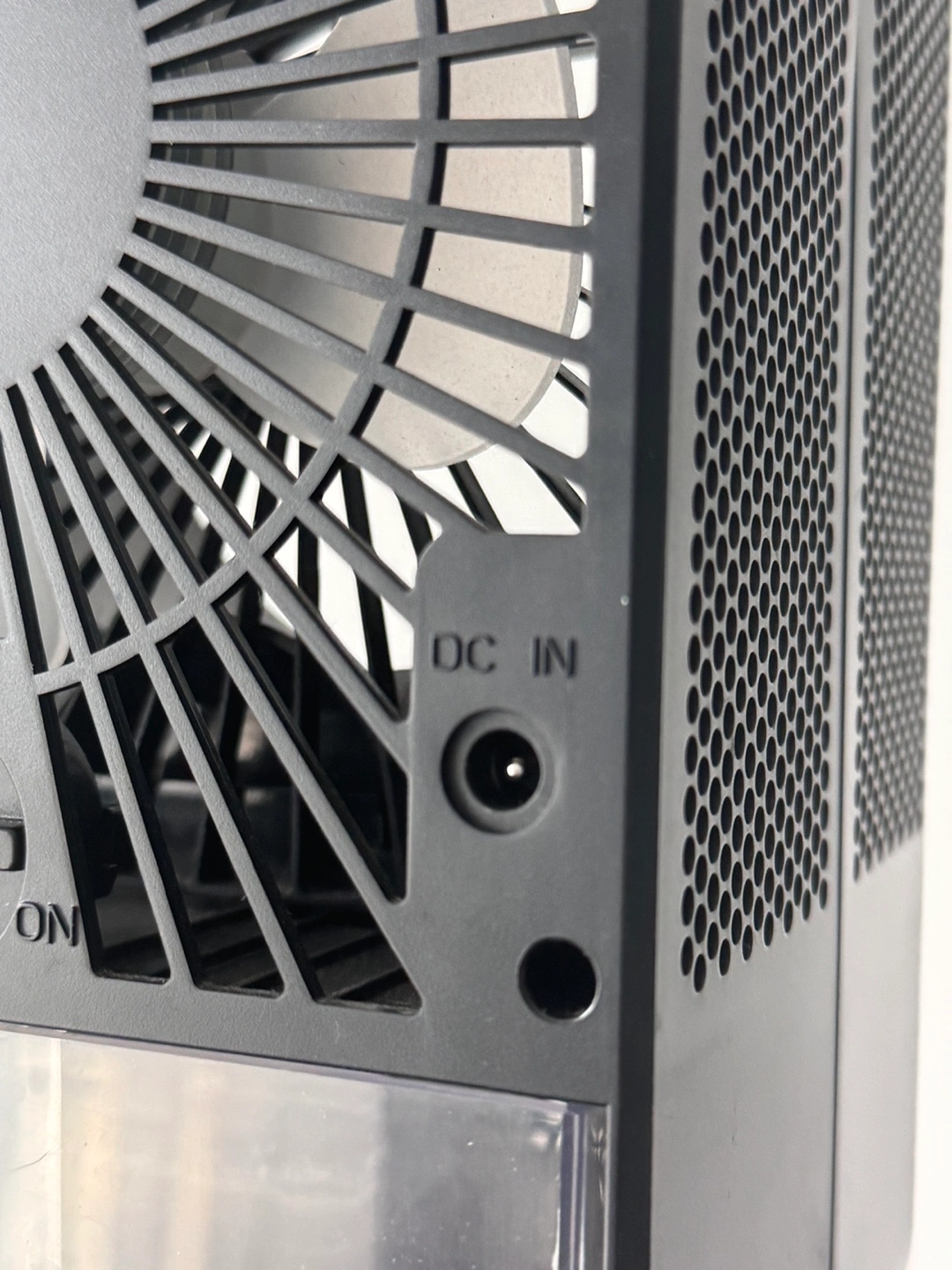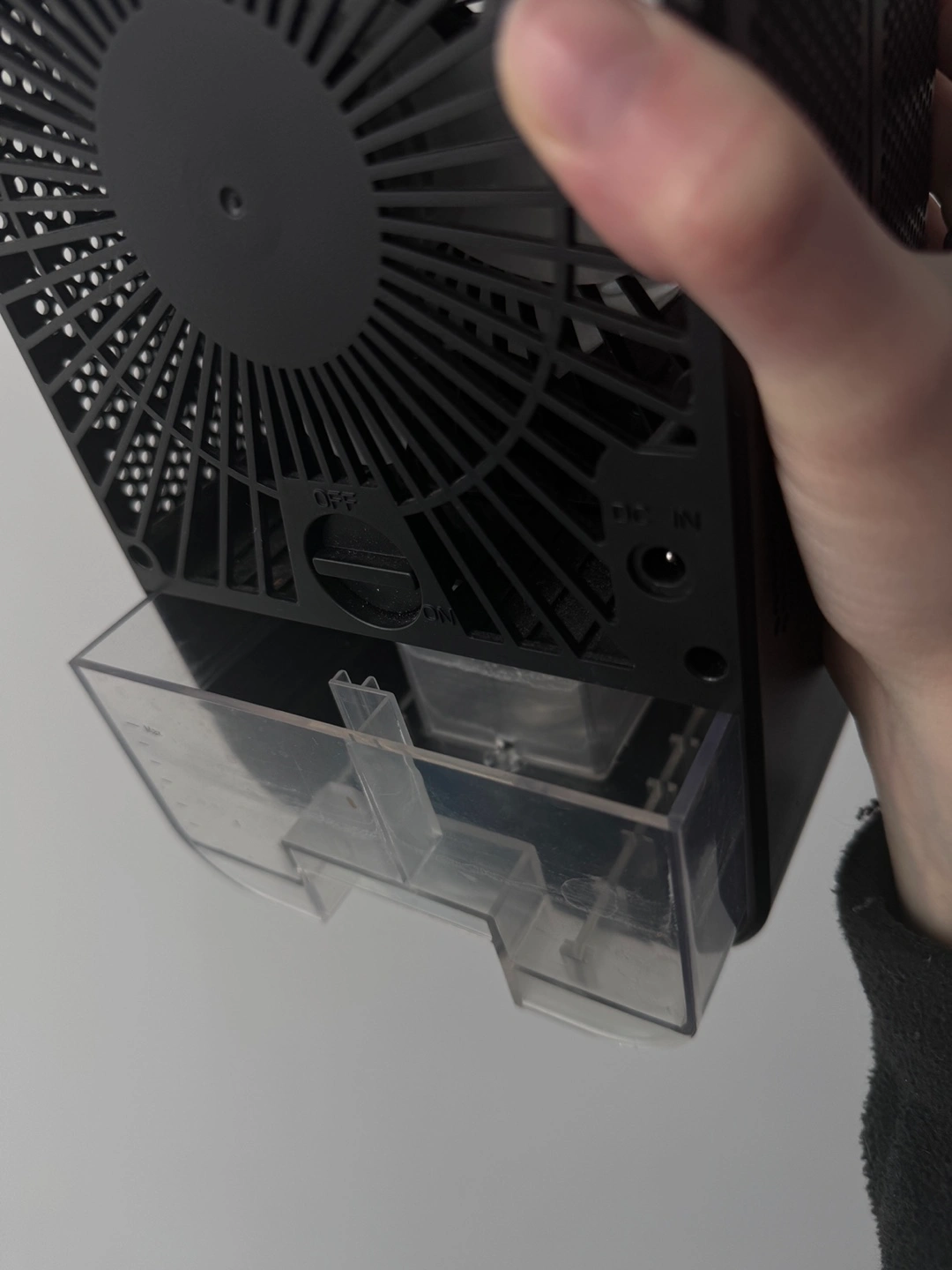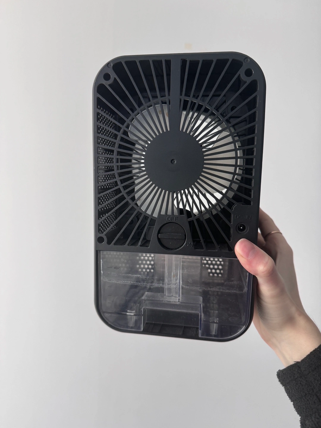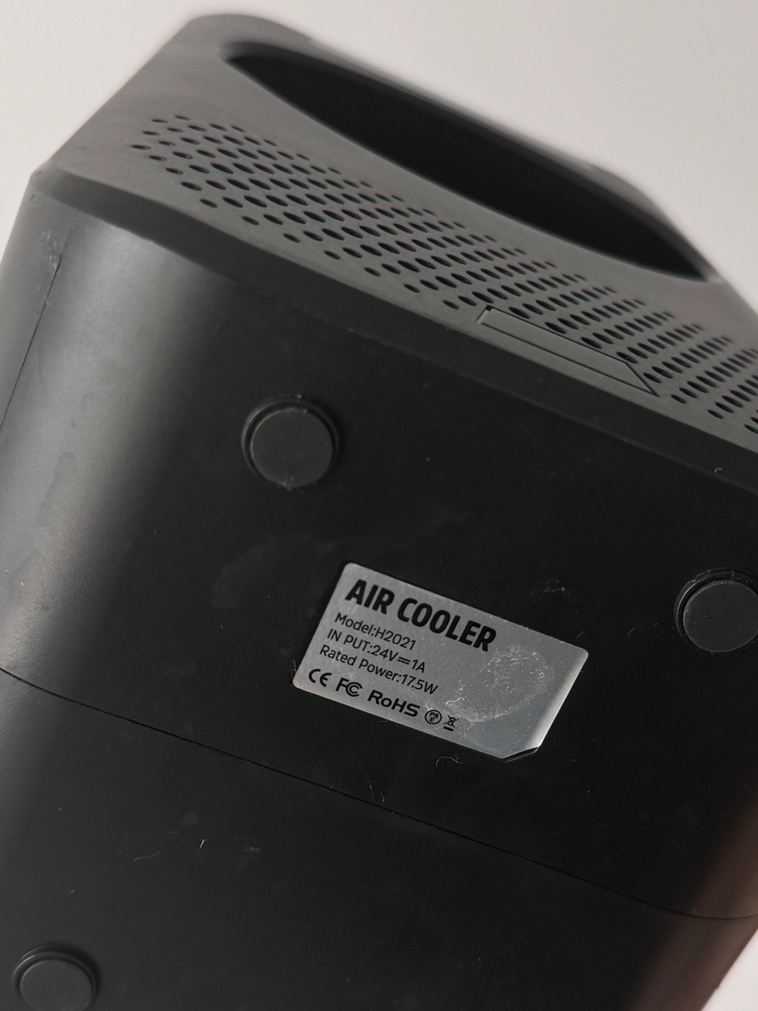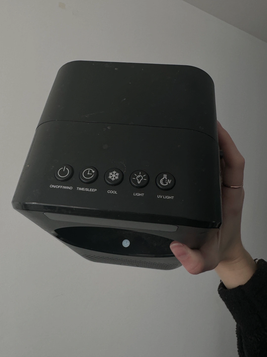 Black portable air cooler. Features include cool, light, and UV light settings. Includes a water reservoir. Power cord sold separately. For the fan you can add cold water and ice to the compartment and it will blow cool air.