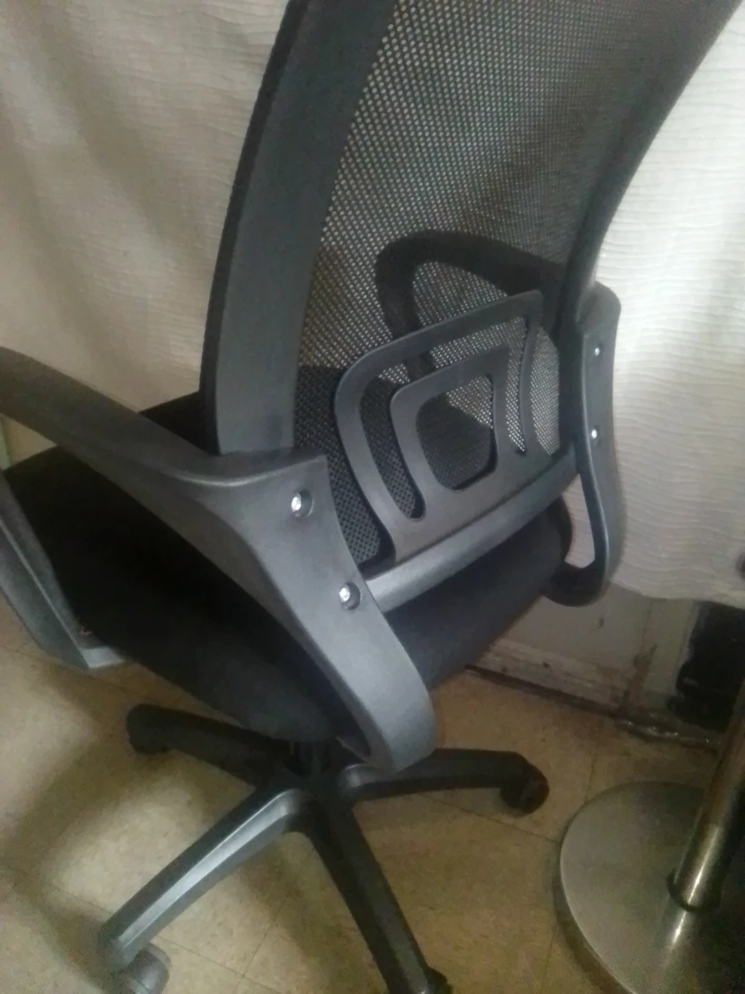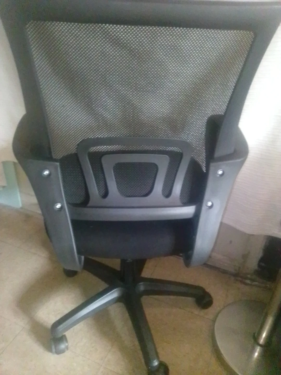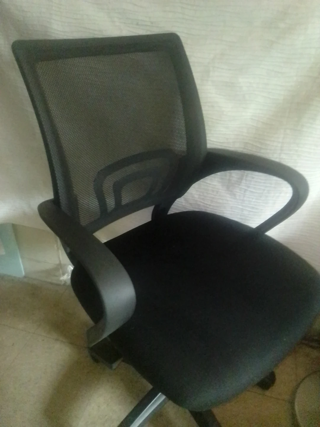 Comfortable black mesh back office chair with padded seat. It features Back support system adjustable height and a wheeled base for easy movement. This chair is great for home offices or workspaces!