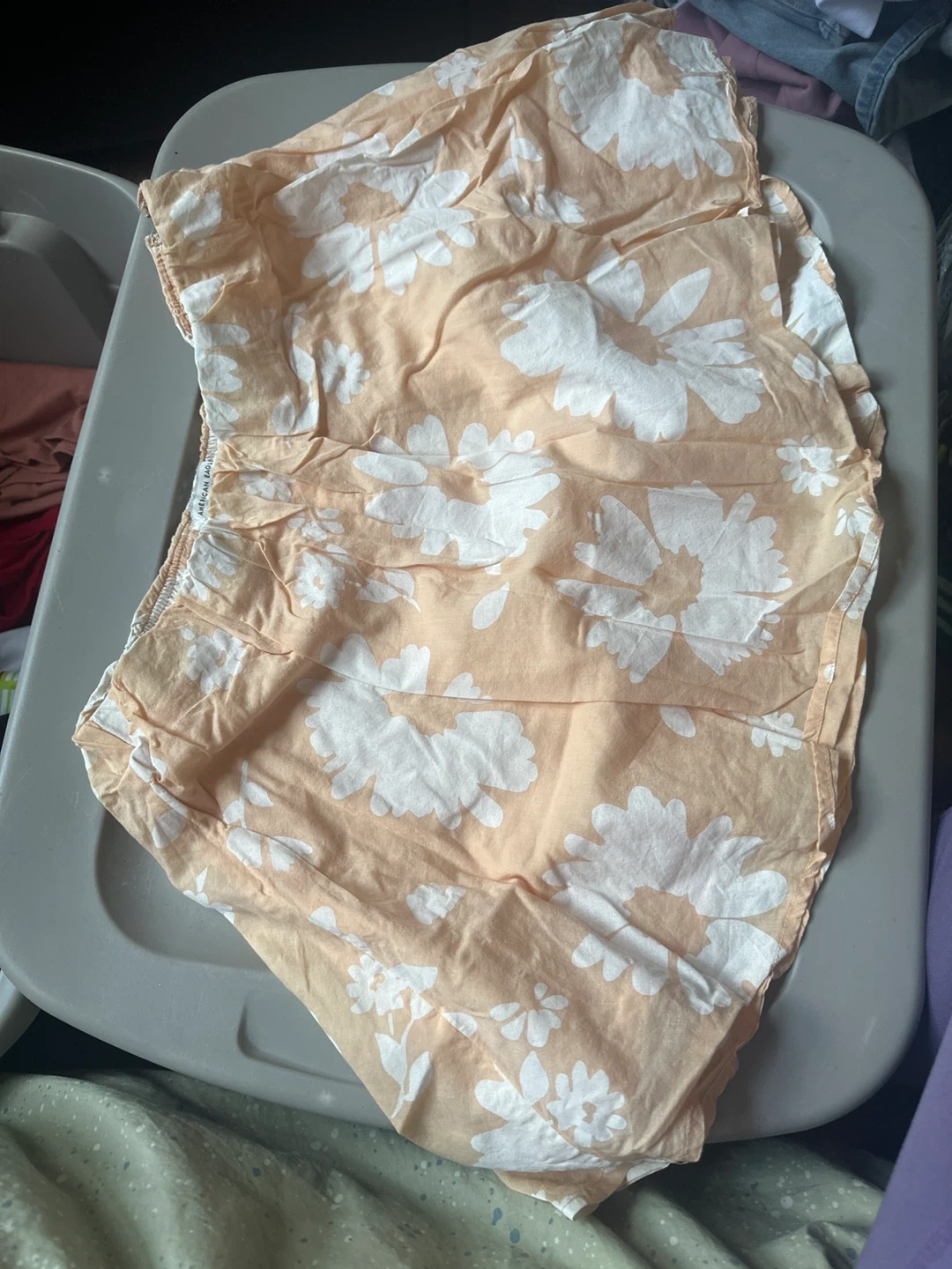 These are cute peach-colored shorts with a white floral print. They feature an elastic waistband for a comfortable fit. 100% cotton material.