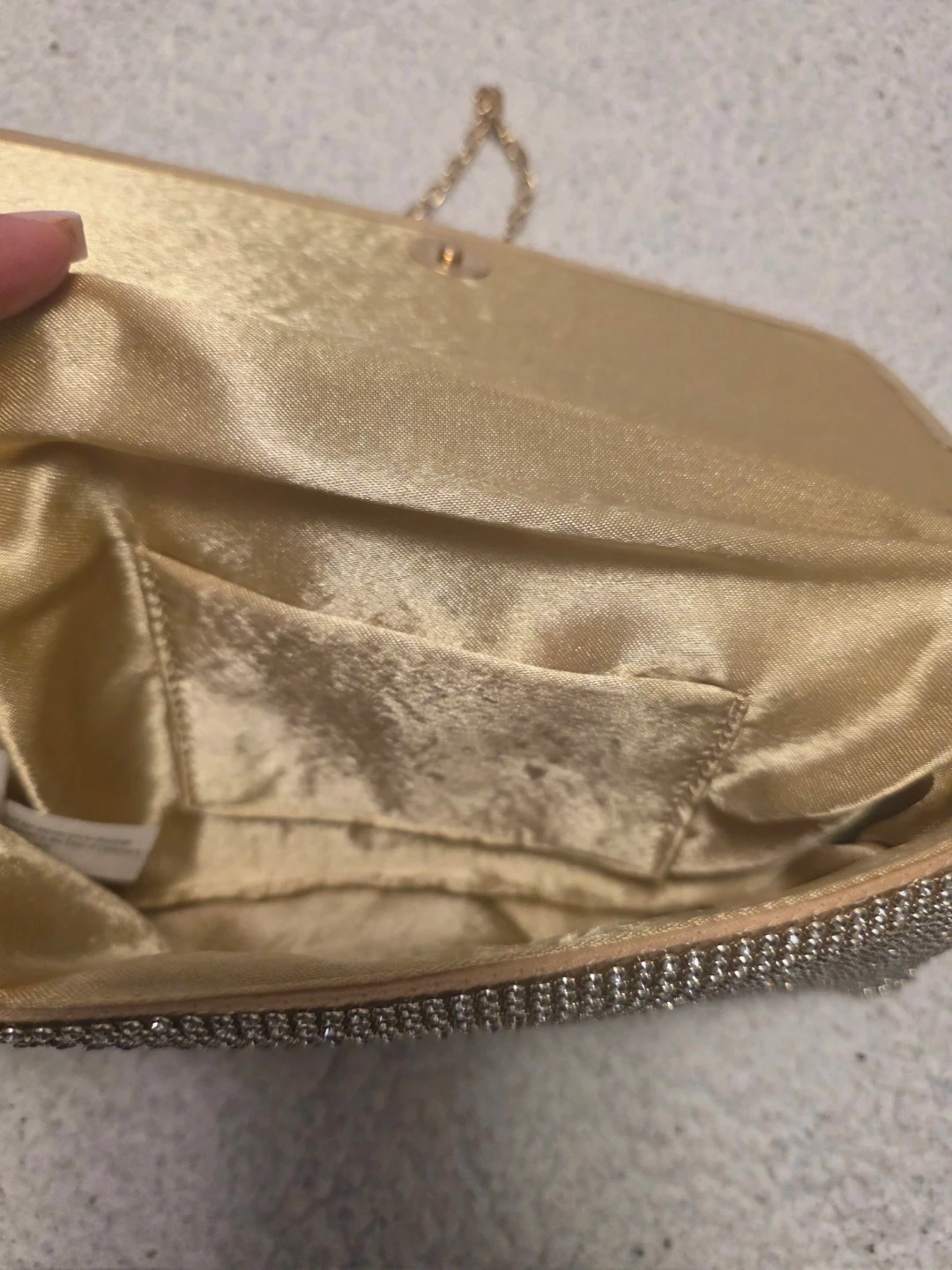 Sparkly gold clutch purse embellished with rhinestones. It's lined with satin and includes a detachable gold chain strap. Perfect for special occasions!