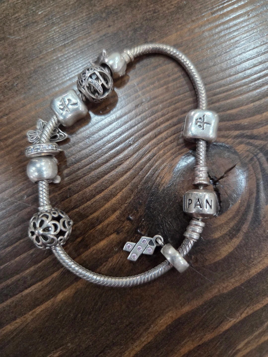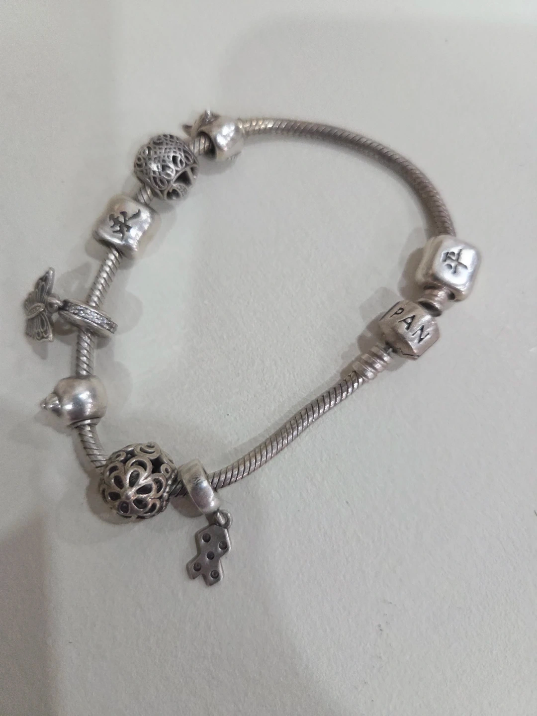 Sterling silver Pandora bracelet with multiple charms. It's embellished with detailed charms including a butterfly, a floral design, and letter beads that spell 'PAN'. This bracelet would be a nice gift for someone who collects charms.