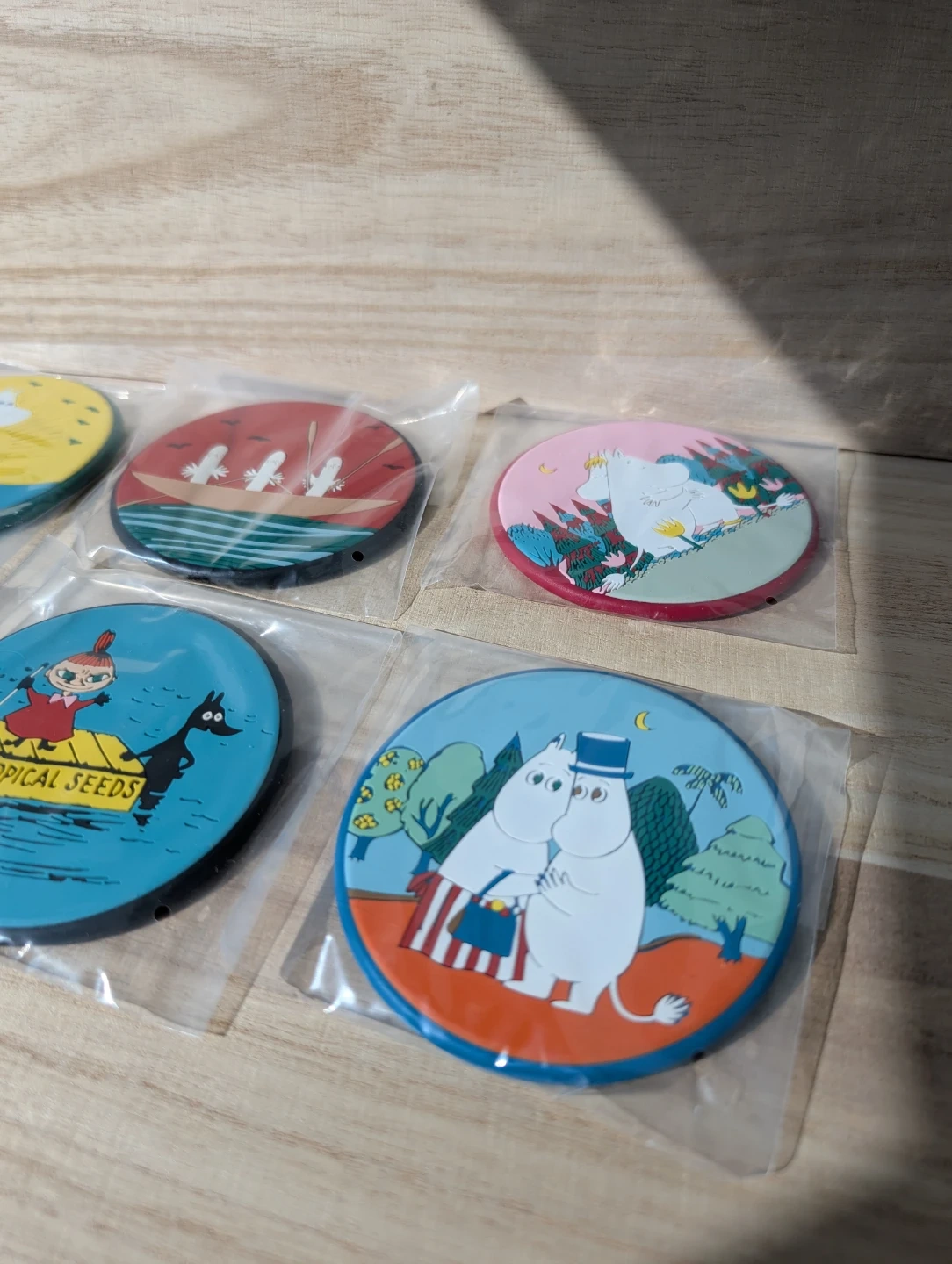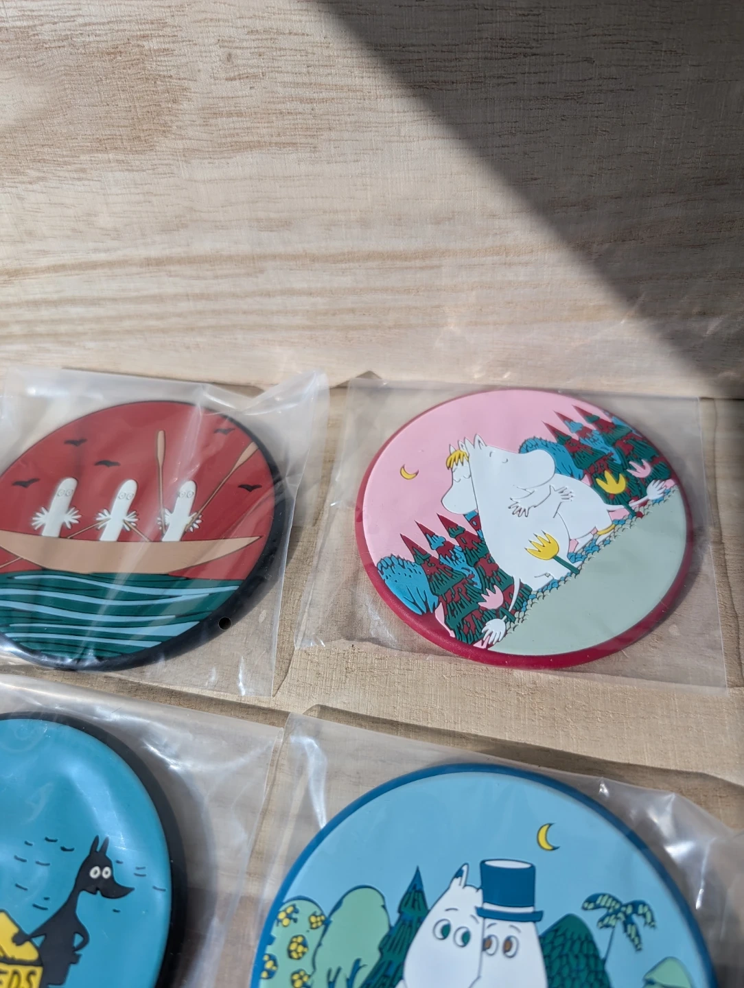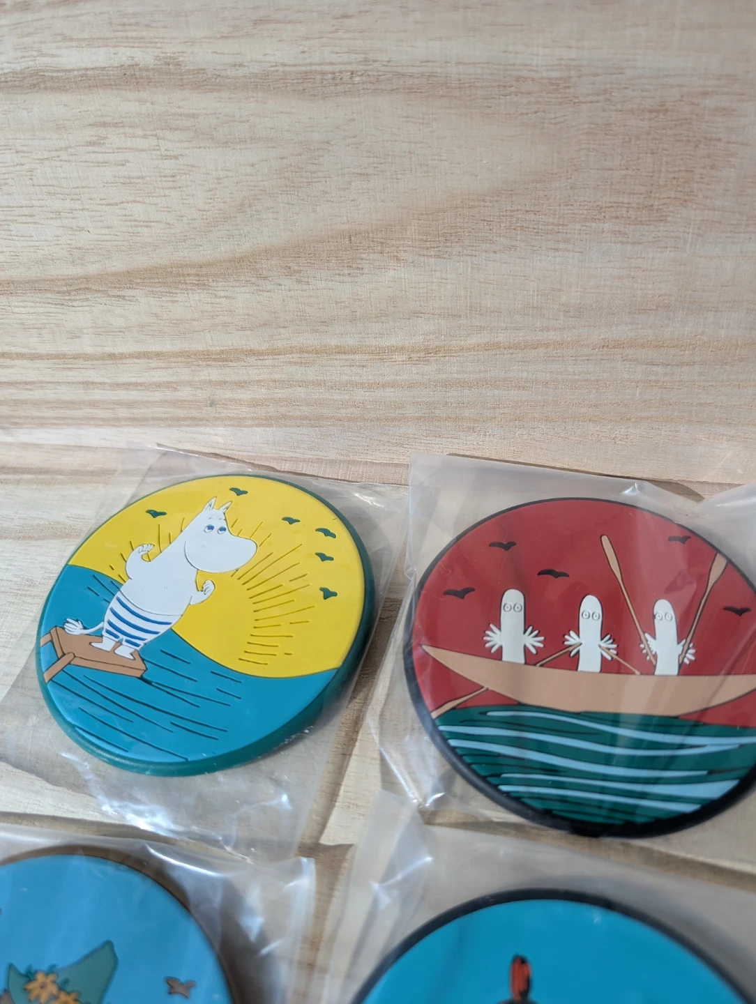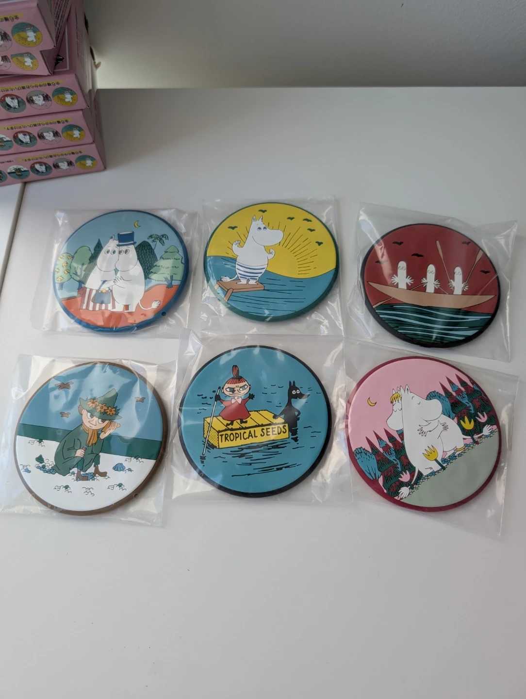 A set of six Moomin coasters, each with a unique character design. They're perfect for protecting surfaces from drinks. These coasters are a fun addition for any Moomin fan's home!