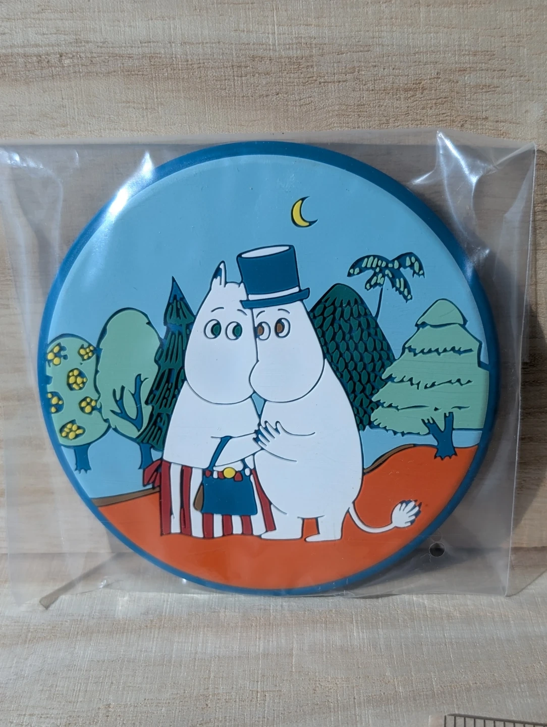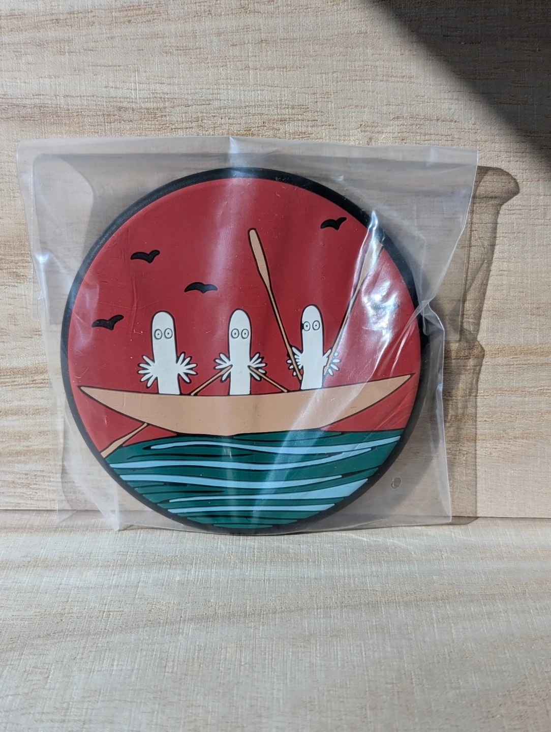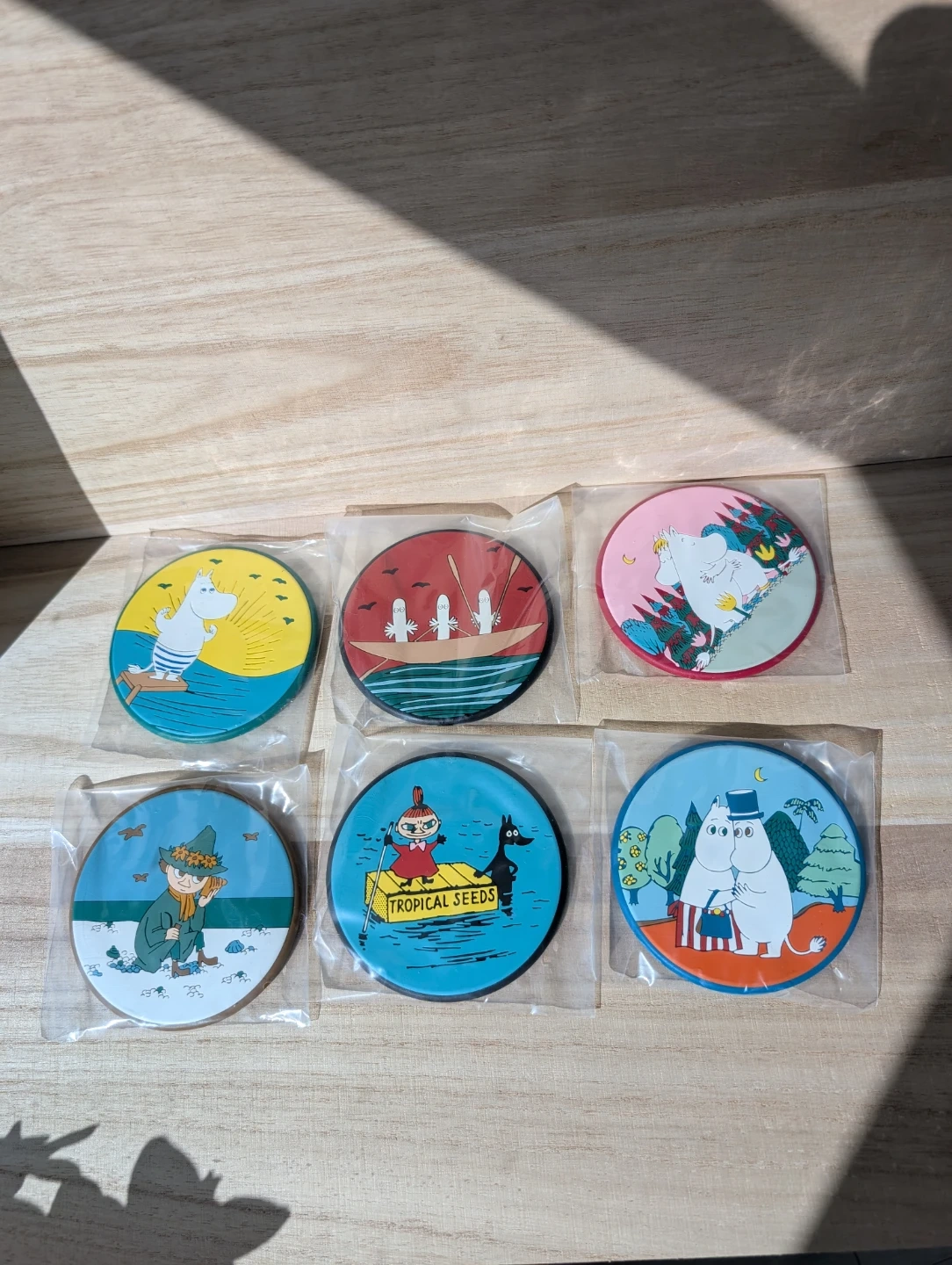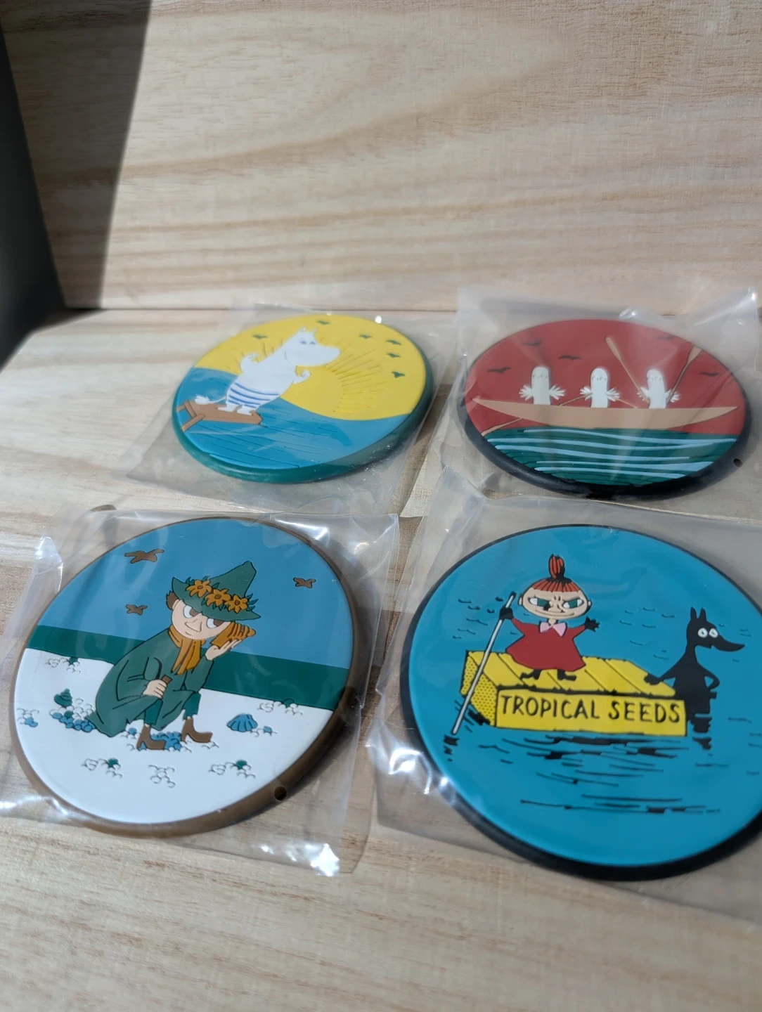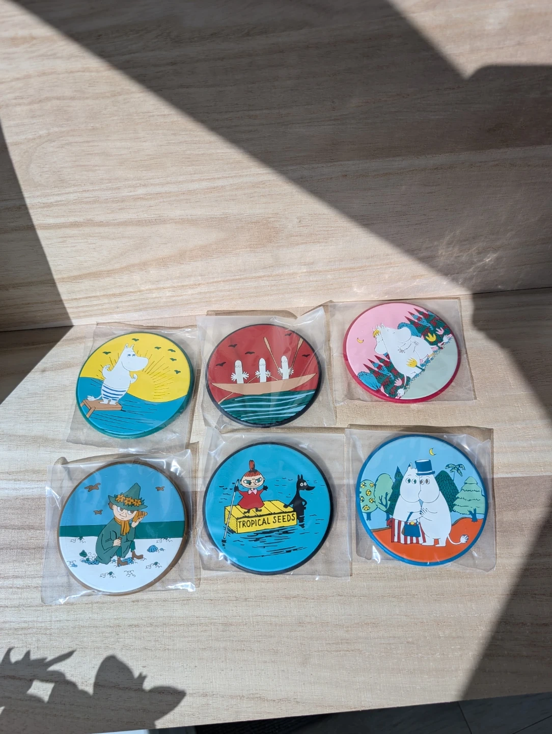 A set of six Moomin coasters, each with a unique character design. They're perfect for protecting surfaces from drinks. These coasters are a fun addition for any Moomin fan's home!