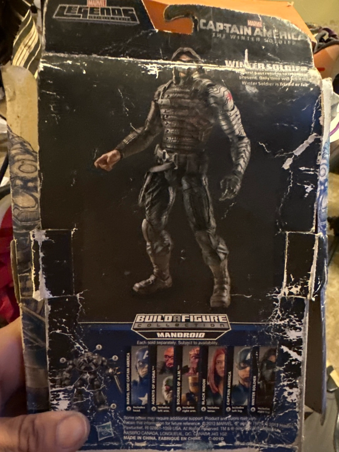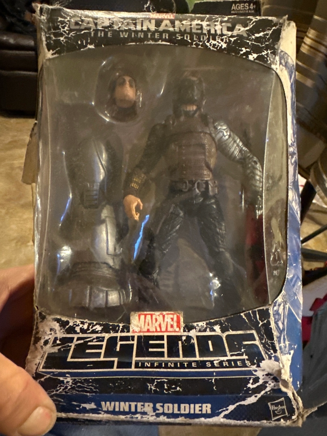 Marvel Legends Infinite Series Winter Soldier action figure in box. Figure is in good condition. Box shows wear and tear. Build-A-Figure piece included.