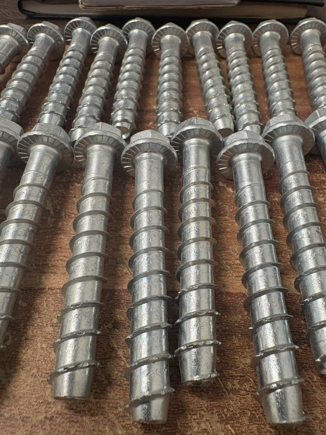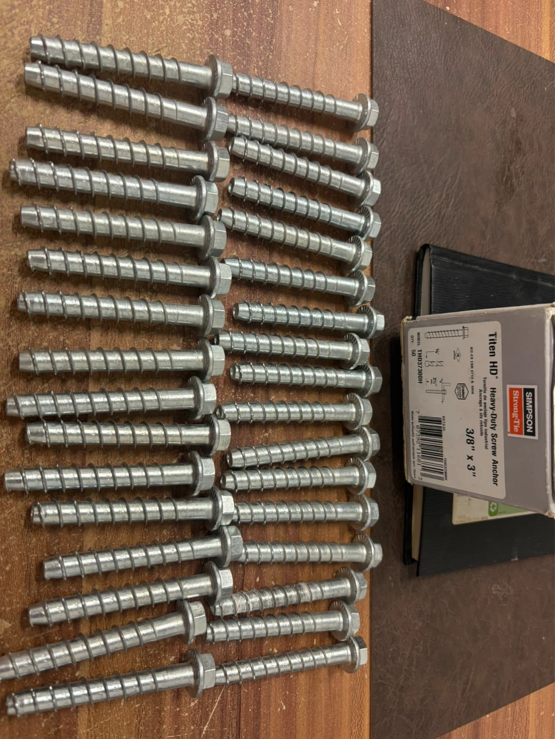 Box of Simpson Strong-Tie Titan HD heavy-duty screw anchors. These are 3/8" by 3" anchors. They're designed for secure fastening in concrete, brick, and block. Great for construction projects!