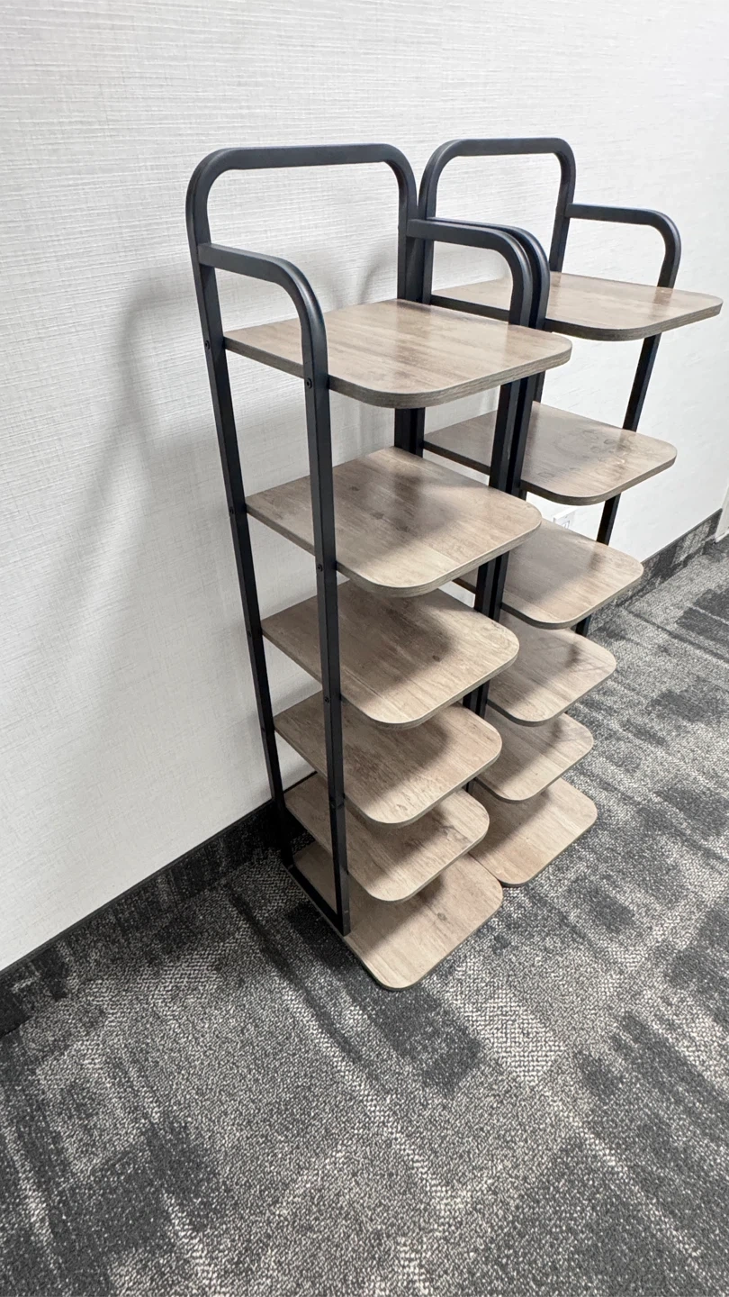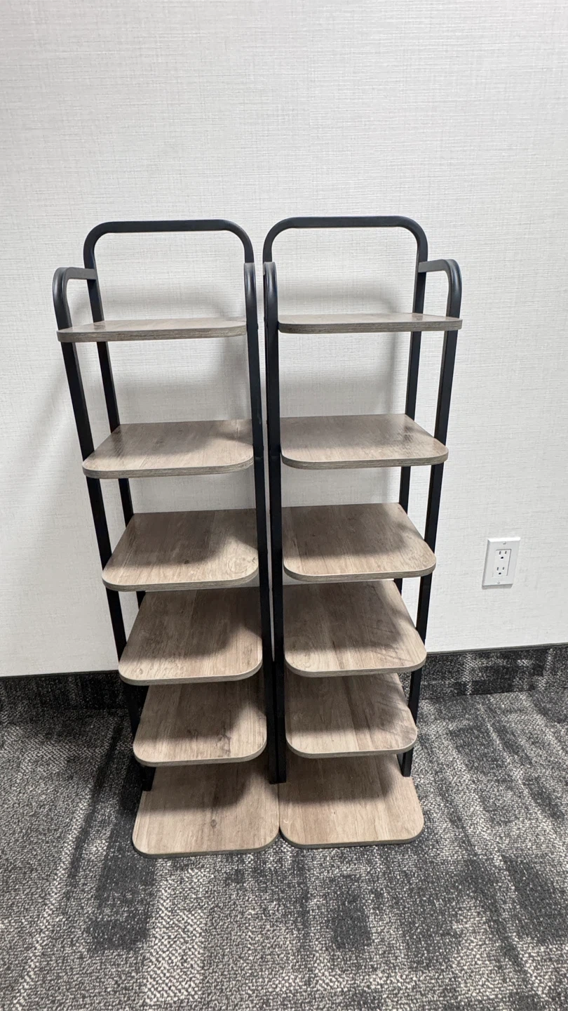 · Two 6-tier shelf units with a wood grain finish and black metal frames