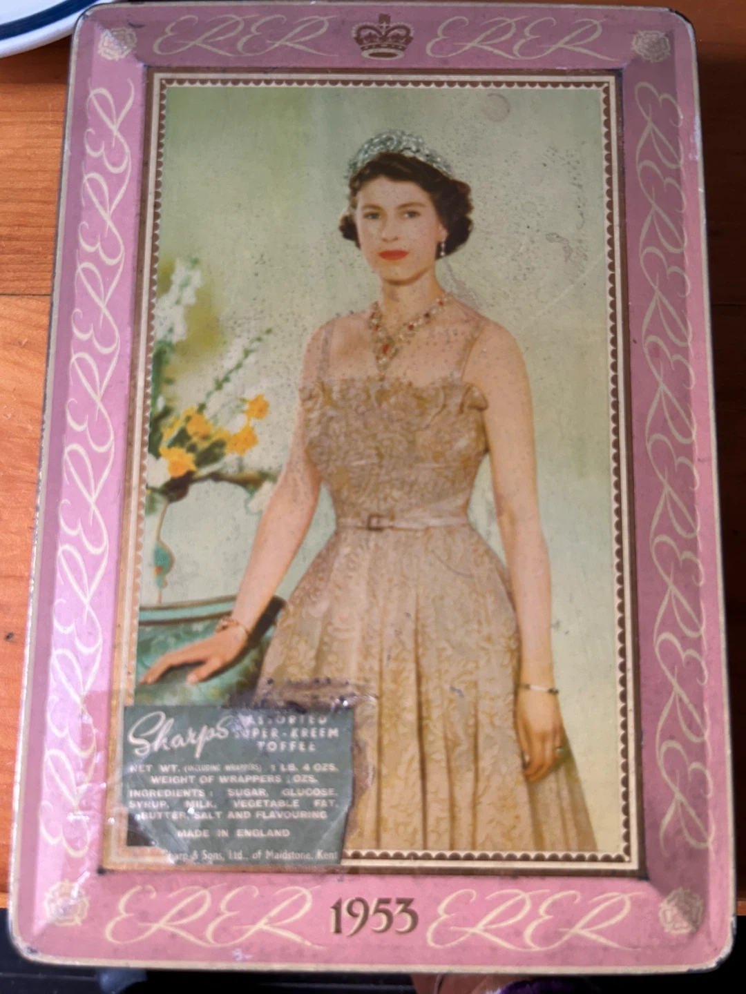 Selling a vintage Sharps Super-Kreem Toffee tin featuring Queen Elizabeth from 1953. The tin is made in England and once contained 1 lb 4 oz of toffee. A neat piece of history!