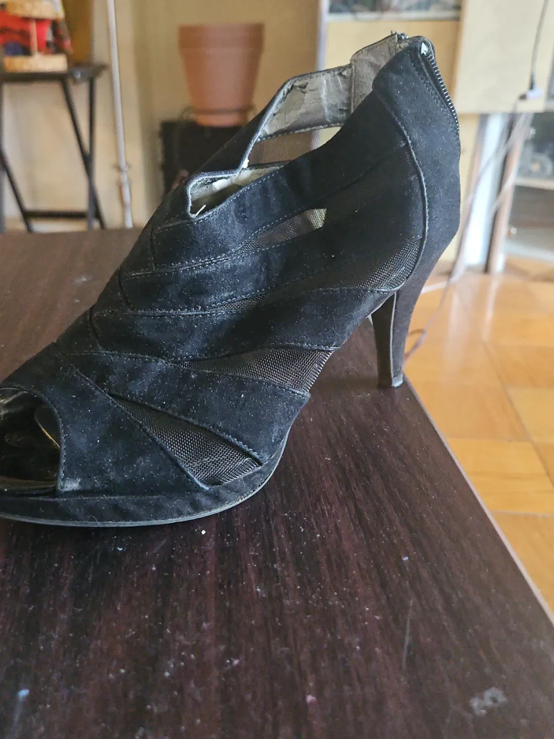 Black peep-toe heels with mesh detailing and an ankle strap. Features a zipper closure at the back. Heel height appears to be around 3-4 inches.