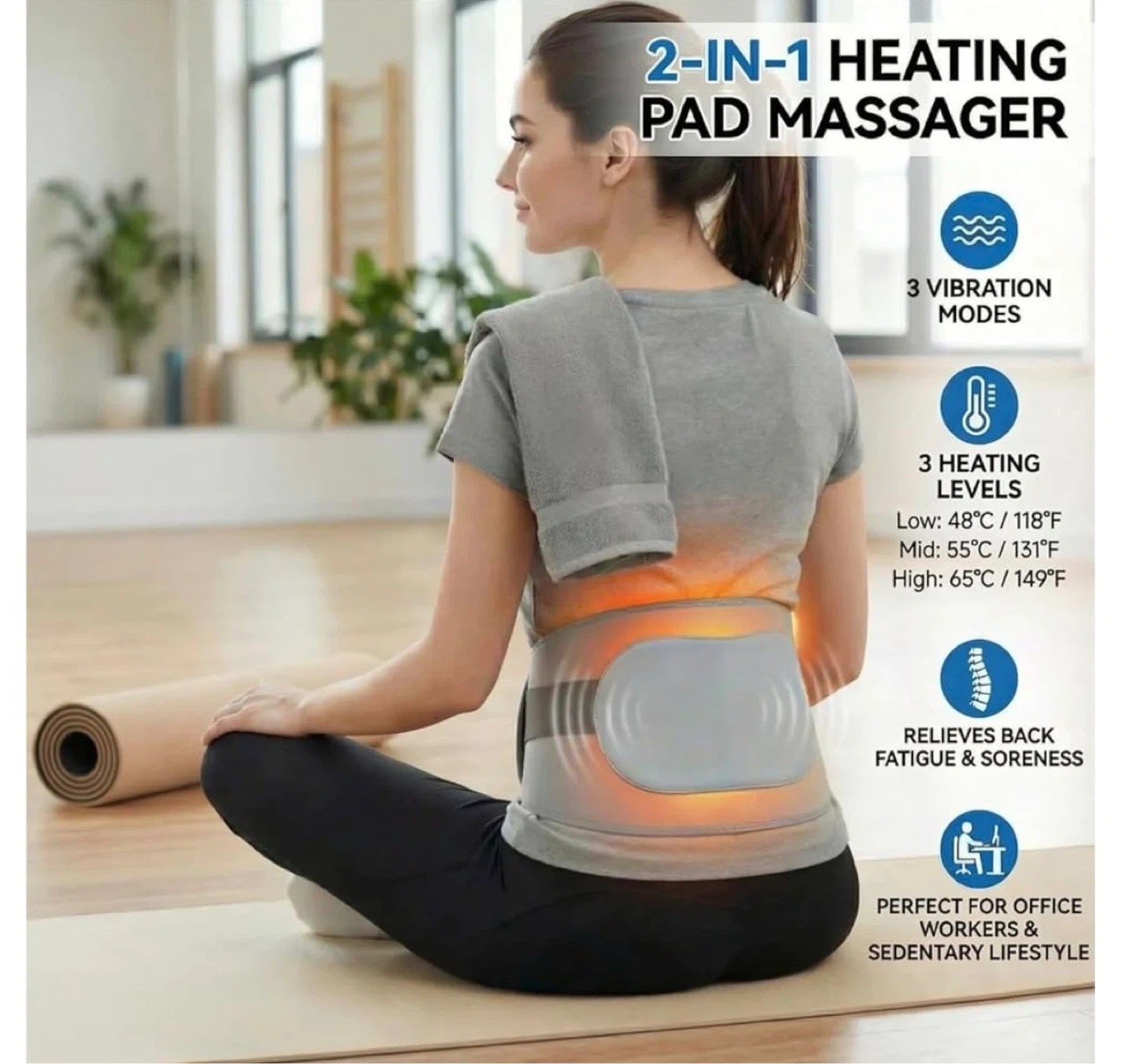 This 2-in-1 wireless heating pad and massager provides soothing heat and vibration relief for your lower back. It features 3 vibration modes and 3 heating levels, offering targeted pain relief. It's perfect for office workers and those with a sedentary lifestyle, providing comfort and support. It includes a 10000 mAH power bank for cordless use.