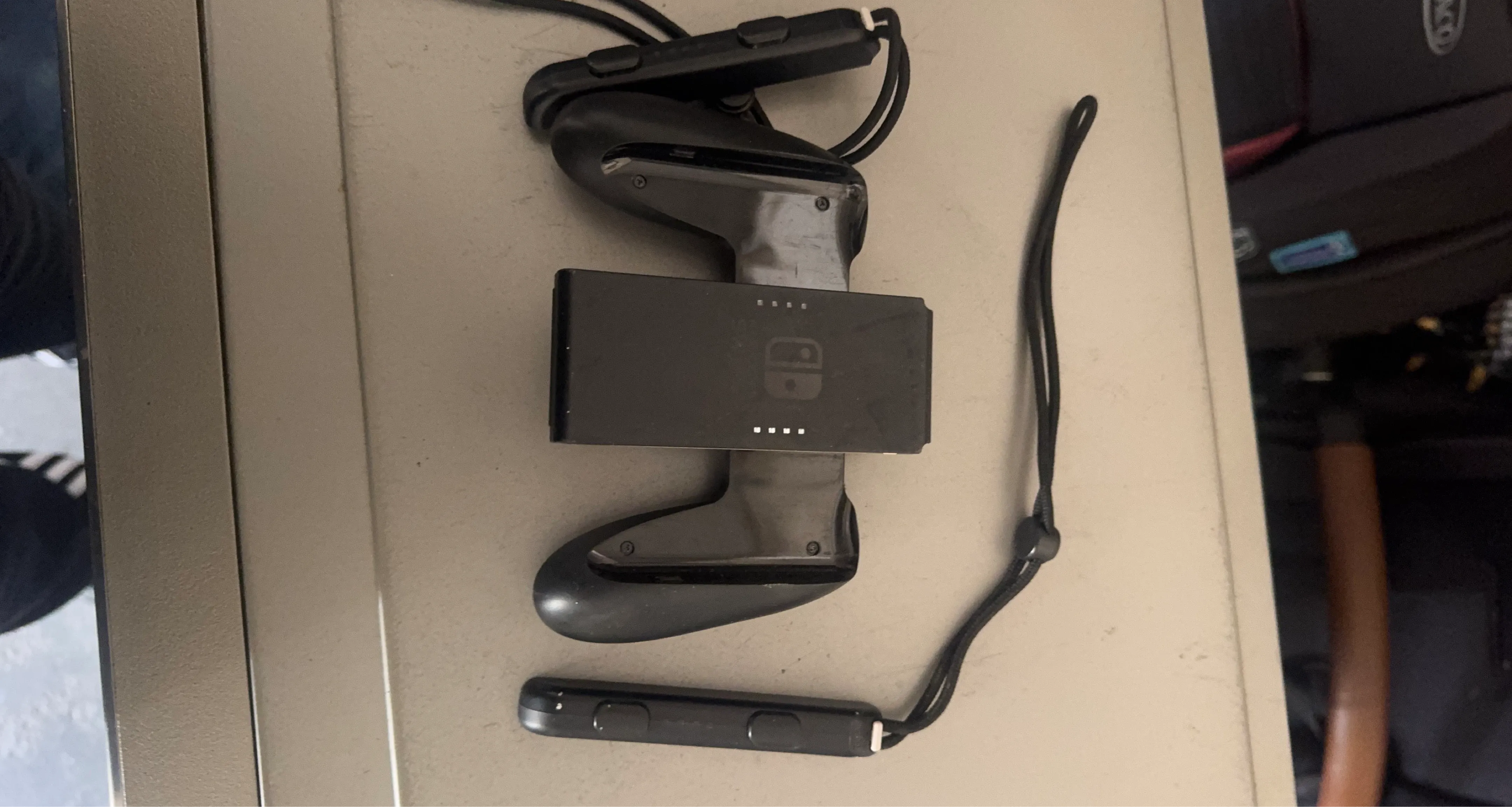 This is a Nintendo Switch Joy-Con charging grip. It allows you to charge your Joy-Con controllers while you play. It's black and includes the charging grip and one Joy-Con strap.