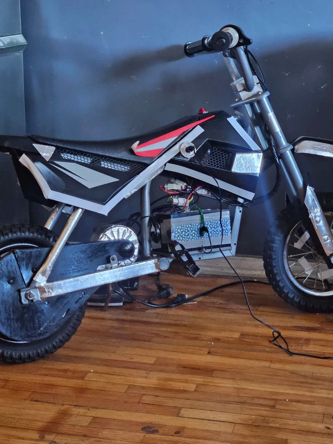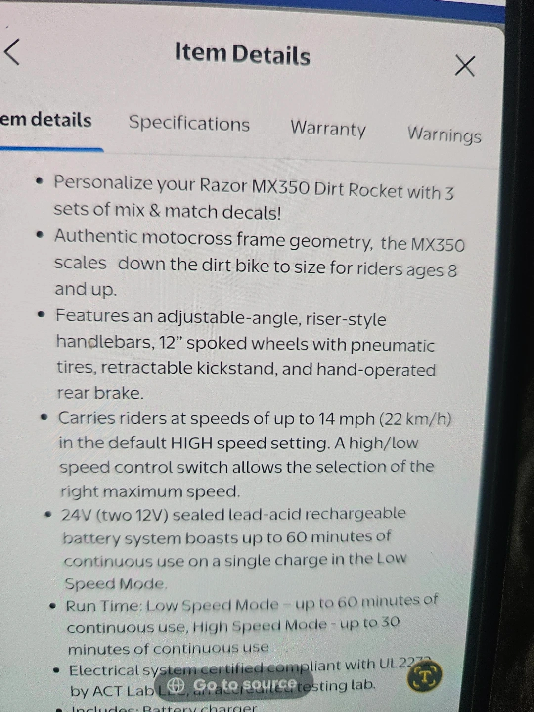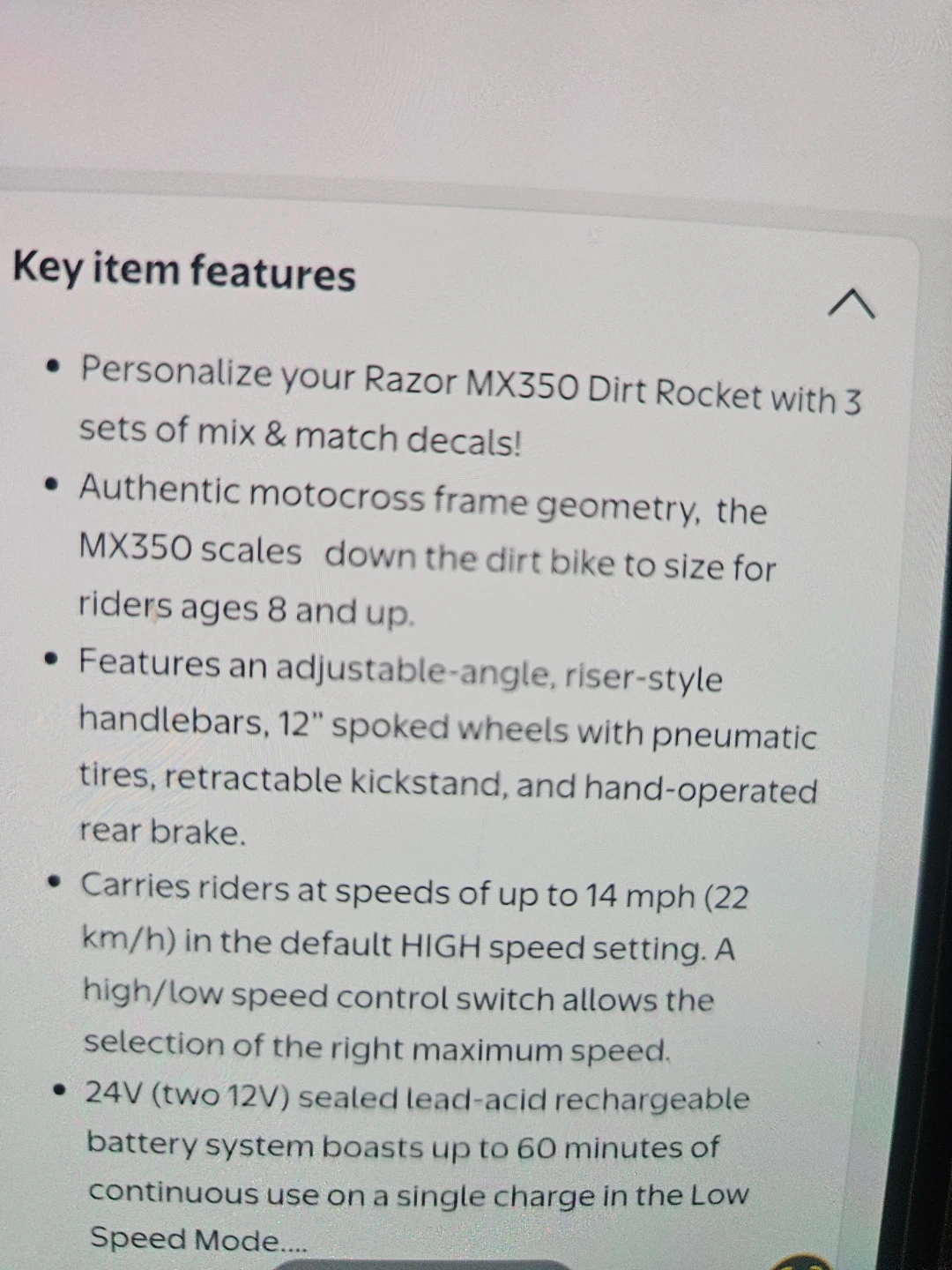 Electric dirt bike with authentic motocross frame geometry. Features 12" spoked wheels, retractable kickstand, and hand-operated rear brake. Carries riders up to 14 mph. 24V rechargeable battery system provides up to 60 minutes of continuous use. Age: 8+ in Low Speed Mode, 13+ in High Speed Mode.