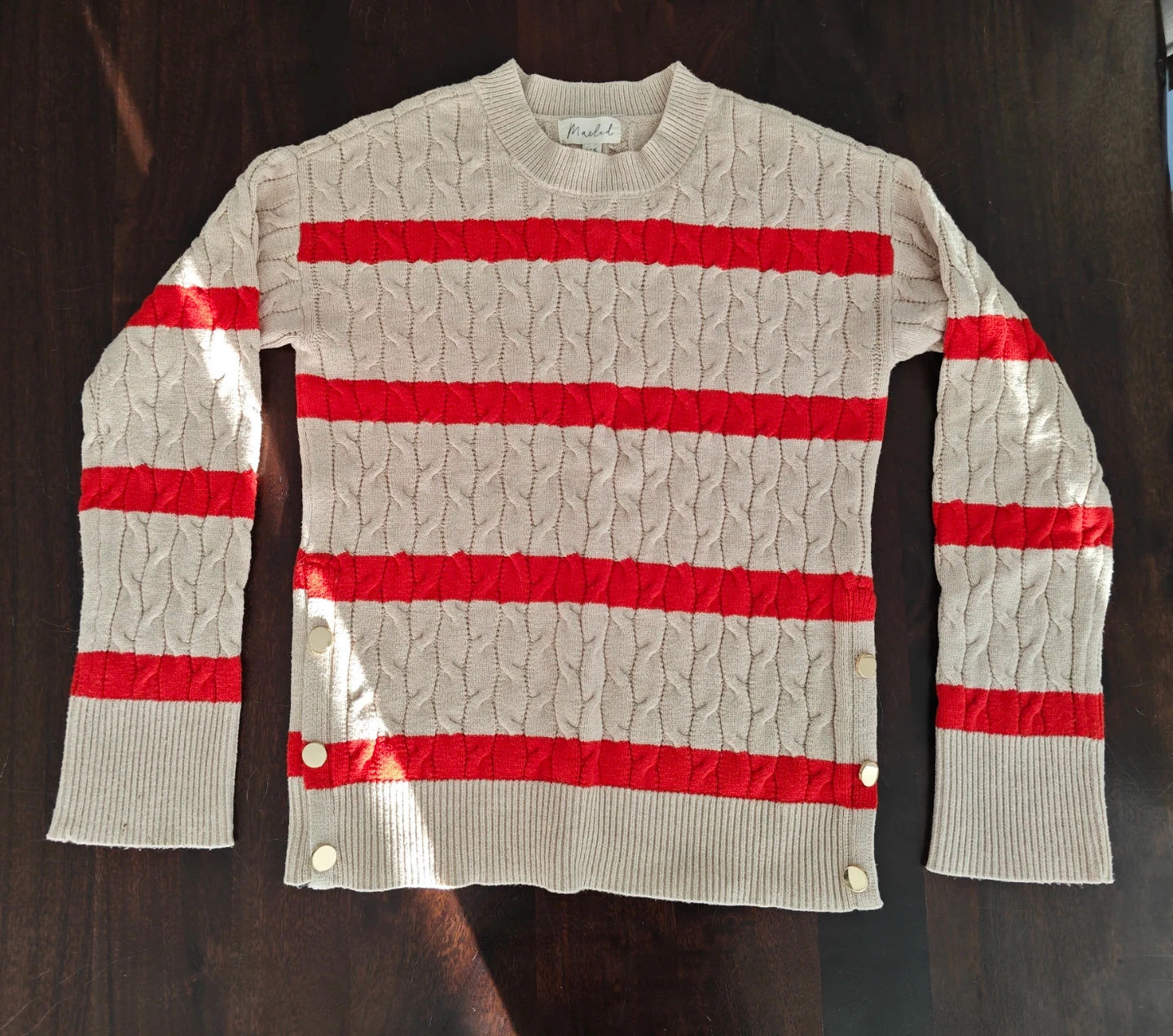 Crewneck sweater with horizontal red stripes and cable knit detailing. It has gold-tone button accents on the side slits. A cozy knit for cooler days!