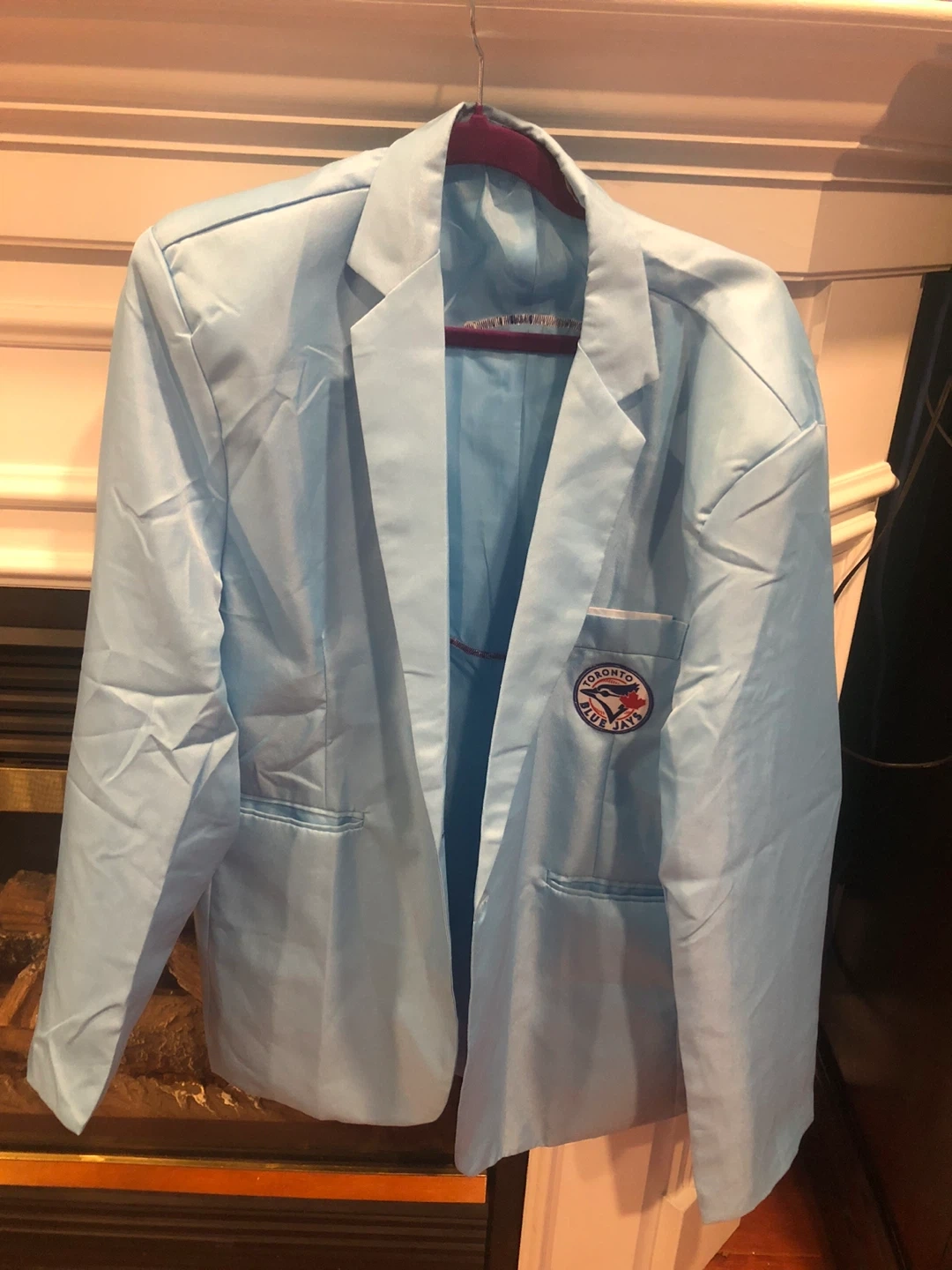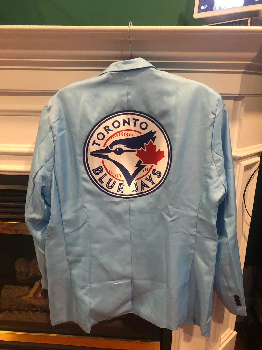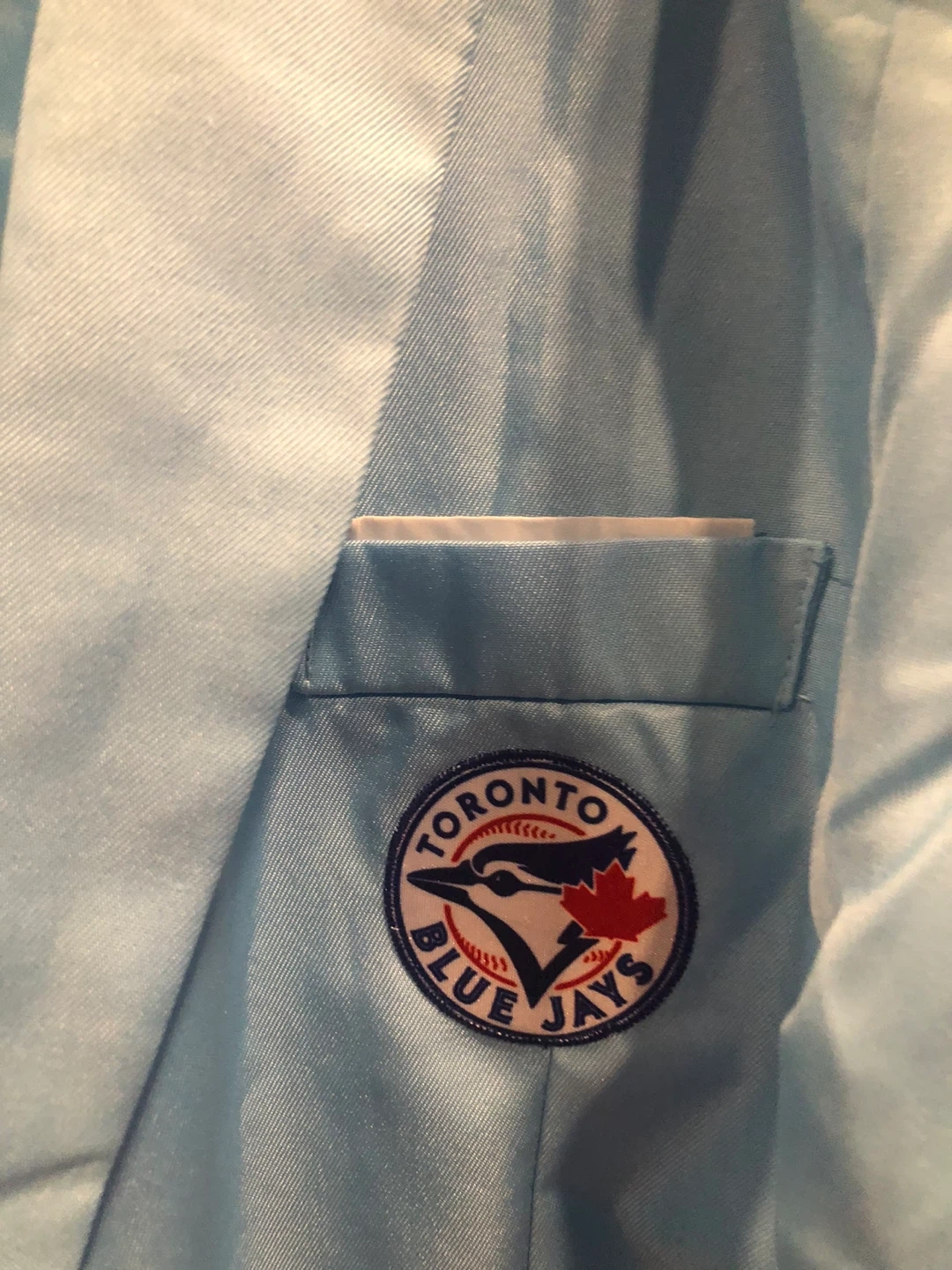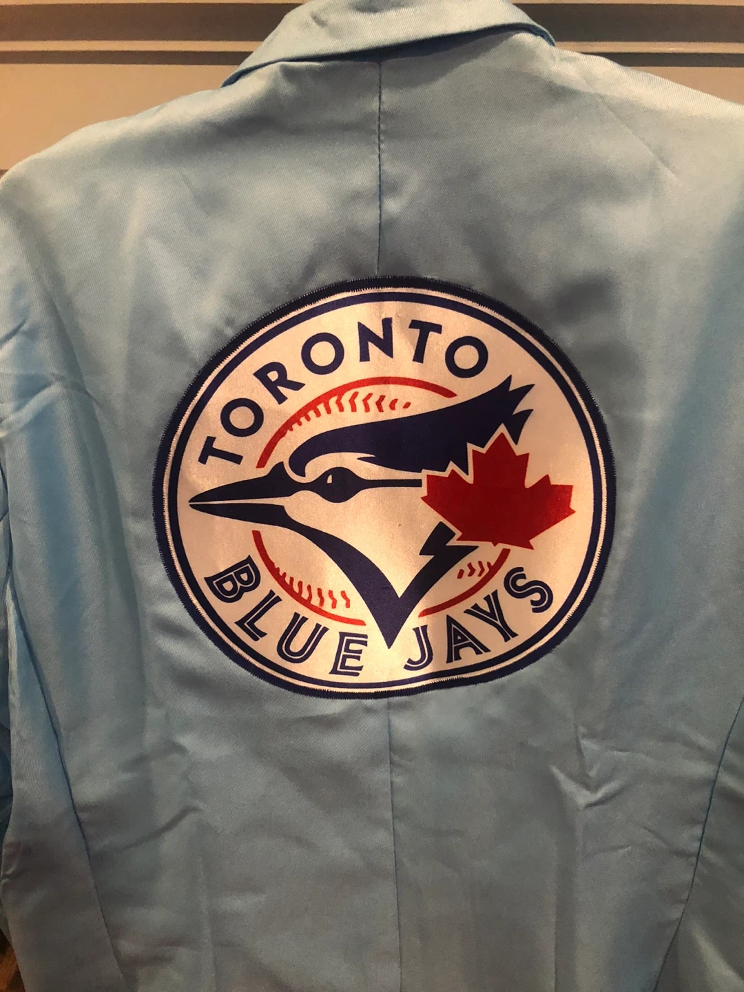 Light blue blazer featuring the Toronto Blue Jays logo on the chest and back. It's a stylish piece for any fan!