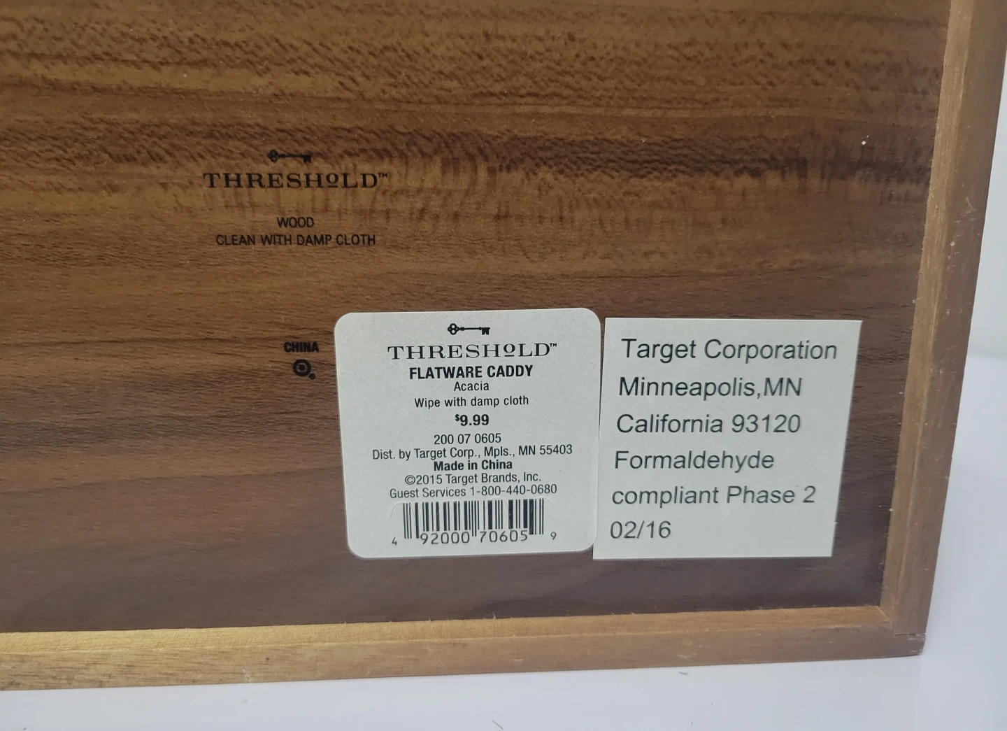 This Threshold flatware caddy is made of acacia wood. It features multiple compartments for organizing utensils. Wipe clean with a damp cloth.