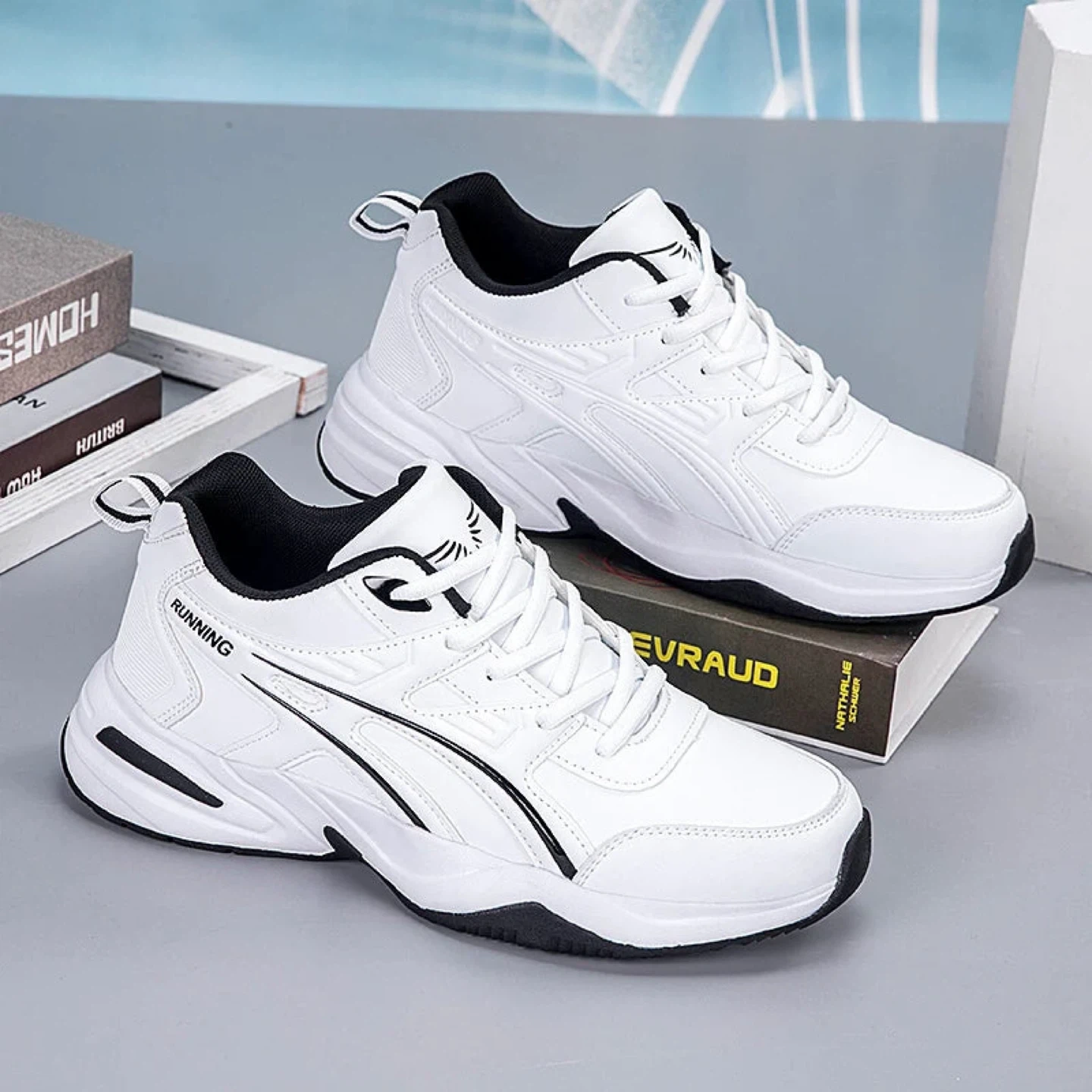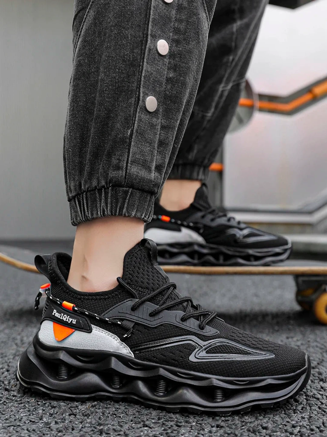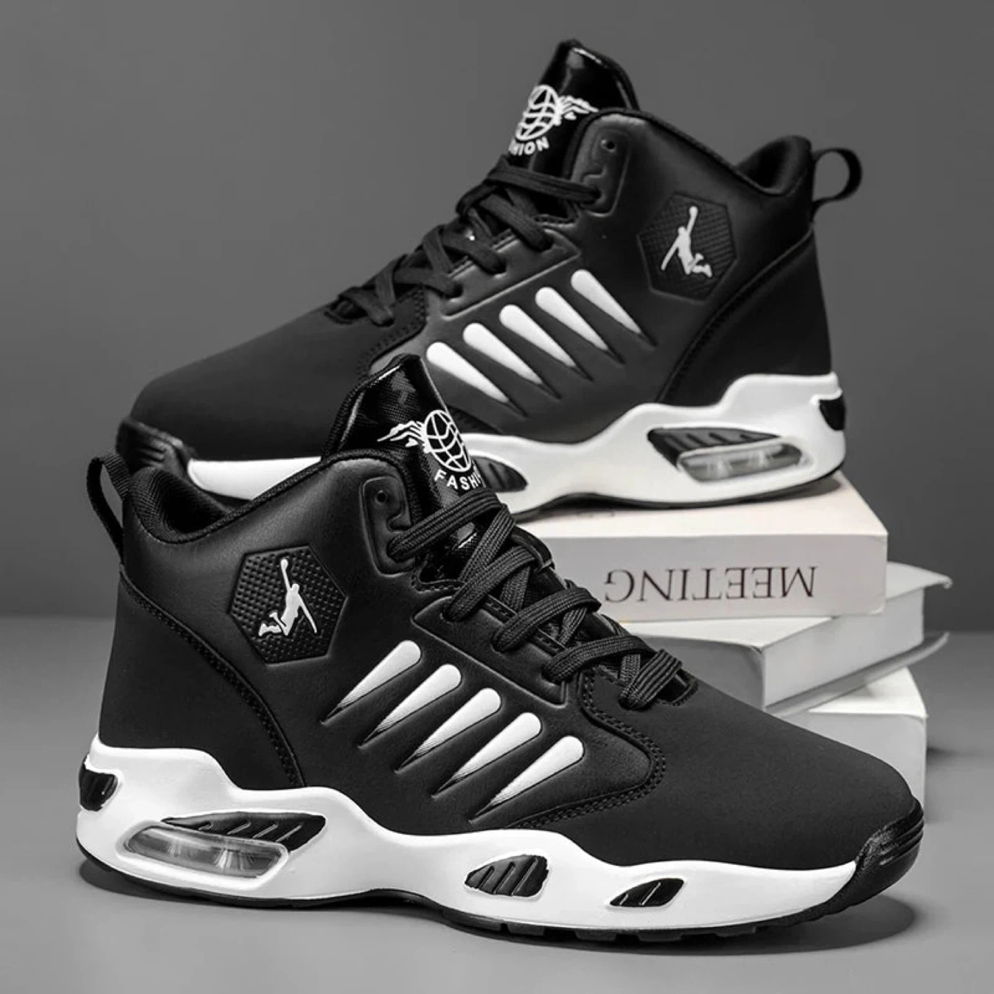 These high-top sneakers feature a striking black and blue colorway with white accents. They're designed with a comfortable padded collar and a durable rubber sole for support. Built for active wear, these shoes offer a secure fit and a stylish look.