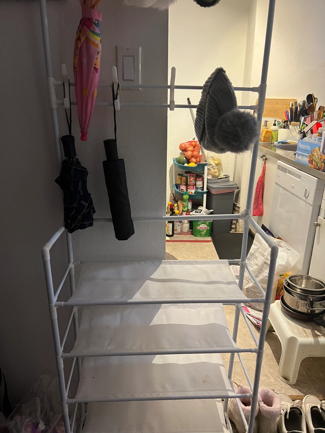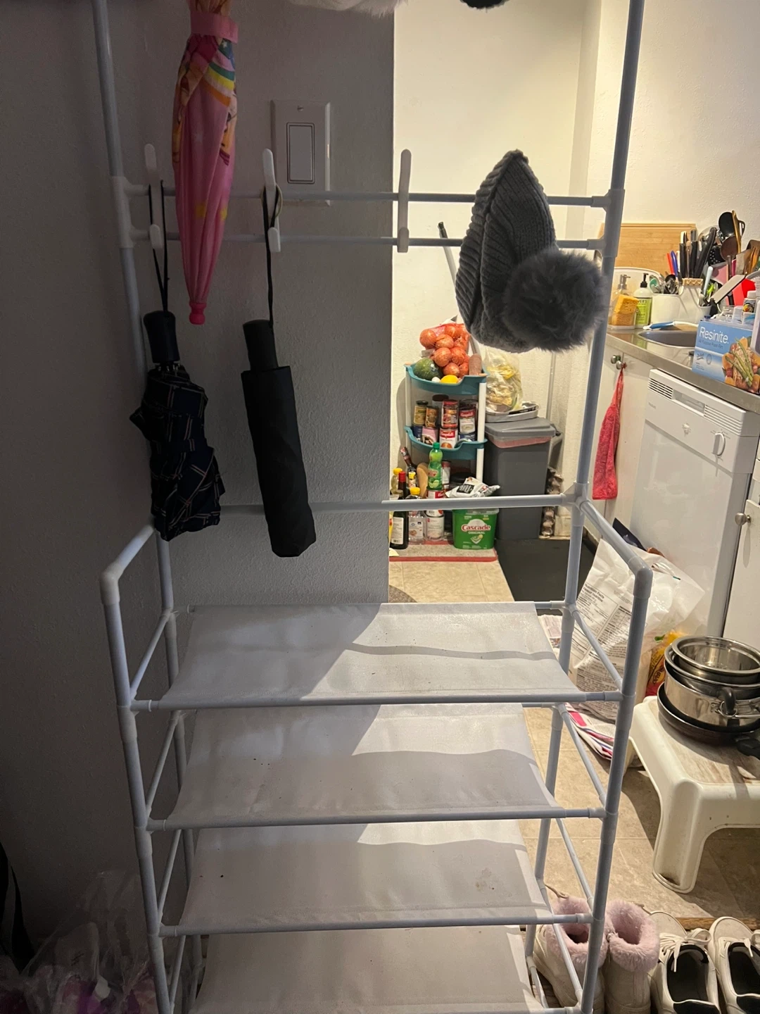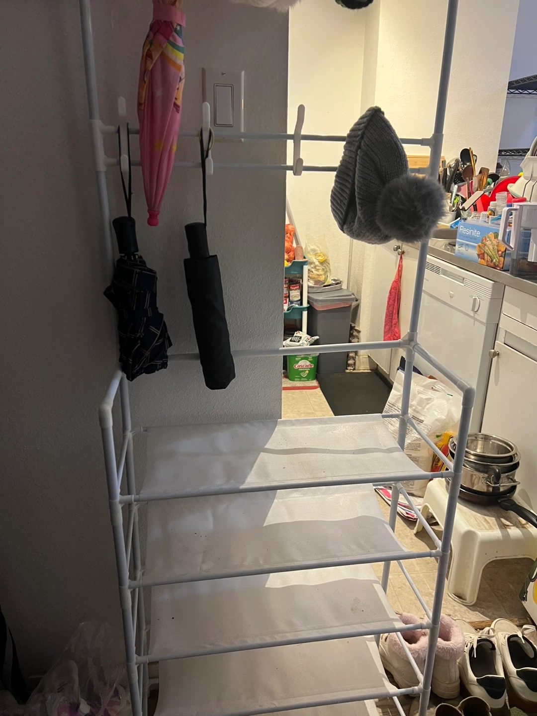 This is a white metal shelving unit with multiple tiers and hanging hooks. It's great for organizing umbrellas, hats, shoes, and other small items. The unit is lightweight and easy to assemble.