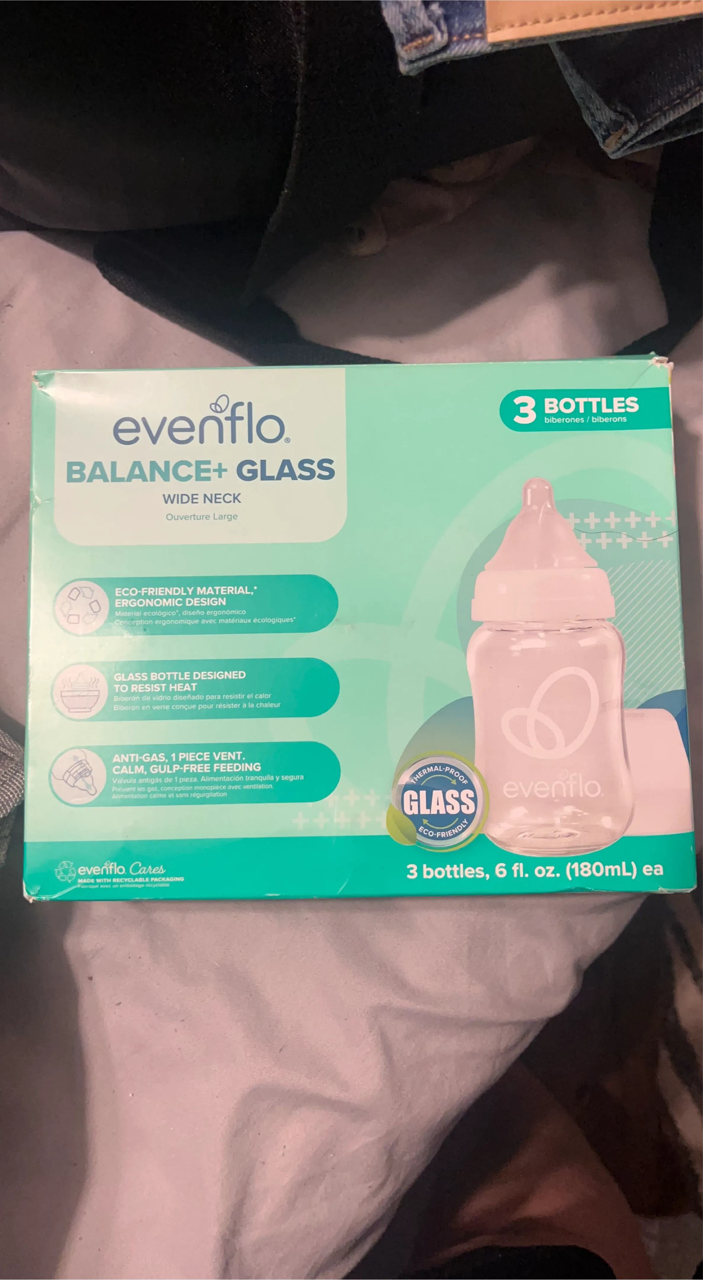 This is a 3-pack of Evenflo Balance+ Glass Wide Neck baby bottles. Each bottle is 6 fl. oz. (180mL) and features an anti-gas, one-piece vent system for calm feeding. The bottles are made of glass and designed to resist heat.