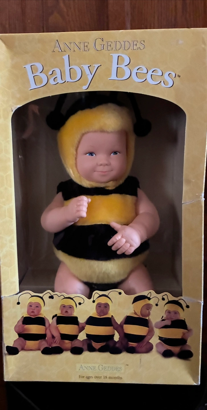 Selling an Anne Geddes Baby Bees doll. It's in excellent condition and comes in the original box! This adorable doll is dressed in a bee costume and is recommended for ages over 18 months. Perfect for collectors or as a cute addition to a nursery