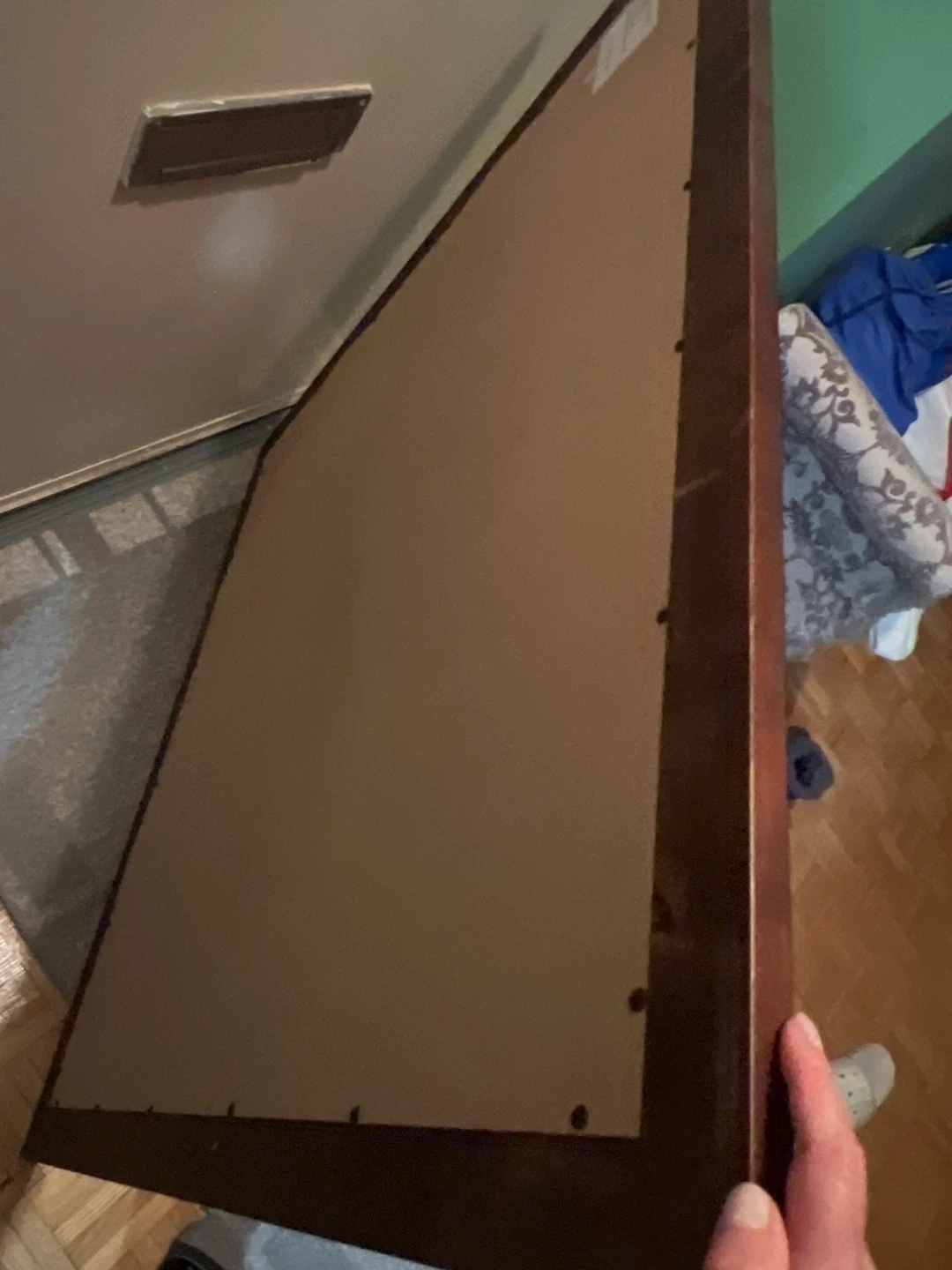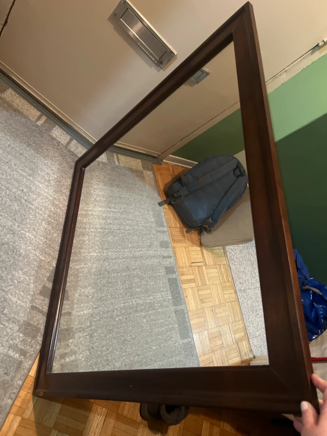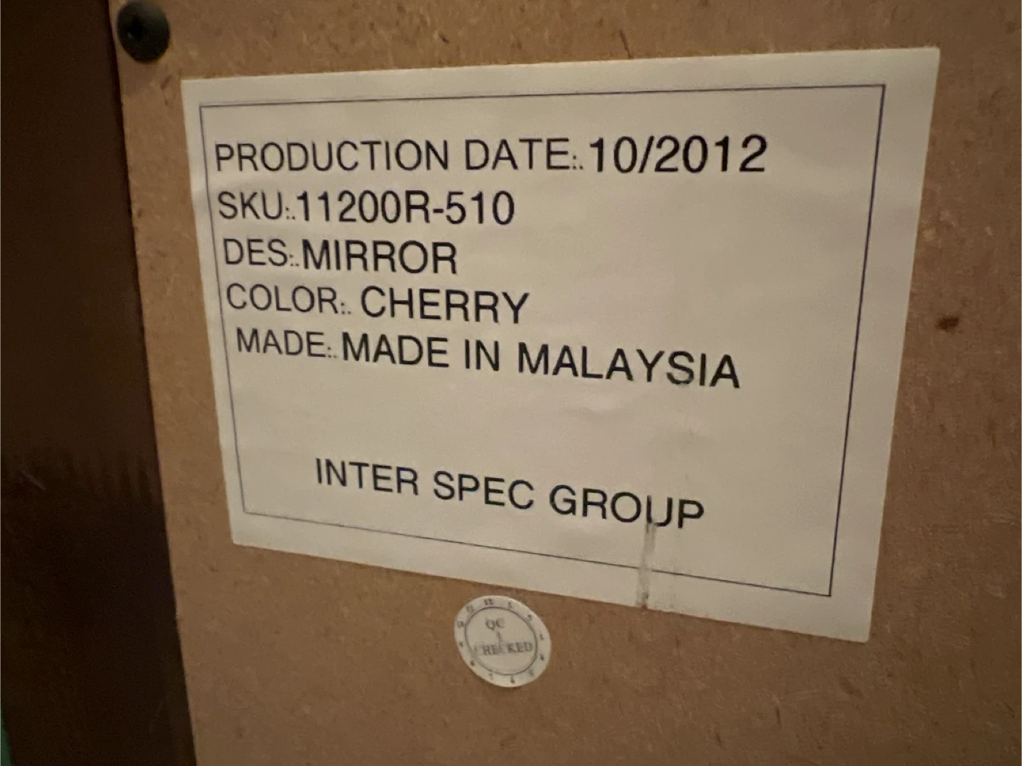 This is a cherry wood framed mirror. It was made in Malaysia. The production date is October 2012. It's great for a bedroom or hallway!