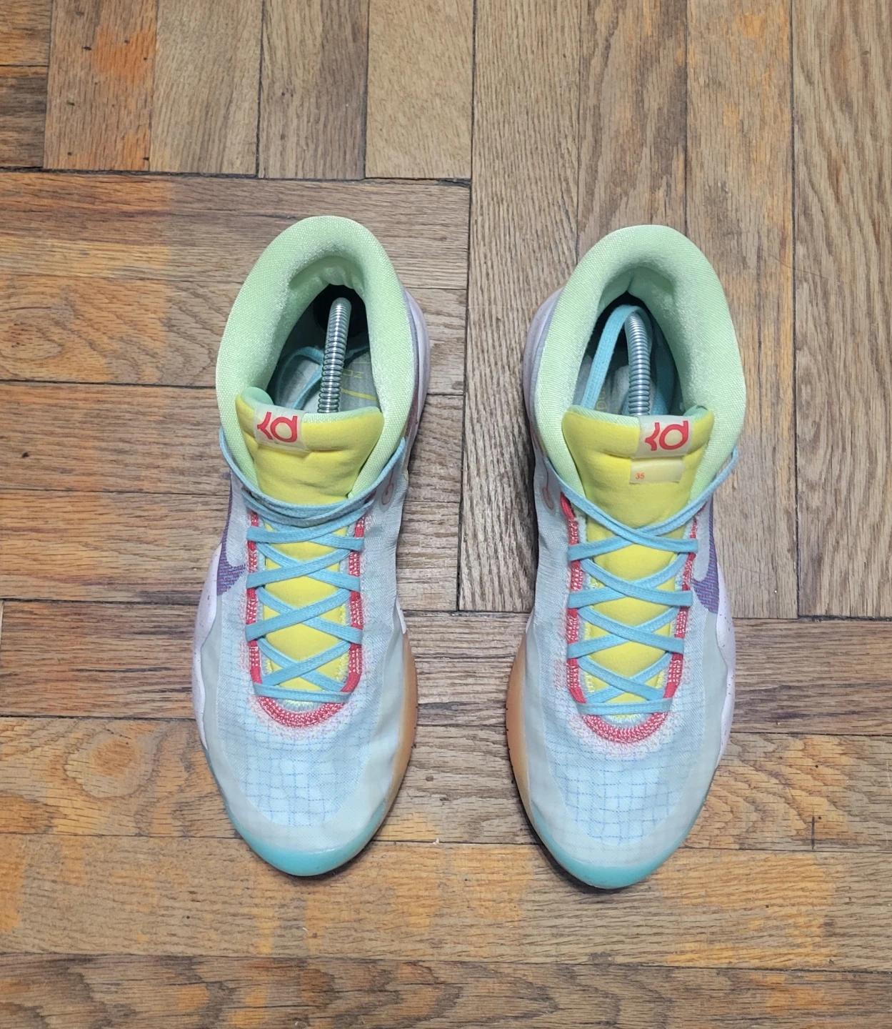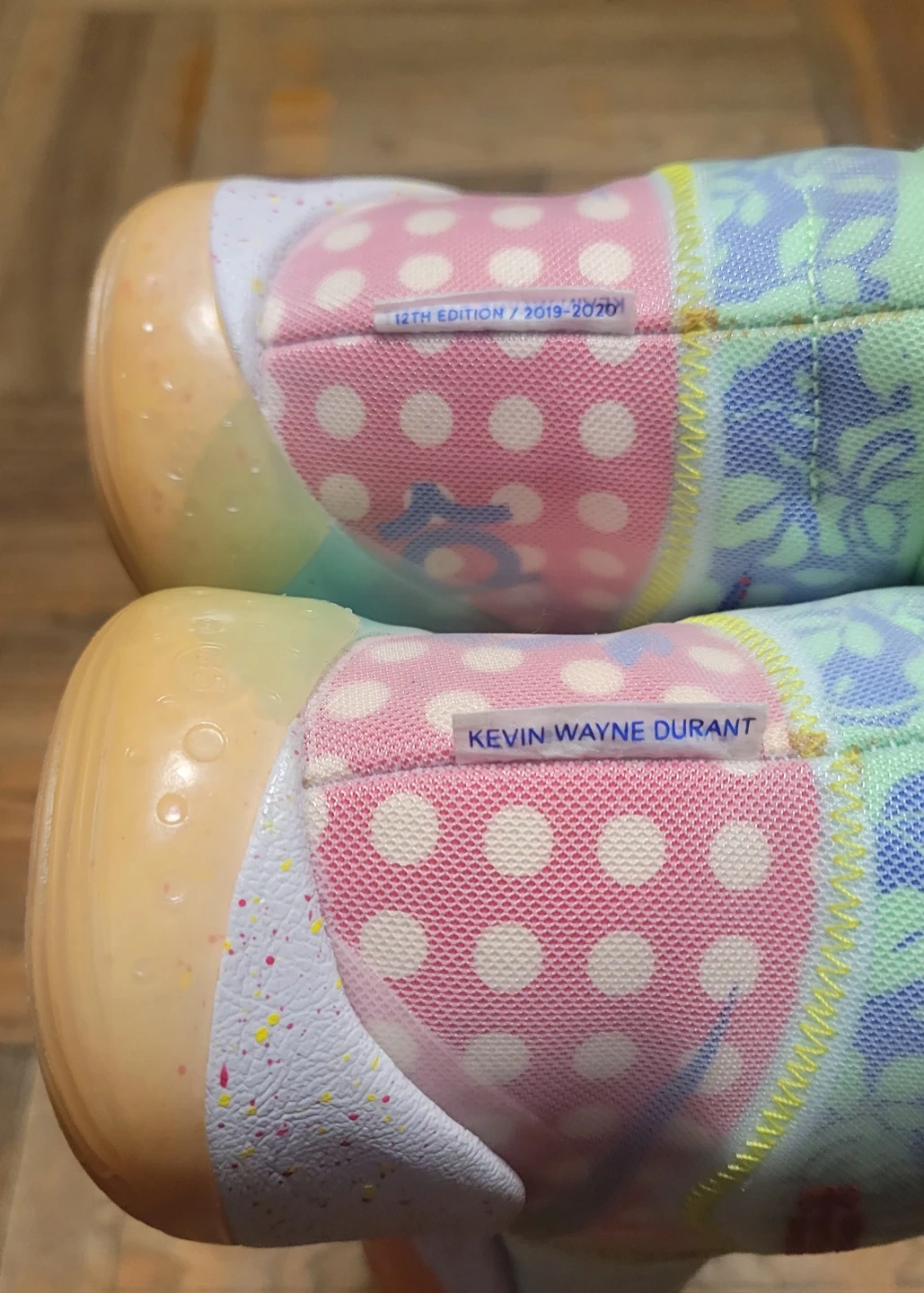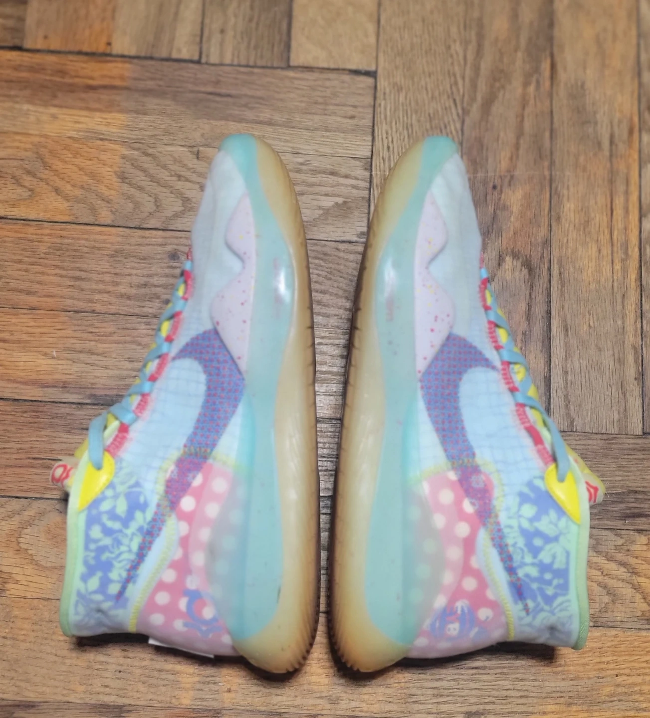 Nike KD 12 "12th Edition" basketball shoes. Featuring Kevin Wayne Durant's signature and a US size 9.5. These shoes are a multicolor patchwork design with a light blue and white base.