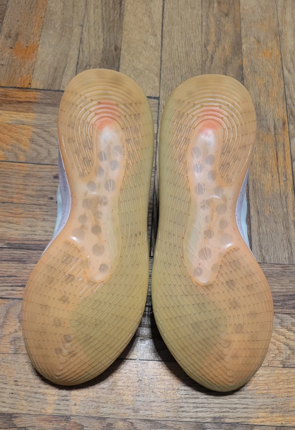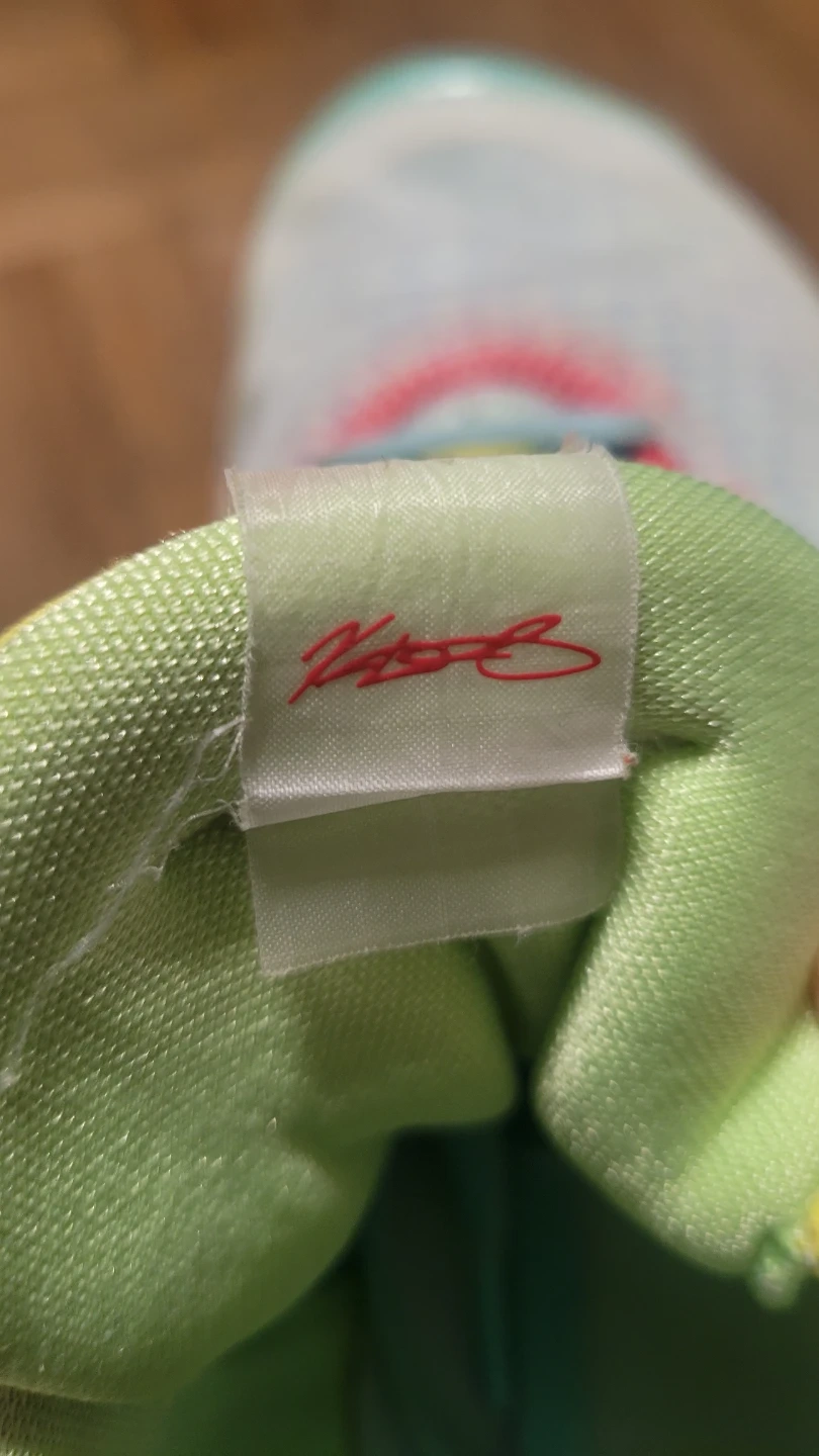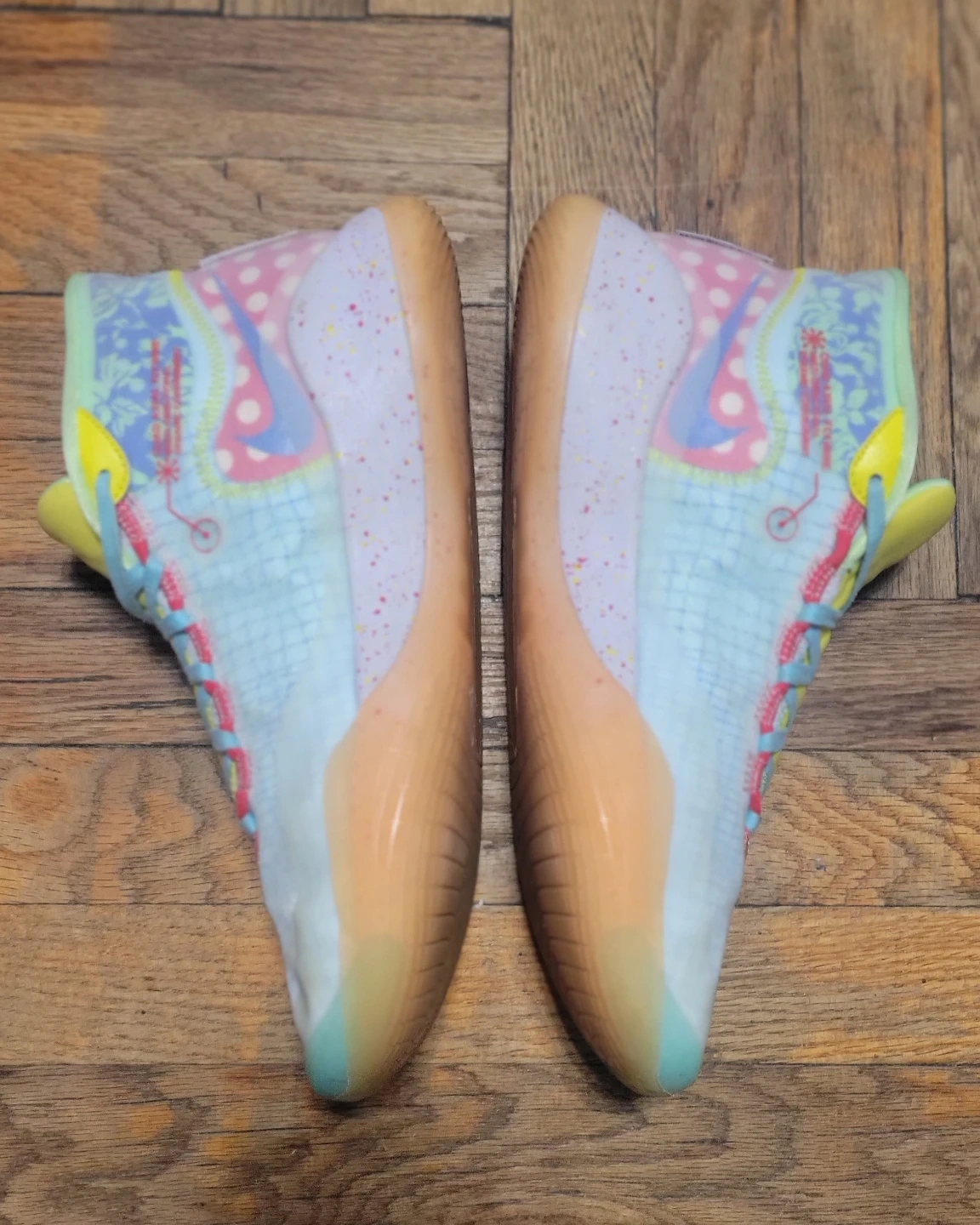 Nike KD 12 "12th Edition" basketball shoes. Featuring Kevin Wayne Durant's signature and a US size 9.5. These shoes are a multicolor patchwork design with a light blue and white base.