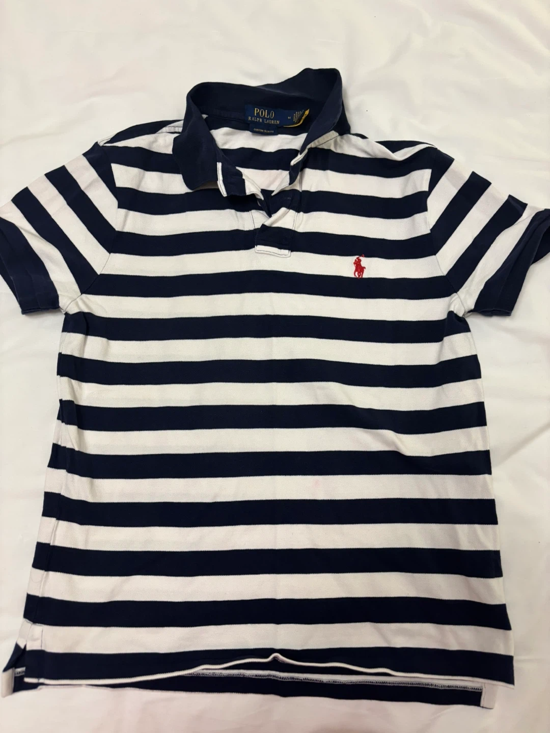 Classic Polo Ralph Lauren short-sleeve polo shirt in a navy and white stripe pattern. It's a size medium and features the signature embroidered red pony logo. Cotton material.