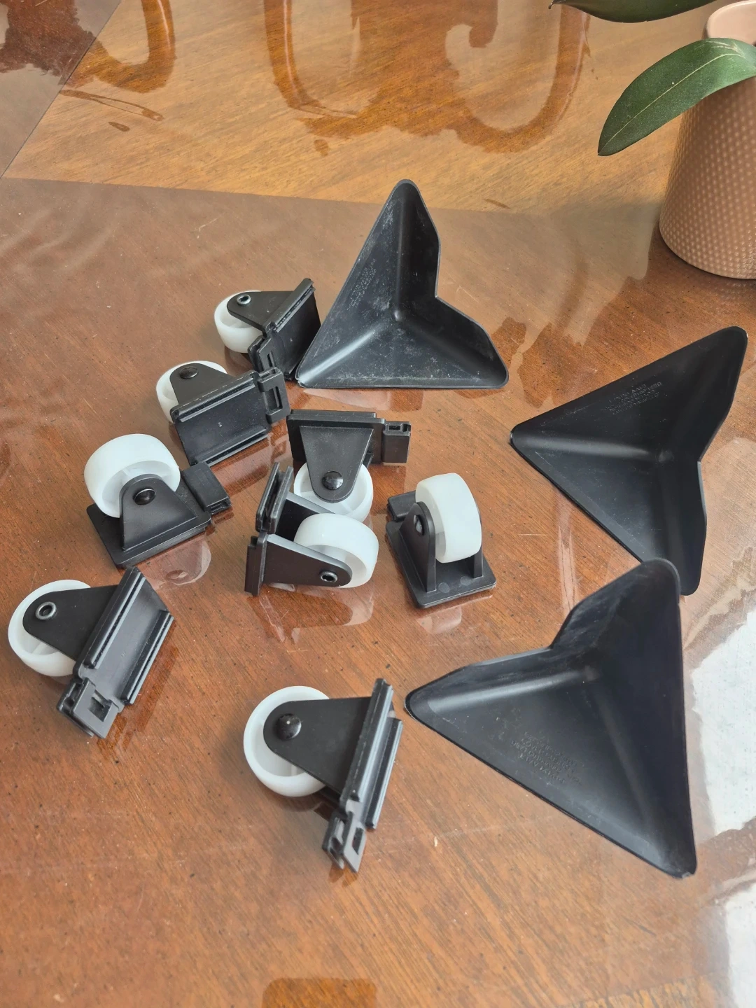 Set includes furniture sliders with wheels and black corner protectors. These are great for protecting furniture corners during moves or for easy rearrangement. Sliders make it simple to glide heavier items across the floor.
