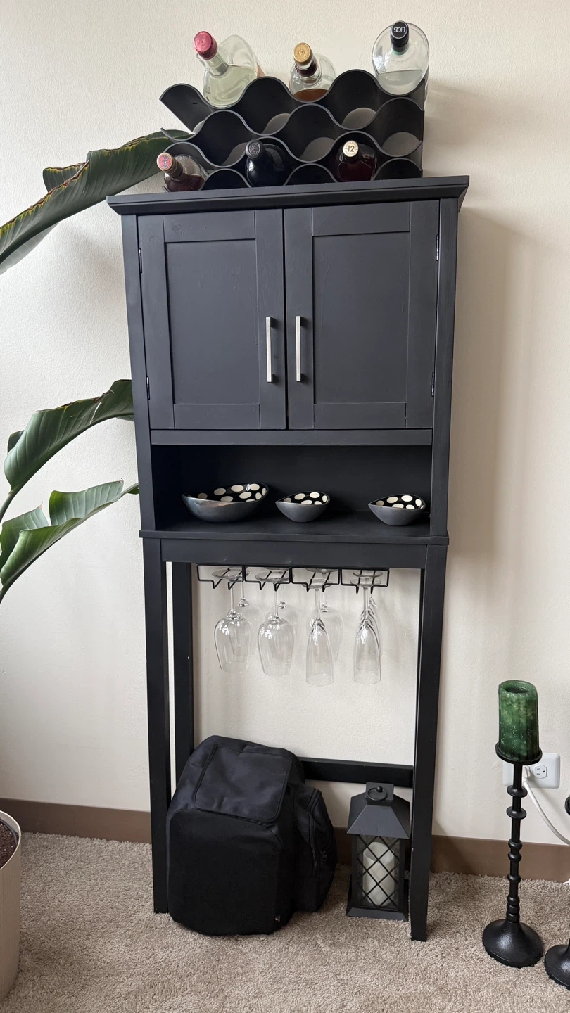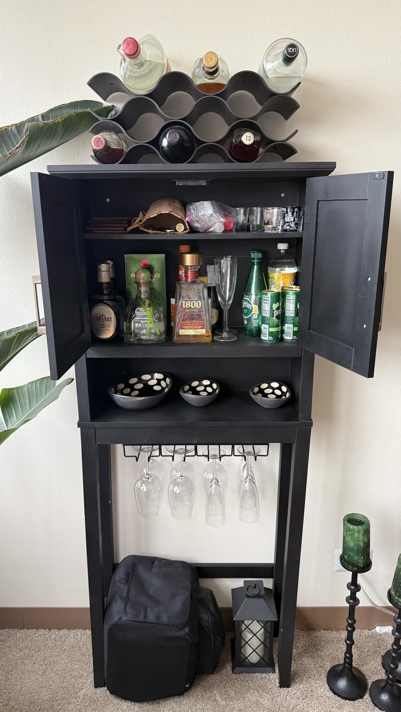 This black bar cabinet includes a top section with doors, a middle shelf with decorative bowls, and a bottom section with a wine glass rack. It's perfect for storing and displaying your favorite beverages and barware.