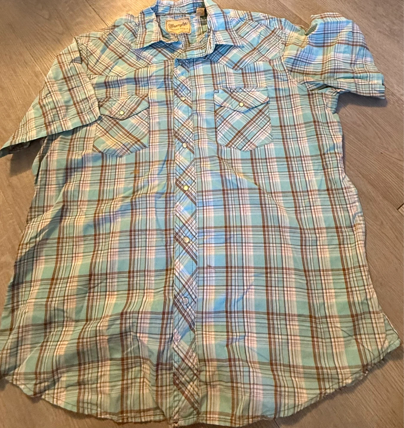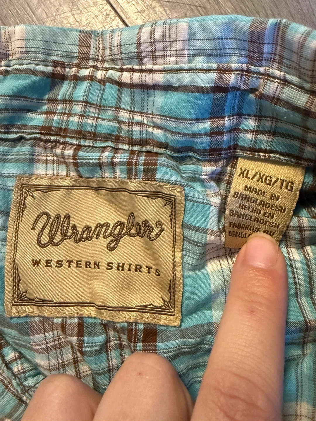 Wrangler short-sleeve western shirt in XL. It's a blue, brown, and white plaid pattern. Made in Bangladesh.
