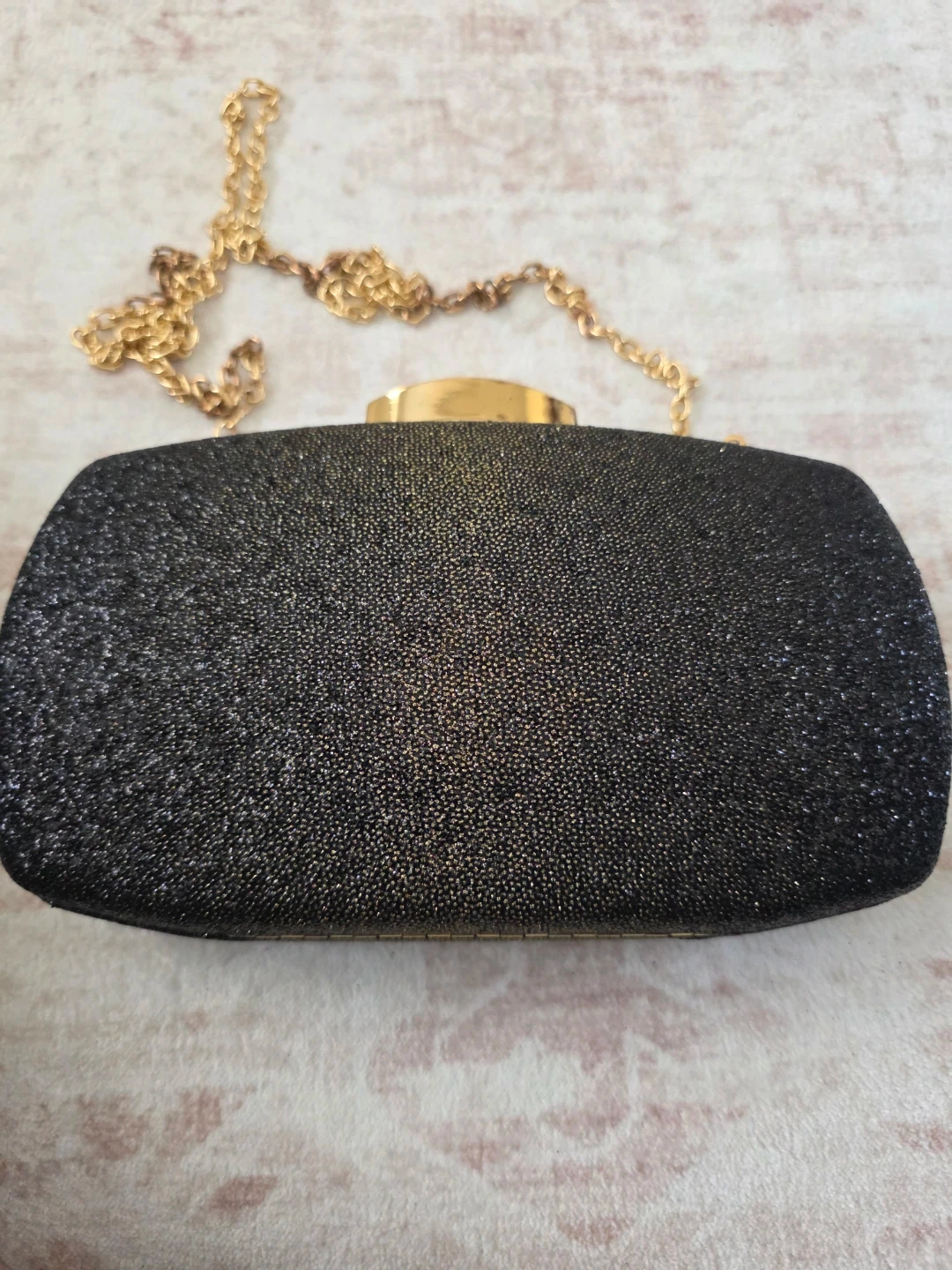 This black clutch has a sparkly texture with a gold chain strap. It's perfect for evening events. The clutch is made of fabric.