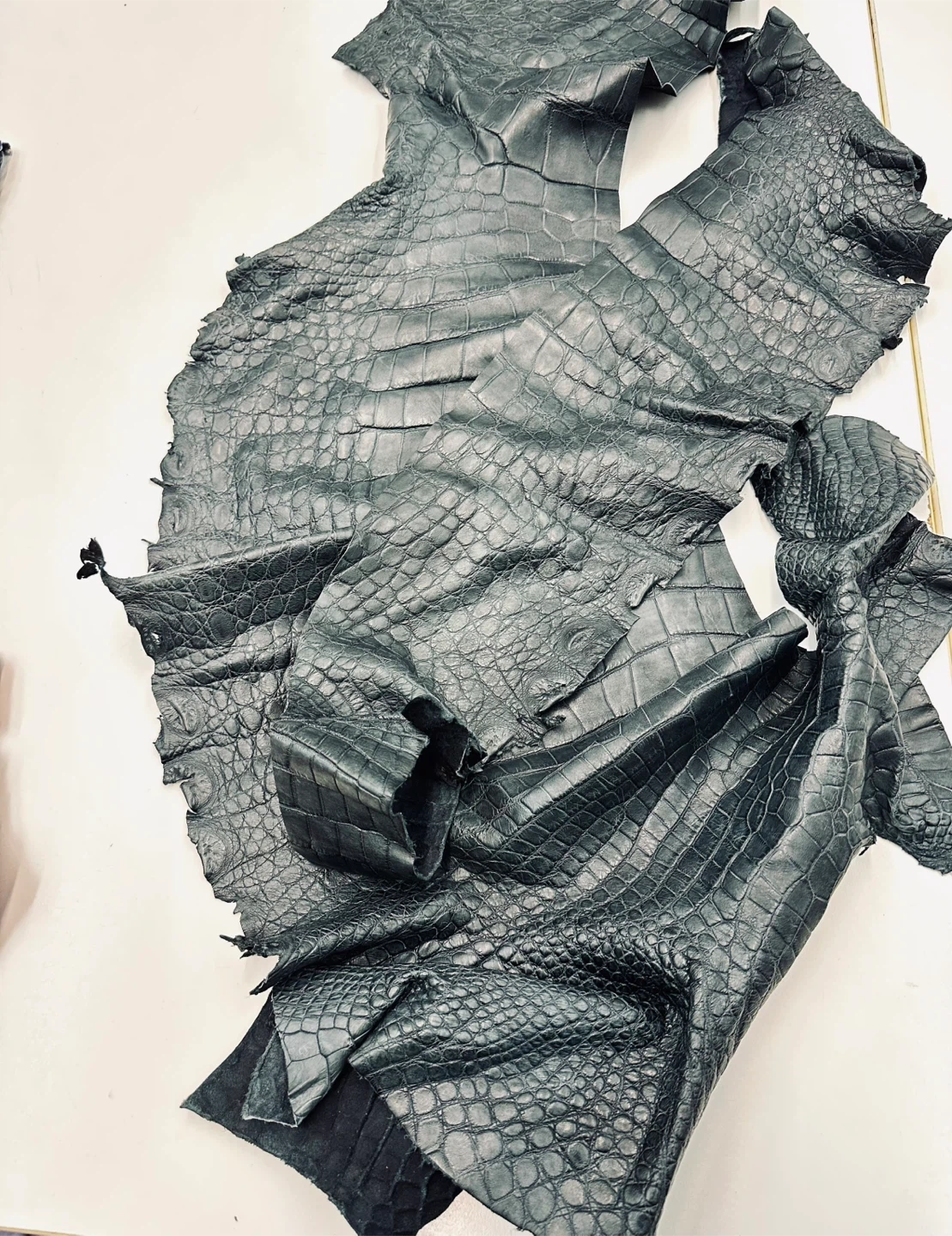 This is a genuine alligator leather hide. The color is a dark navy with a natural scaled texture. It's a versatile material for crafting projects. Half a big hide with part of belly.