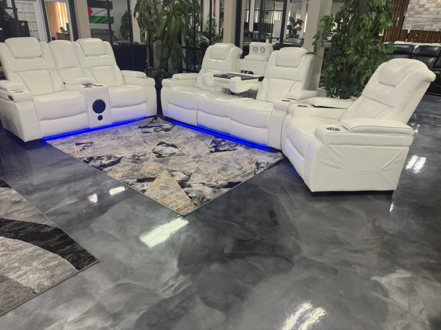 White leather sectional sofa with multiple reclining seats. Features LED accent lighting along the base and integrated cup holders. Power recliners offer adjustable comfort for a premium seating experience.