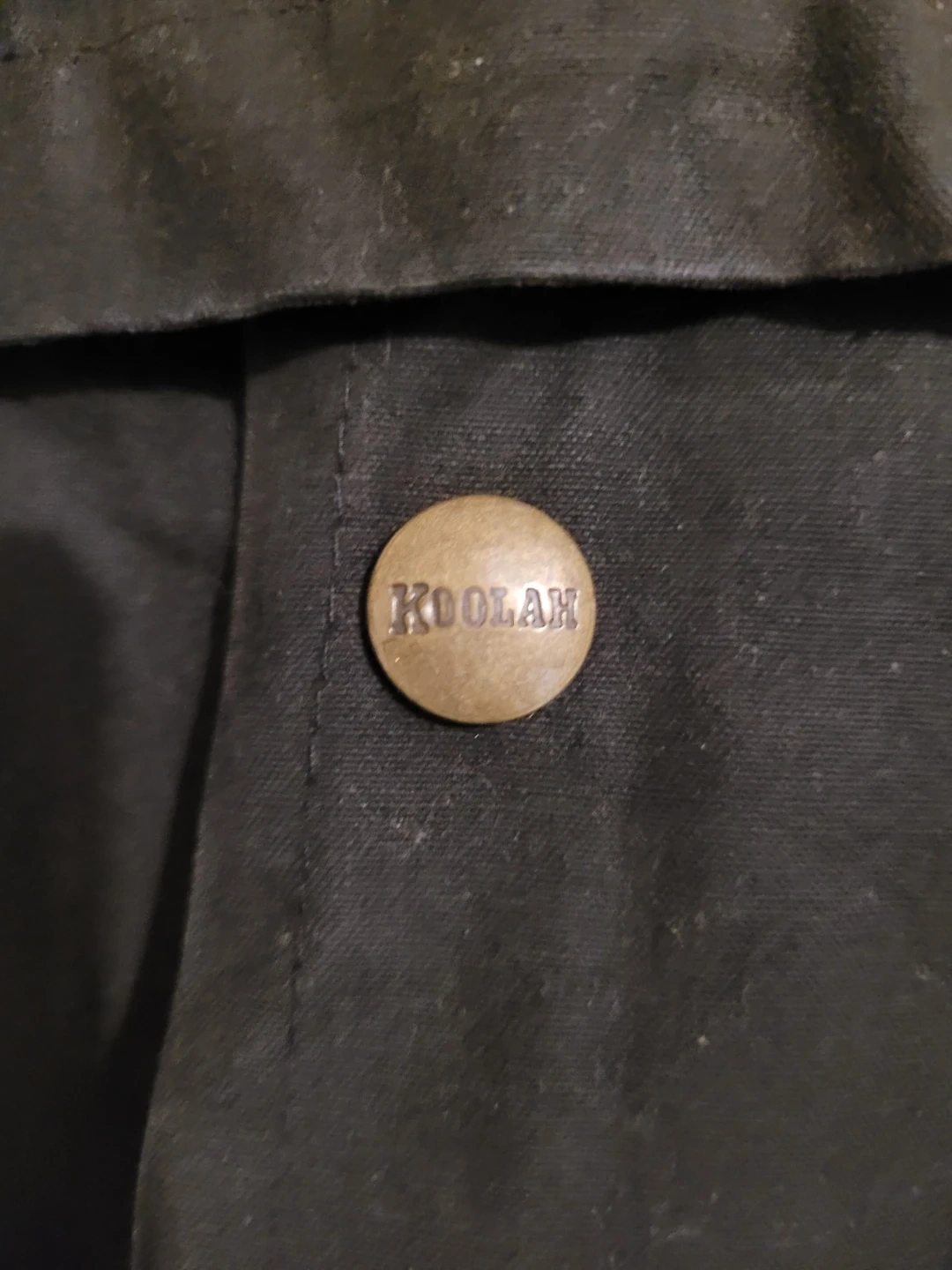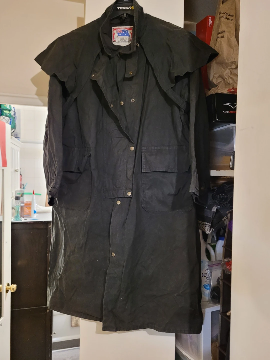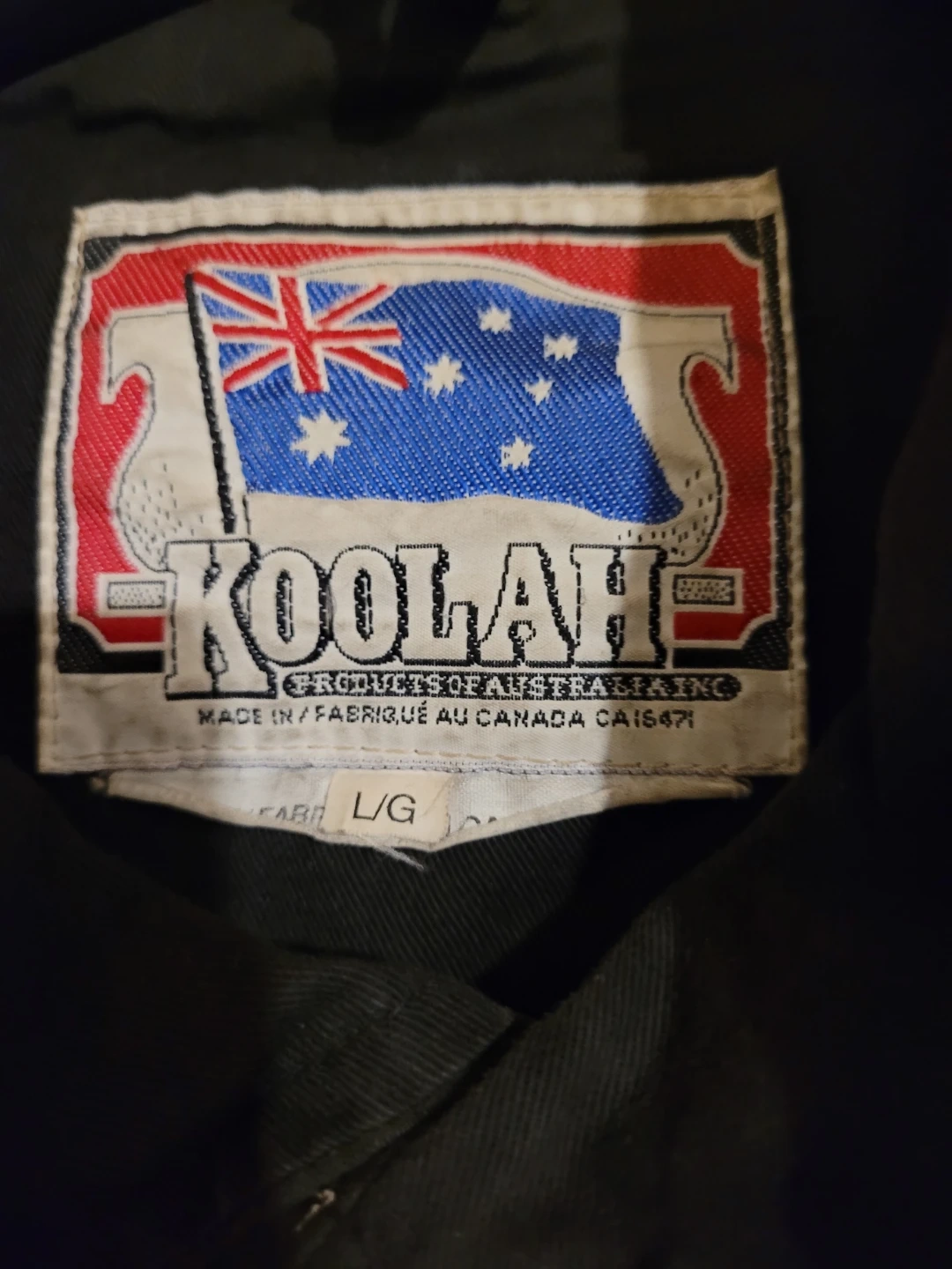 This is a black Koolah duster coat. It's a size L/G and made for protection from the elements. This coat is excellent for outdoor work or rugged use. Australia riding jacket. Size large.