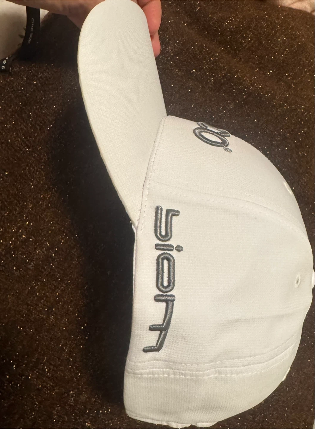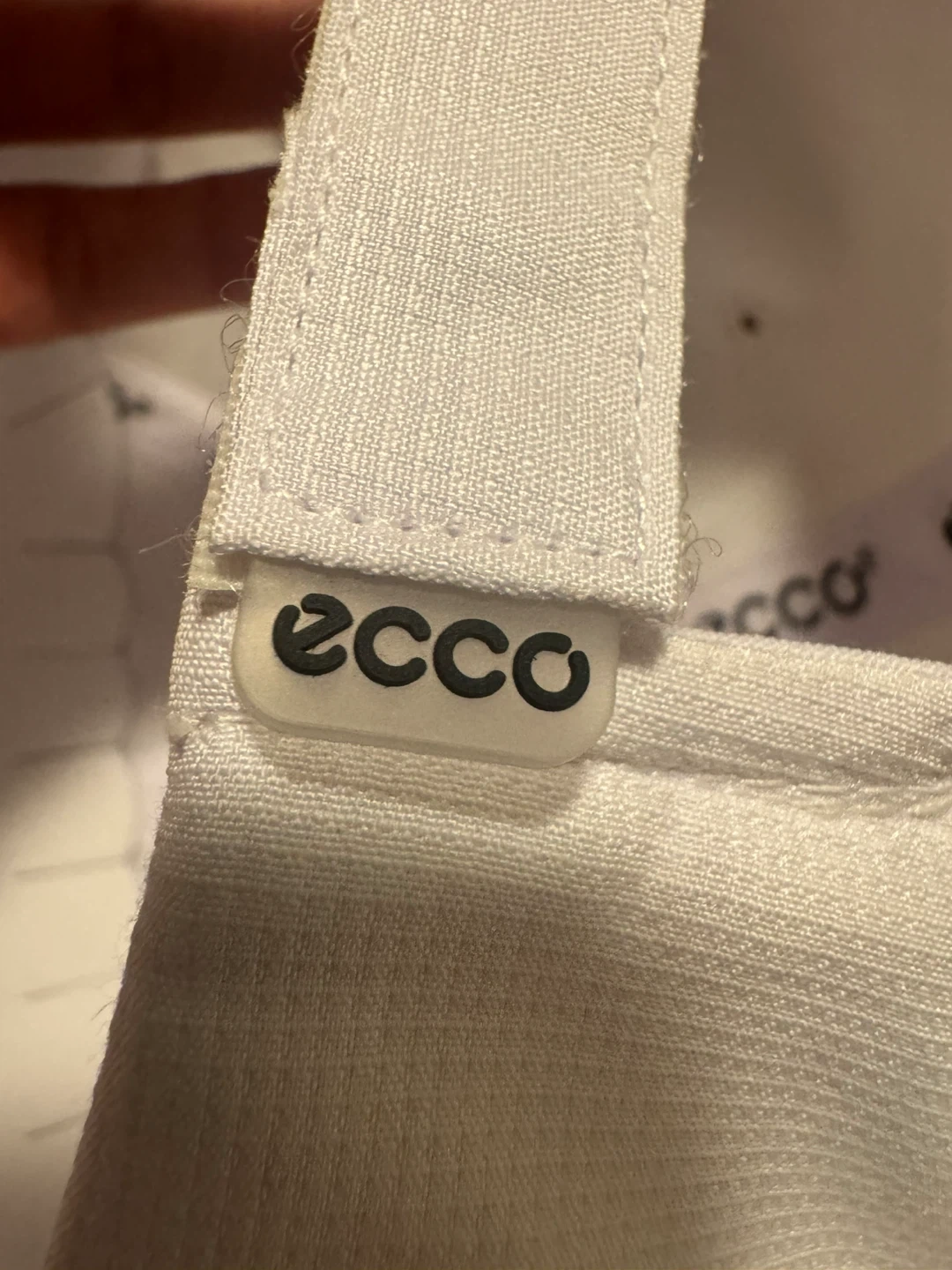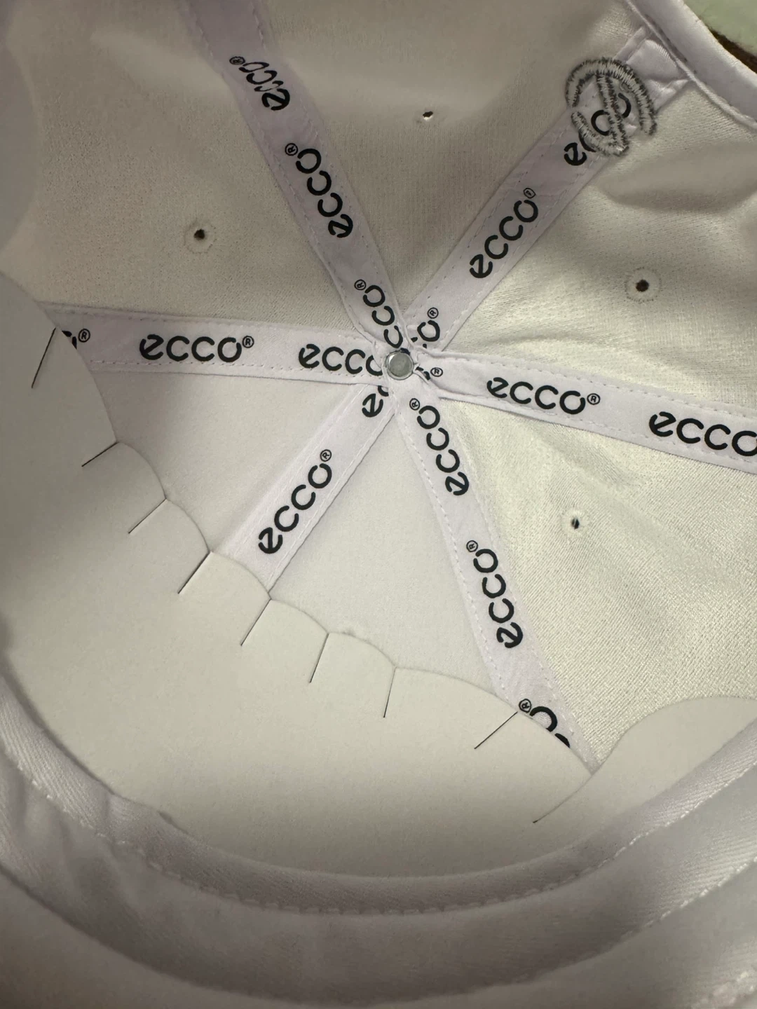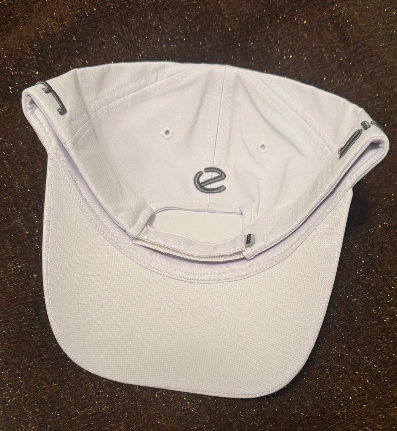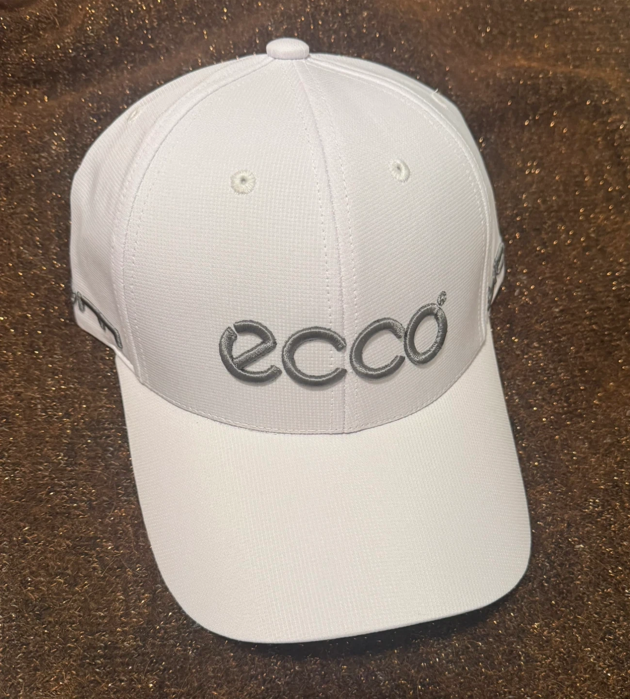 This is a white golf cap from Ecco. It's made of a breathable fabric, perfect for outdoor activities. The cap features the Ecco logo embroidered on the front, back and sides. It's adjustable size for a comfortable fit.