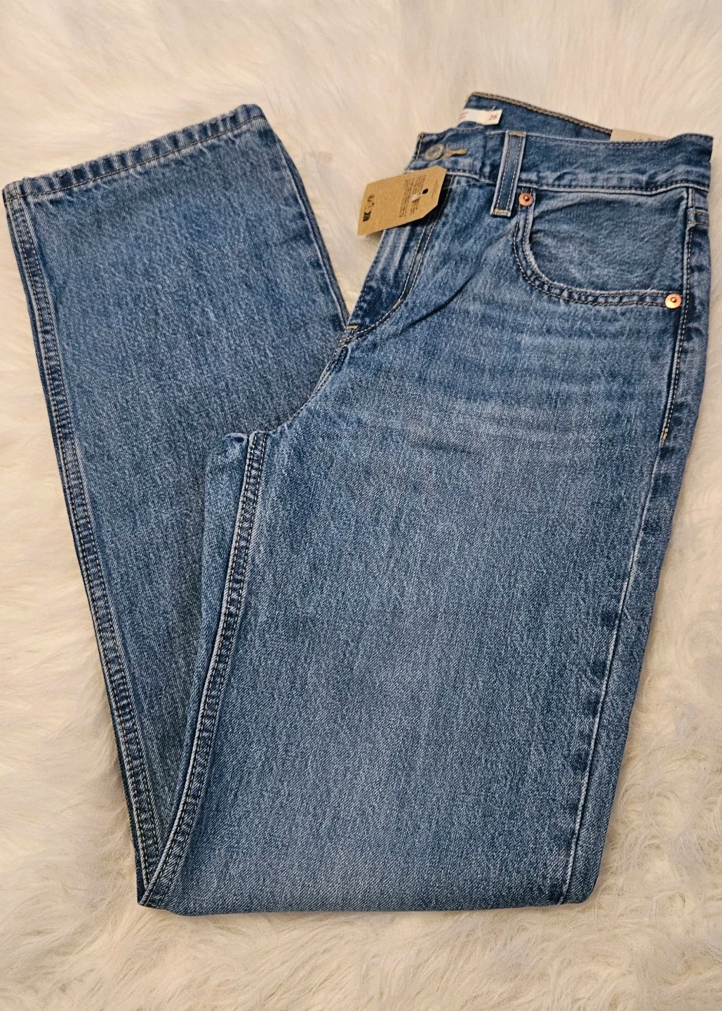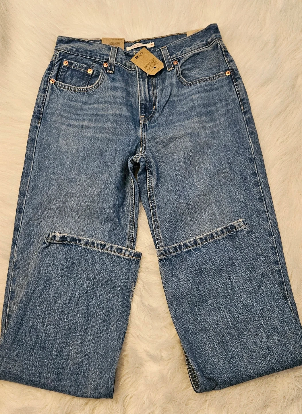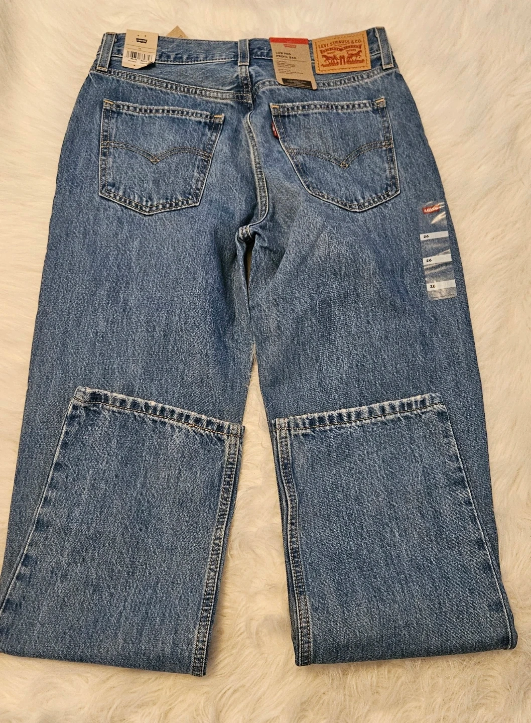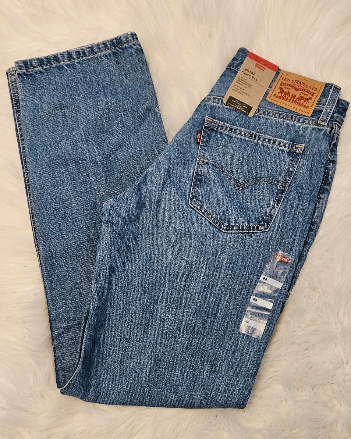 Brand new Levi's Low Pro Straight Jeans. Women's size 26. Classic blue denim construction. A mid-rise relaxed through the hip and thigh, Straight leg, 100% cotton.