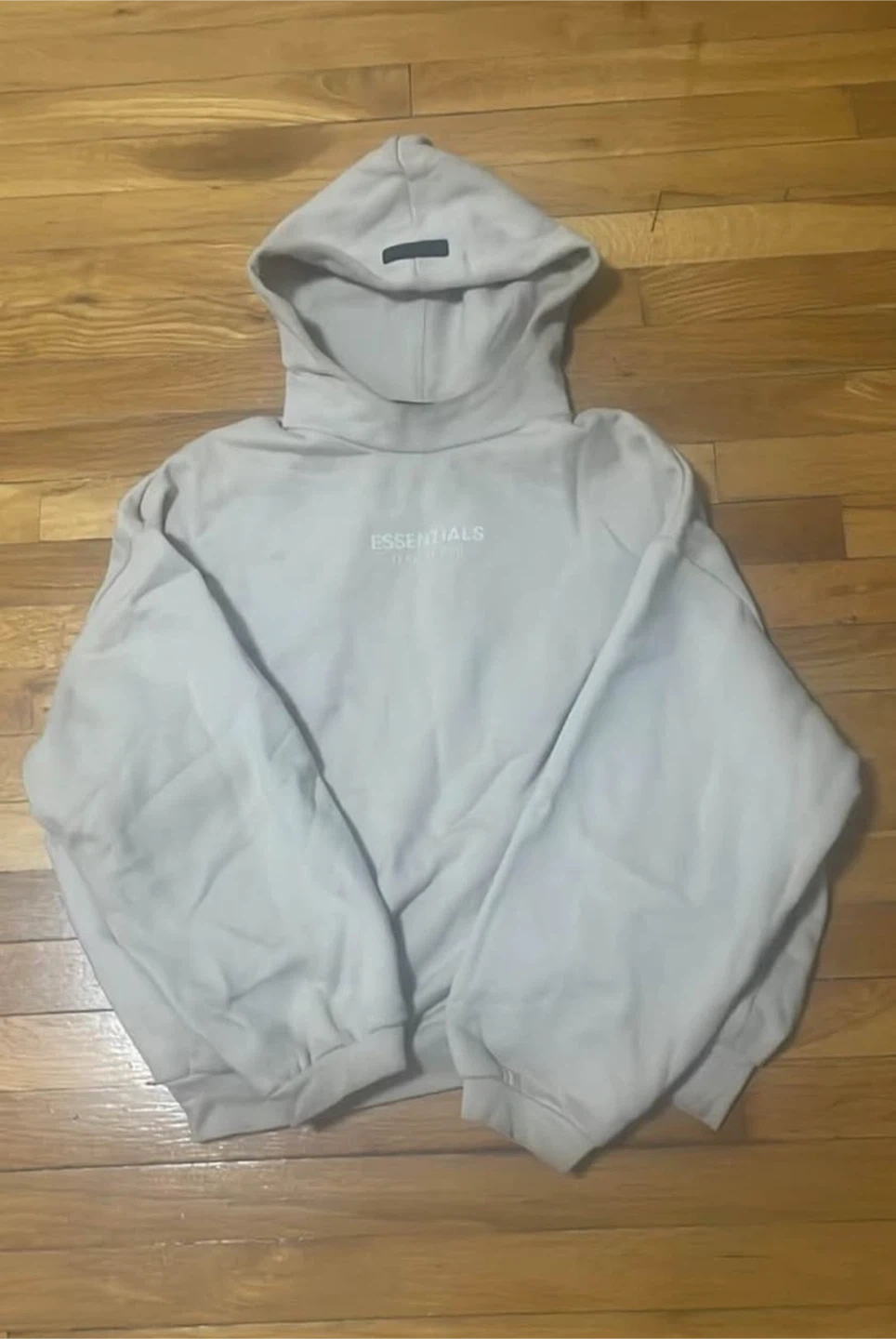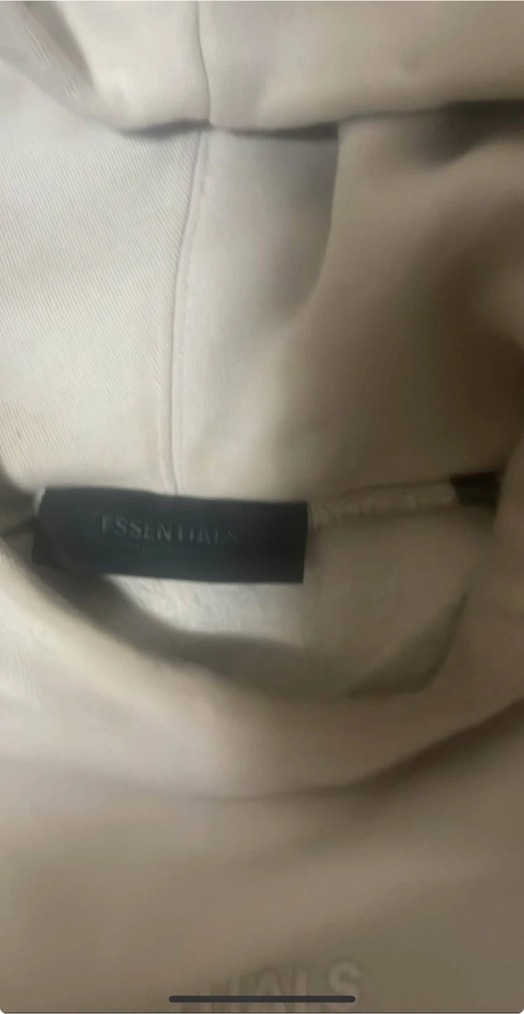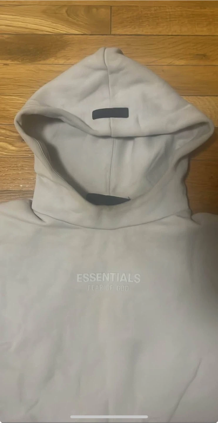 This is a Fear of God Essentials hoodie. It's made of 80% cotton and 20% polyester. Size is small.