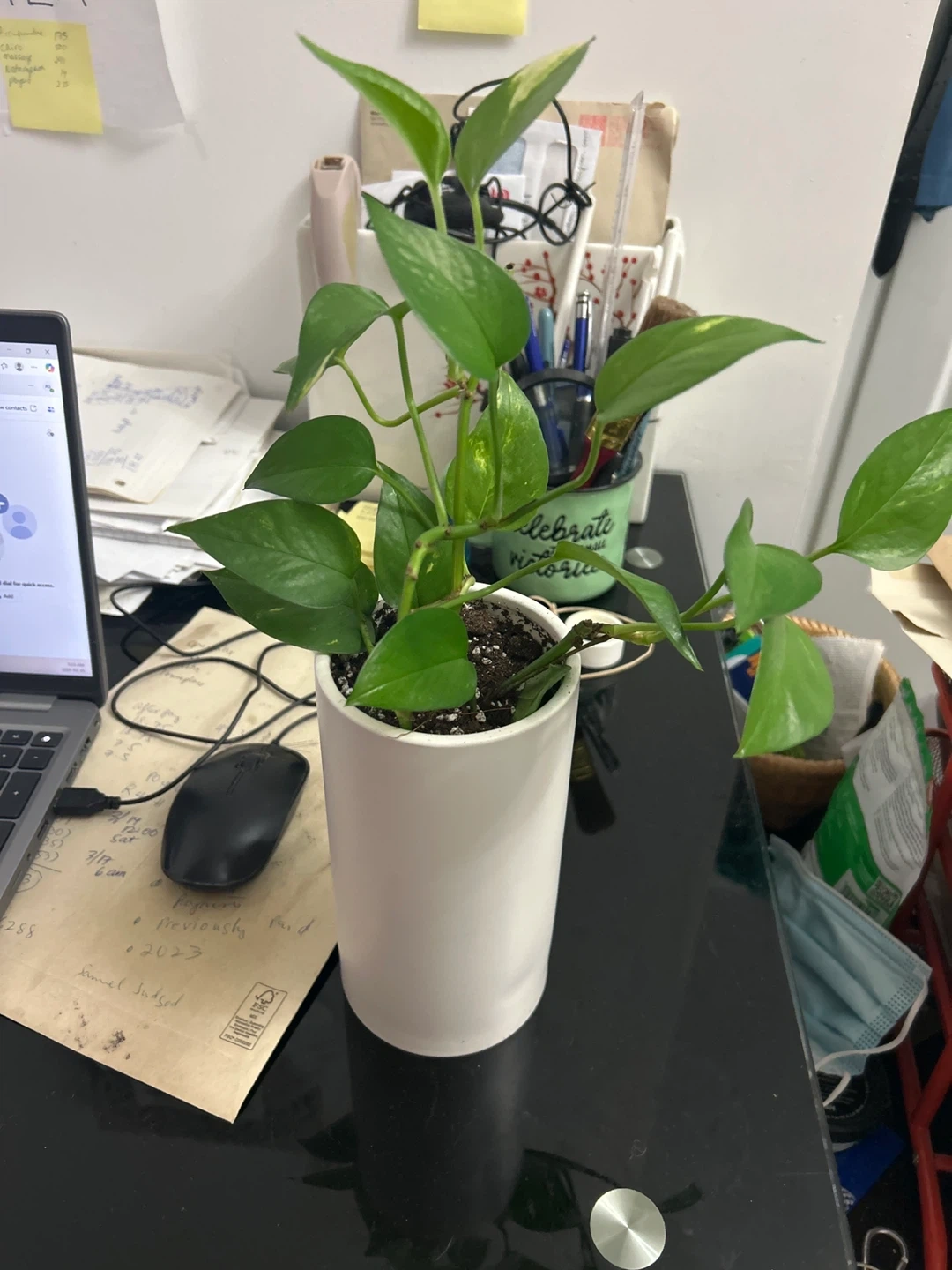 This is a healthy Pothos plant potted in a clean white ceramic container. It's known for its easy care and air-purifying qualities. It's a lovely addition for any home or office space.
