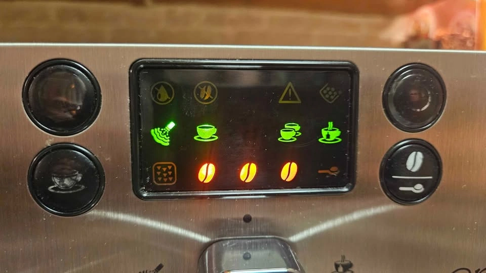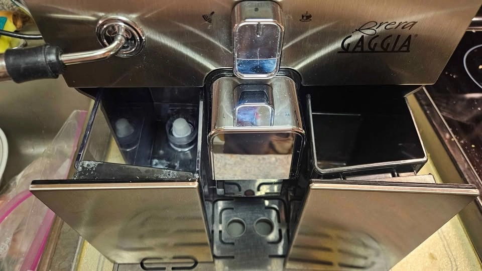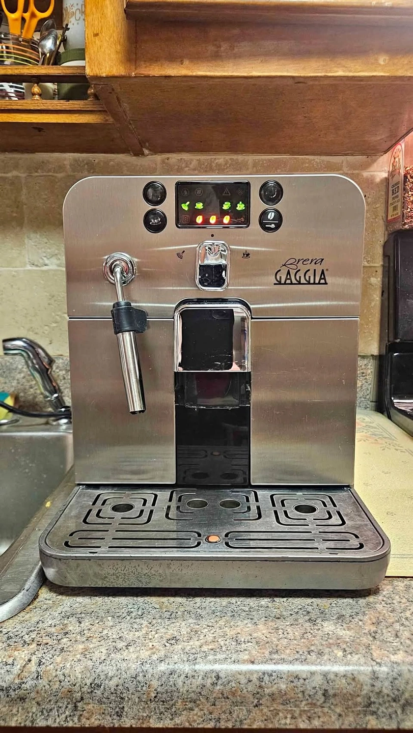 65This Gaggia Brera Espresso Machine has been used as you can see by the work buttons. Besides that it's in perfect condition. I cleaned the grinder out myself and got rid of any pad residue. While you can find this online, the top right button is power, top left is a single shot and bottom left a double shot. Use whole beans (for best quality) or ground espresso that can be dumped into the shot found on top by the grinder. It was hard to get a photo of the steam wand but I did my best to capture it working. Keep water in the dispenser, beans in the basket/grinder area and you're all set. Clean as needed and it should last for years to come. Approximately 12" Tall, 12.5" Deep, and 10" Wide. This all silver model goes for $560 on Amazon.