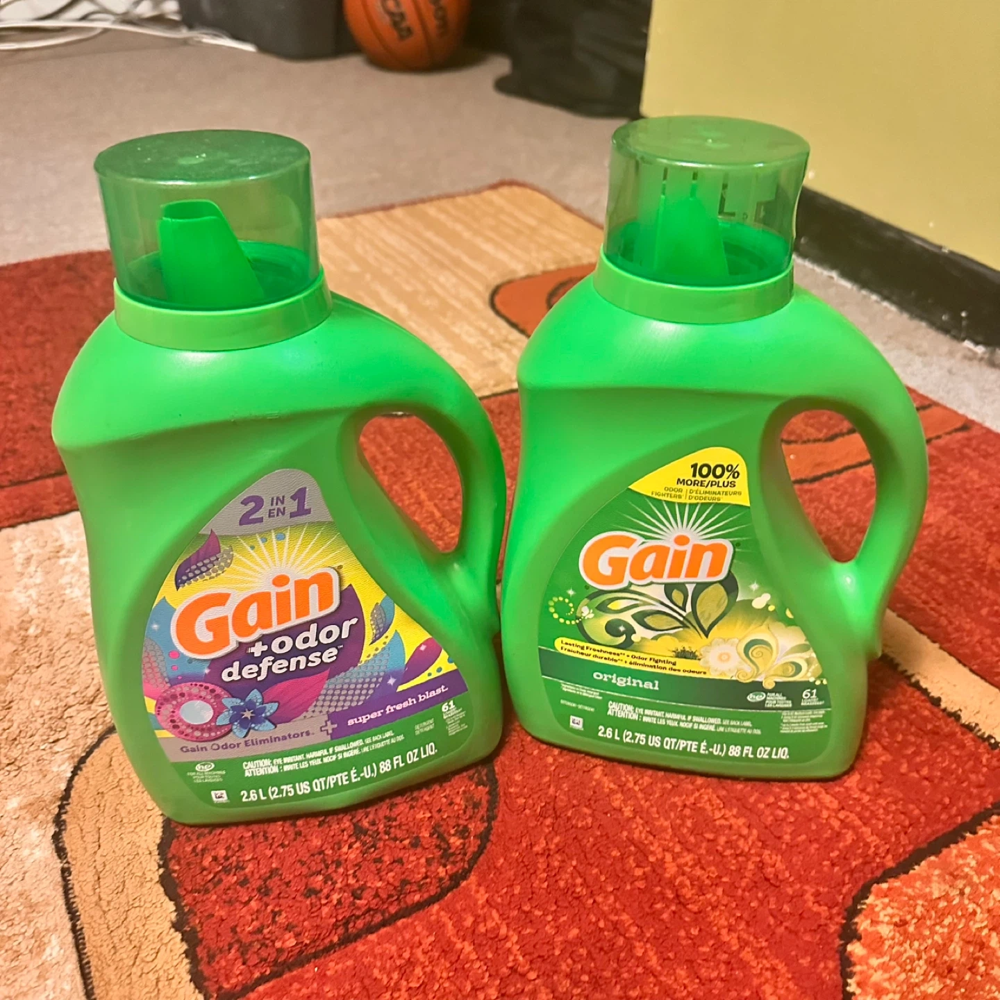 12Selling two bottles of Gain laundry detergent. One is Gain + Odor Defense and the other is Gain Original. Each bottle contains 88 fl oz (2.6 L/2.75 US QT).