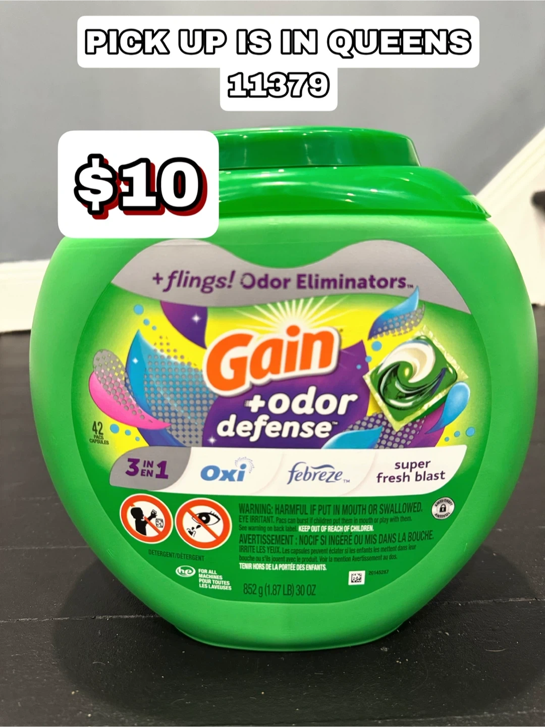 Selling a container of Gain +Odor Defense laundry pods. It has 42 pacs/capsules. These are 3-in-1 with Oxi and Febreze for a super fresh blast! Net weight is 852 g (1.87 LB) 30 OZ