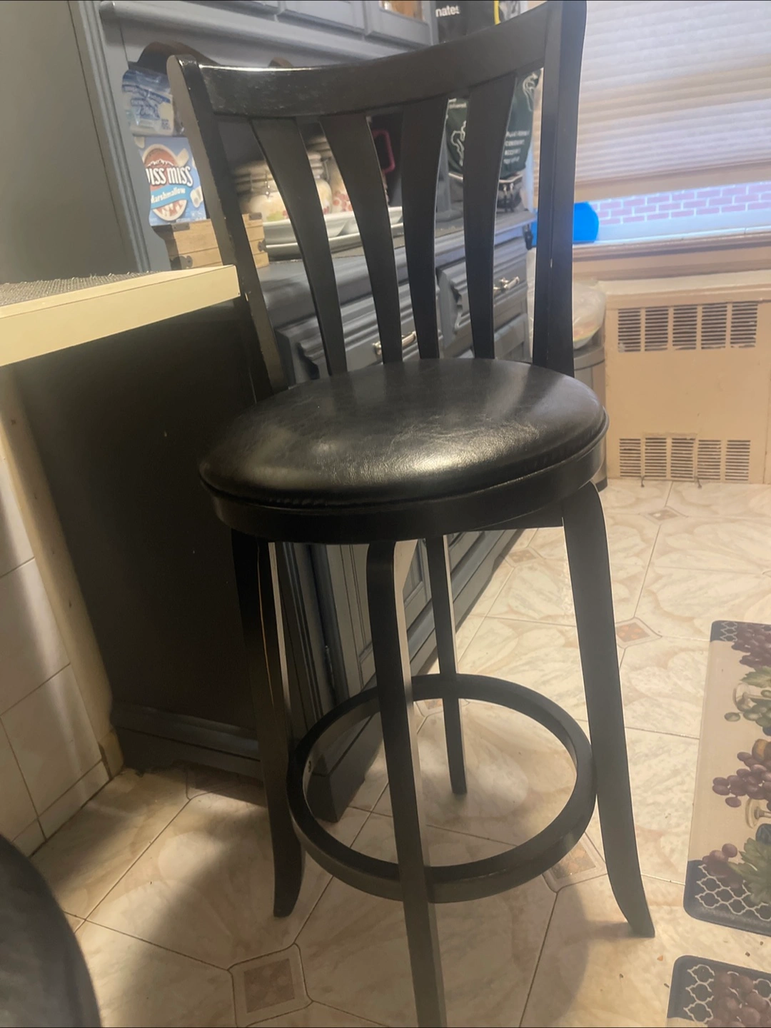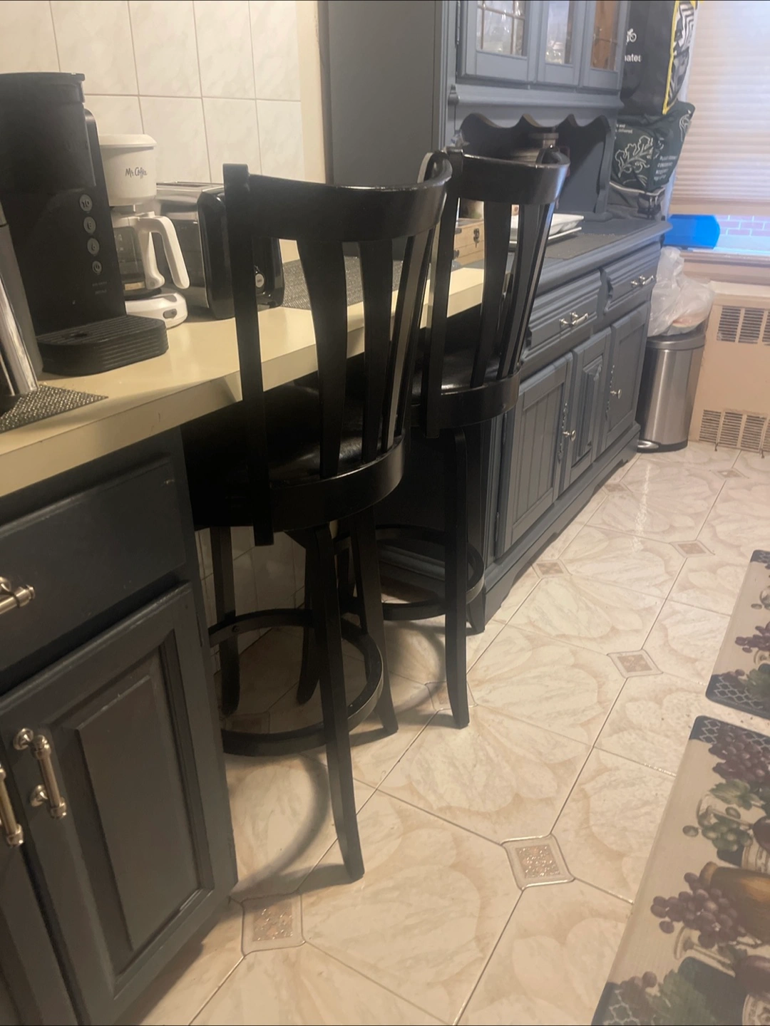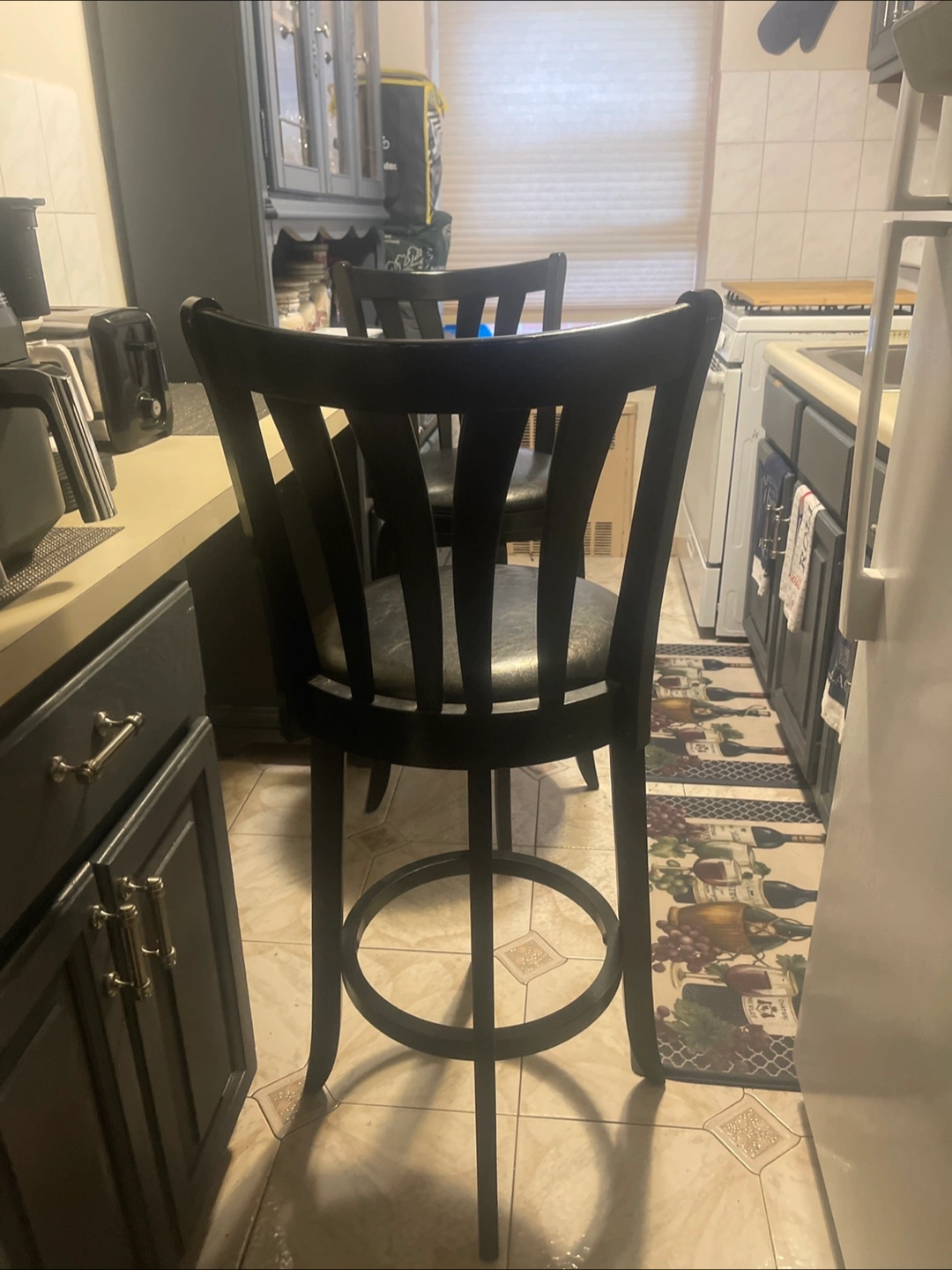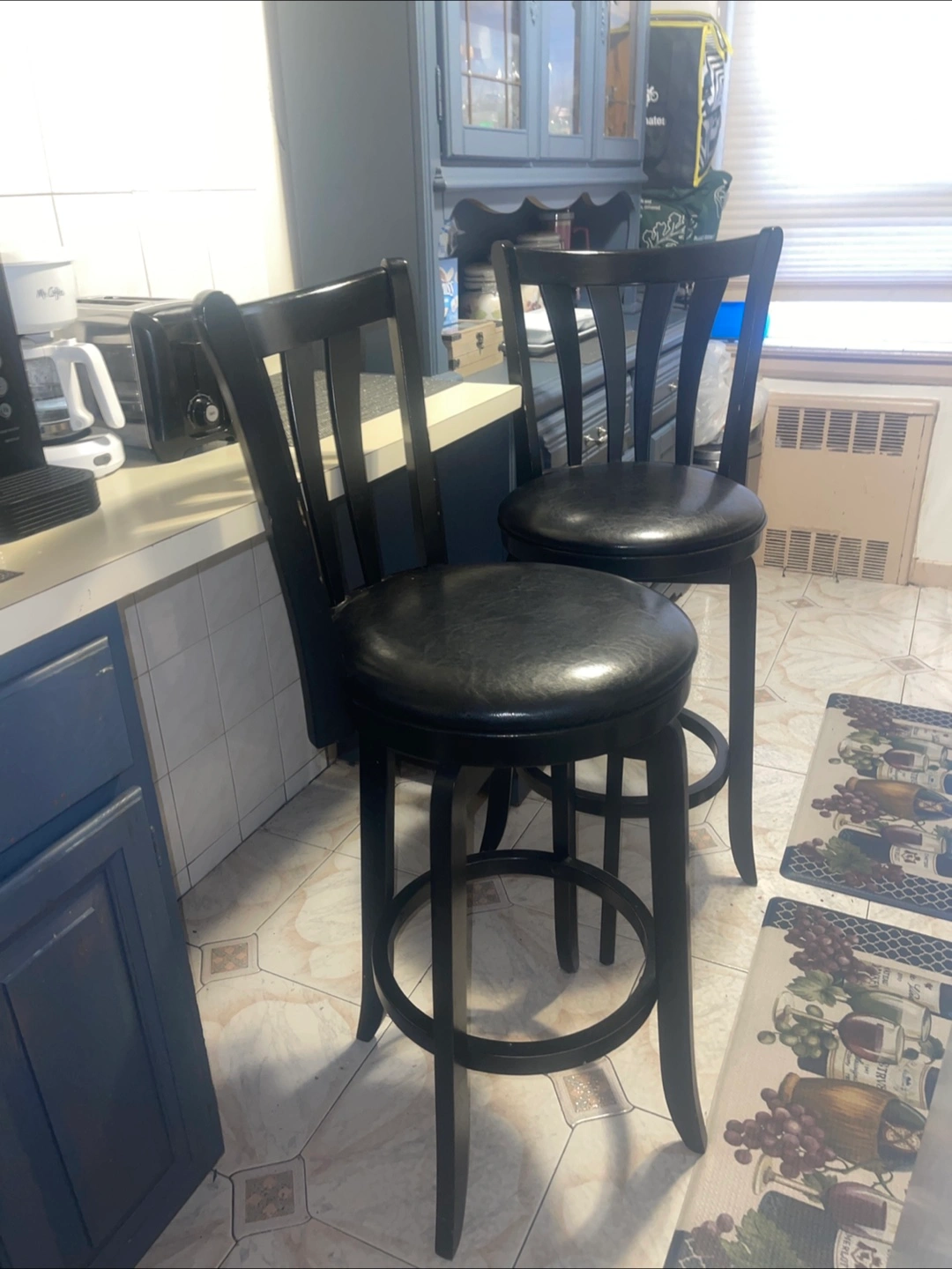 Set of Bar stools, black with a padded seat. Features a swirling seats and backrest. A comfortable place to sit and reflect on your day.